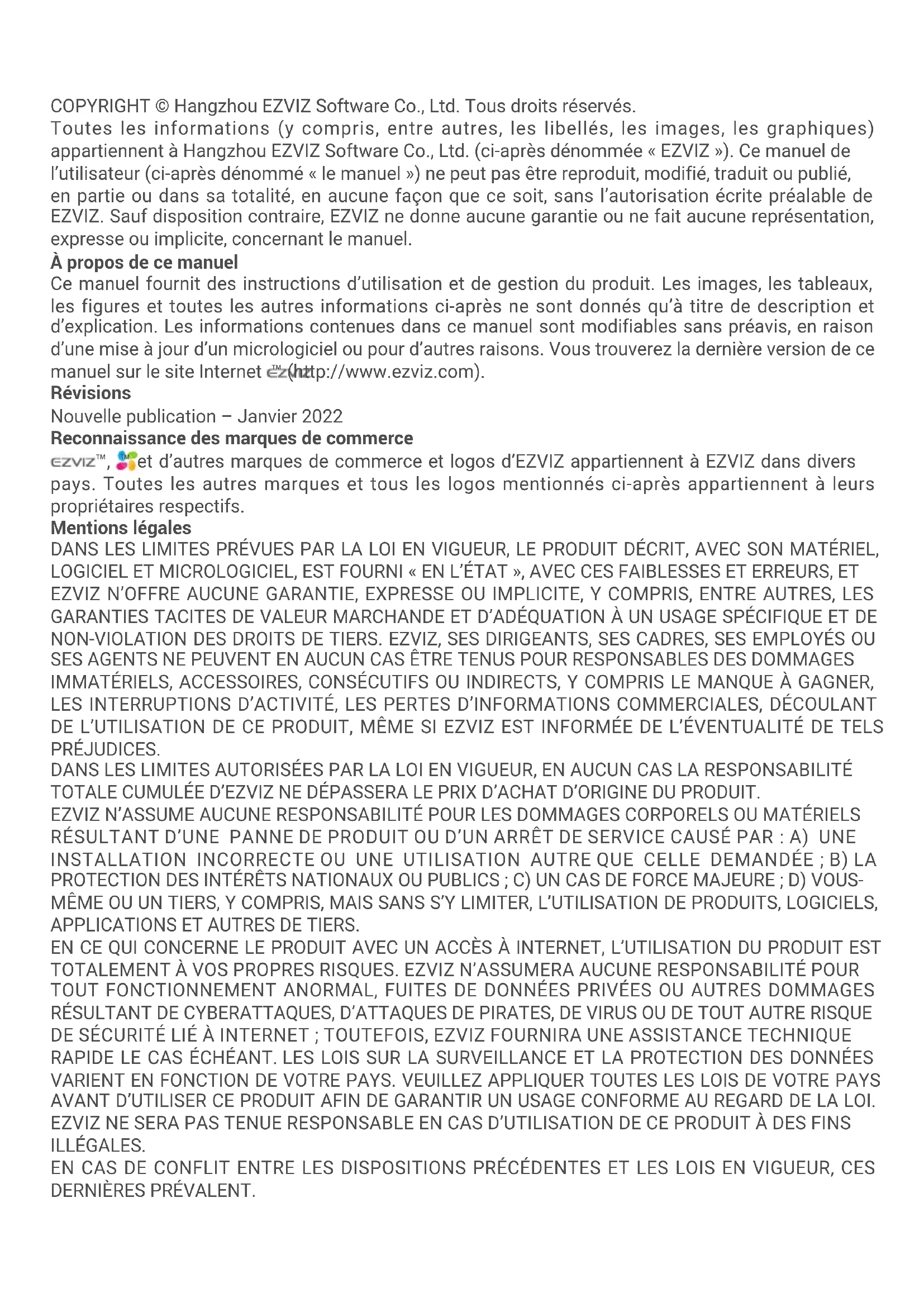 COPYRIGHT © Hangzhou EZVIZ Software Co., Ltd. Tous droits réservés. Toutes les informations (y compris, entre autres, les libellés, les images, les graphiques) appartiennent à Hangzhou EZVIZ Software Co., Ltd. (ci-après dénommée «EZVIZ»). Ce manuel de l’utilisateur (ci-après dénommé «le manuel») ne peut pas être reproduit, modifié, traduit ou publié, en partie ou dans sa totalité, en aucune façon que ce soit, sans l’autorisation écrite préalable de EZVIZ. Sauf disposition contraire, EZVIZ ne donne aucune garantie ou ne fait aucune représentation, expresse ou implicite, concernant le manuel. À propos de ce manuel Ce manuel fournit des instructions d’utilisation et de gestion du produit. Les images, les tableaux, les figures et toutes les autres informations ci-après ne sont donnés qu’à titre de description et d’explication. Les informations contenues dans ce manuel sont modifiables sans préavis, en raison d’une mise à jour d’un micrologiciel ou pour d’autres raisons. Vous trouverez la dernière version de ce manuel sur le site Internet ™ (http://www.ezviz.com). Révisions Nouvelle publication – Janvier2022 Reconnaissance des marques de commerce ™, ™ et d’autres marques de commerce et logos d’EZVIZ appartiennent à EZVIZ dans divers pays. Toutes les autres marques et tous les logos mentionnés ci-après appartiennent à leurs propriétaires respectifs. Mentions légales DANS LES LIMITES PRÉVUES PAR LA LOI EN VIGUEUR, LE PRODUIT DÉCRIT, AVEC SON MATÉRIEL, LOGICIEL ET MICROLOGICIEL, EST FOURNI «EN L’ÉTAT», AVEC CES FAIBLESSES ET ERREURS, ET EZVIZ N’OFFRE AUCUNE GARANTIE, EXPRESSE OU IMPLICITE, Y COMPRIS, ENTRE AUTRES, LES GARANTIES TACITES DE VALEUR MARCHANDE ET D’ADÉQUATION À UN USAGE SPÉCIFIQUE ET DE NON-VIOLATION DES DROITS DE TIERS. EZVIZ, SES DIRIGEANTS, SES CADRES, SES EMPLOYÉS OU SES AGENTS NE PEUVENT EN AUCUN CAS ÊTRE TENUS POUR RESPONSABLES DES DOMMAGES IMMATÉRIELS, ACCESSOIRES, CONSÉCUTIFS OU INDIRECTS, Y COMPRIS LE MANQUE À GAGNER, LES INTERRUPTIONS D’ACTIVITÉ, LES PERTES D’INFORMATIONS COMMERCIALES, DÉCOULANT DE L’UTILISATION DE CE PRODUIT, MÊME SI EZVIZ EST INFORMÉE DE L’ÉVENTUALITÉ DE TELS PRÉJUDICES. DANS LES LIMITES AUTORISÉES PAR LA LOI EN VIGUEUR, EN AUCUN CAS LA RESPONSABILITÉ TOTALE CUMULÉE D’EZVIZ NE DÉPASSERA LE PRIX D’ACHAT D’ORIGINE DU PRODUIT. EZVIZ N’ASSUME AUCUNE RESPONSABILITÉ POUR LES DOMMAGES CORPORELS OU MATÉRIELS RÉSULTANT D’UNE PANNE DE PRODUIT OU D’UN ARRÊT DE SERVICE CAUSÉ PAR: A) UNE INSTALLATION INCORRECTE OU UNE UTILISATION AUTRE QUE CELLE DEMANDÉE; B) LA PROTECTION DES INTÉRÊTS NATIONAUX OU PUBLICS; C) UN CAS DE FORCE MAJEURE; D) VOUS- MÊME OU UN TIERS, Y COMPRIS, MAIS SANS S’Y LIMITER, L’UTILISATION DE PRODUITS, LOGICIELS, APPLICATIONS ET AUTRES DE TIERS. EN CE QUI CONCERNE LE PRODUIT AVEC UN ACCÈS À INTERNET, L’UTILISATION DU PRODUIT EST TOTALEMENT À VOS PROPRES RISQUES. EZVIZ N’ASSUMERA AUCUNE RESPONSABILITÉ POUR TOUT FONCTIONNEMENT ANORMAL, FUITES DE DONNÉES PRIVÉES OU AUTRES DOMMAGES RÉSULTANT DE CYBERATTAQUES, D’ATTAQUES DE PIRATES, DE VIRUS OU DE TOUT AUTRE RISQUE DE SÉCURITÉ LIÉ À INTERNET; TOUTEFOIS, EZVIZ FOURNIRA UNE ASSISTANCE TECHNIQUE RAPIDE LE CAS ÉCHÉANT. LES LOIS SUR LA SURVEILLANCE ET LA PROTECTION DES DONNÉES VARIENT EN FONCTION DE VOTRE PAYS. VEUILLEZ APPLIQUER TOUTES LES LOIS DE VOTRE PAYS AVANT D’UTILISER CE PRODUIT AFIN DE GARANTIR UN USAGE CONFORME AU REGARD DE LA LOI. EZVIZ NE SERA PAS TENUE RESPONSABLE EN CAS D’UTILISATION DE CE PRODUIT À DES FINS ILLÉGALES. EN CAS DE CONFLIT ENTRE LES DISPOSITIONS PRÉCÉDENTES ET LES LOIS EN VIGUEUR, CES DERNIÈRES PRÉVALENT.Table des matières Vue d’ensemble 1 1 Contenu de l’emballage 1 2 Notions de base 1 Configuration 2 1 Obtenir l’application EZVIZ 2 2 Installation de la carte micro-SIM 3 3 Allumer la caméra 4 4 Ajout de la caméra à EZVIZ 5 Installation de la caméra 5 1 Emplacement d’installation 5 2 Installation de la carte microSD (facultatif) 6 3 Procédures d’installation 6 Visionner votre appareil 8 1 Vue en direct 8 2 Réglages 9 Connexion à EZVIZ 10 1 Utiliser Amazon Alexa 10 2 Utiliser l’Assistant Google 11 Questions fréquentes 12 Initiatives sur l’utilisation des Produits vidéo 13 INFORMATIONS À L’ATTENTION DES MÉNAGES PRIVÉS141 Vue d’ensemble 1 Contenu de l’emballage 1caméra 1gabarit de perçage 1câble typeC 1adaptateur nano-SIM à micro-SIM 1kit de visserie 1guide d’installation rapide 2documents d’informations réglementaires 1guide de démarrage rapide 2 Notions de base Objectif Microphone Voyant lumineux Phototransistor ÉclairageIR Projecteur de lumière CapteurPIR Nom Description Voyant lumineux Clignotement lent en rouge: Anomalie réseau. Clignotement rapide en rouge: anomalie de la caméra. Bleu fixe: la caméra est en train de démarrer ou est visionnée en direct dans l’applicationEZVIZ. Clignotement lent en bleu: la caméra fonctionne correctement. Vert fixe: caméra complètement chargée. Clignotement lent en vert: chargement en cours.2 Bouton de réinitialisation Fente pour carte microSD/ Fente pour carte micro-SIM Haut-parleur Bouton d’alimentation Port d’alimentation (Sous le capot) Nom Description Bouton de réinitialisation Maintenez le bouton enfoncé pendant environ 4secondes pour redémarrer et rétablir tous les paramètres par défaut. Carte microSD (vendue séparément) Initialisez la carte dans l’application EZVIZ avant de l’utiliser. Compatibilité recommandée: Classe10, capacité maximale de 512Go. Carte micro-SIM (vendue séparément) Insérez une carte micro-SIM valide dans la fente pour carte avant de mettre l’appareil sous tension. Bouton d’alimentation • Mise sous tension: maintenir le bouton enfoncé pendant 2secondes lorsque la caméra est hors tension.