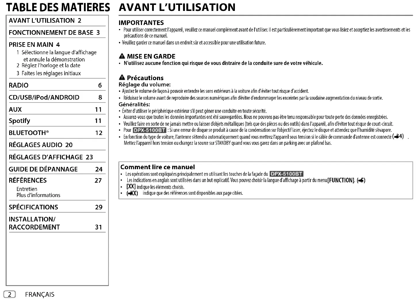 1 Sélectionne la langue d’affichage et annule la démonstration 2 Réglez l’horloge et la date 3 Faites les réglages initiaux RADIO 6 CD/USB/iPod/ANDROID 8 AUX 11 Spotify 11 BLUETOOTH® 12