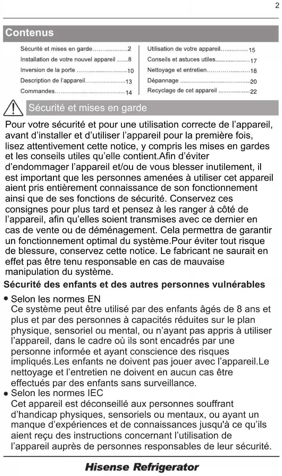 Conservez tous les emballages hors de portée des enfants, car il existe un risque de suffocation. Si vous décidez de mettre au rebut l’appareil, débranchez-le de la prise murale, coupez le câble de connexion (aussi proche de l’appareil que vous le pouvez) et retirez la porte afin d’empêcher les enfants de jouer avec et de se faire électrocuter ou de s’enfermer à l’intérieur. Si l’appareil, doté d’un joint de porte magnétique, doit remplacer un autre appareil doté d’un loquet sur la porte ou sur le joint, vérifiez bien que le loquet est hors d’état de fonctionner avant de vous débarrasser de l’ancien appareil.Cela évitera de transformer cet appareil en piège pour les enfants. Sécurité générale ATTENTION — Cet appareil est conçu pour fonctionner dans un foyer domestique et dans les environnements de type suivant -locaux de cuisine et équipements vendus dans le commerce, environnements de travail et bureaux ; -structures de type Bed and Breakfast -bâtiments de ferme et hôtels, motels et autres organismes accueillant des clients ; -cuisine industrielle et autres applications non destinées à la revente ATTENTION — Ne rangez jamais de substances inflammable tels que des aérosols à l’intérieur de cet appareil, car elles pourraient s’y déverser. ATTENTION — Si le cordon d’alimentation est endommagé, vous devez le remplacer immédiatement auprès de votre fabricant, ou d’un revendeur qualifié, afin d’éviter tout risque d’électrocution ATTENTION — Maintenez les ventilations biens ouvertes, et vérifiez bien que l’air peut circuler par les ouvertures, surtout si l’appareil est encastré dans le mur. ATTENTION — Etant donné que les systèmes mécaniques et autres équipements électriques accélèrent le processus de dégivrage, respectez l’environnement recommandé par le fabricant. ATTENTION — N’endommagez pas le circuit de réfrigération. ATTENTION — N’utilisez pas d’appareils électriques à l’intérieur du compartiment destiné à recevoir de la nourriture, sauf si ces derniers sont tolérés par le fabricant.4 ATTENTION — Le système réfrigérant et isolant contiennent des gaz inflammables.Lorsque vous mettez le système au rebut, faites-le auprès d’un centre de collecte agréé.N’exposez jamais l’appareil aux flammes. ATTENTION — Lors du positionnement de l’appareil, rassurez-vous que le cordon d’alimentation n’est pas coincé ou endommagé. ATTENTION — Ne placez pas plusieurs prises de courant ou alimentations portables à l'arrière de l'appareil. Liquide réfrigérant De l’isobutane réfrigérant (R600a) est utilisé dans le circuit réfrigérant du système ; Il s’agit d’un gaz naturel hautement inflammable, et donc dangereux pour l’environnement.Pendant les transports et l’installation du système, vérifiez qu’aucun des composants du circuit de réfrigération ne soit endommagé.Le réfrigérant (R600a) est un liquide inflammable. Attention : Si le circuit de réfrigération était endommagé : -Evitez les flammes nues et toute source d’inflammation. -Ventilez bien la pièce où se trouve l’appareil. ATTENTION — Les réfrigérateurs contiennent du réfrigérant et des gaz dans l’isolation. Le fluide frigorigène et les gaz doivent être éliminés professionnellement, car ils peuvent causer des lésions oculaires ou un incendie. Rassurez- vous que les tubes du circuit de réfrigérant ne sont pas endommagés avant l’élimination appropriée de ces gaz. Remplacement des lampes d'éclairage ATTENTION — Les lampes d'éclairage ne doivent pas être remplacées par l'utilisateur! Si les lampes d'éclairage sont endommagées, contactez le service d'assistance clientèle pour obtenir de l'aide. Cet avertissement concerne uniquement les réfrigérateurs contenant des lampes d'éclairage Risque d'incendie / matériaux inflammables5 Utilisation quotidienne Cet appareil de réfrigération n’est pas destiné à être utilisé comme un appareil encastrable. Ne stockez jamais de substances ou de liquides inflammables à l’intérieur de l’appareil ; cela provoquerait un risque d’exposition. Ne faites pas fonctionner d’autres appareils électriques à l’intérieur de cet appareil (mixeurs, turbines à glace électrique, etc). Lorsque vous débranchez l’appareil, tenez toujours la prise dans vos mains et ne tirez pas sur le cordon. Ne placez pas d’éléments chauds ni de composants en plastiques dans cet appareil. Sécurité électrique