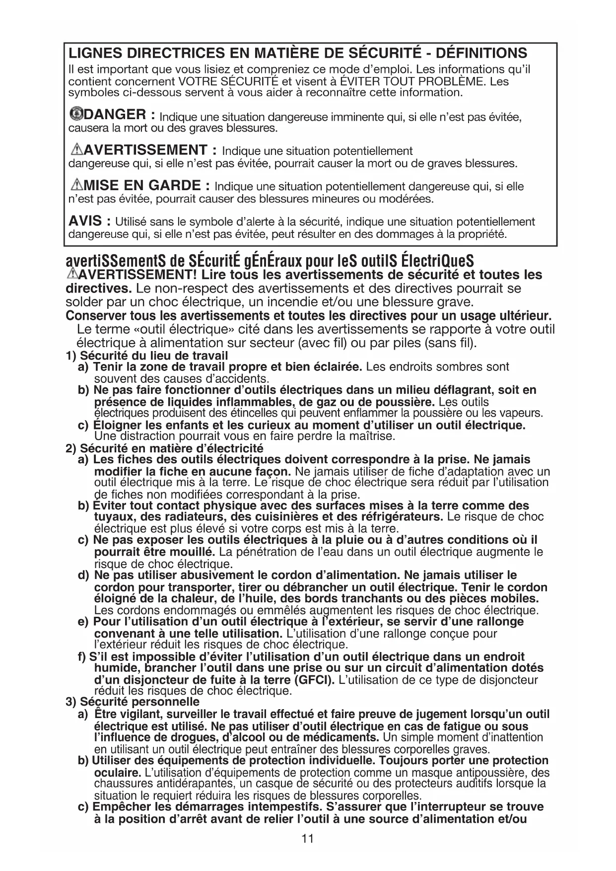 Ne pas faire fonctionner d’outils électriques dans un milieu déflagrant, soit en présence de liquides inflammables, de gaz ou de poussière. Les outils électriques produisent des étincelles qui peuvent enflammer la poussière ou les vapeurs. c) Éloigner les enfants et les curieux au moment d’utiliser un outil électrique. Une distraction pourrait vous en faire perdre la maîtrise.