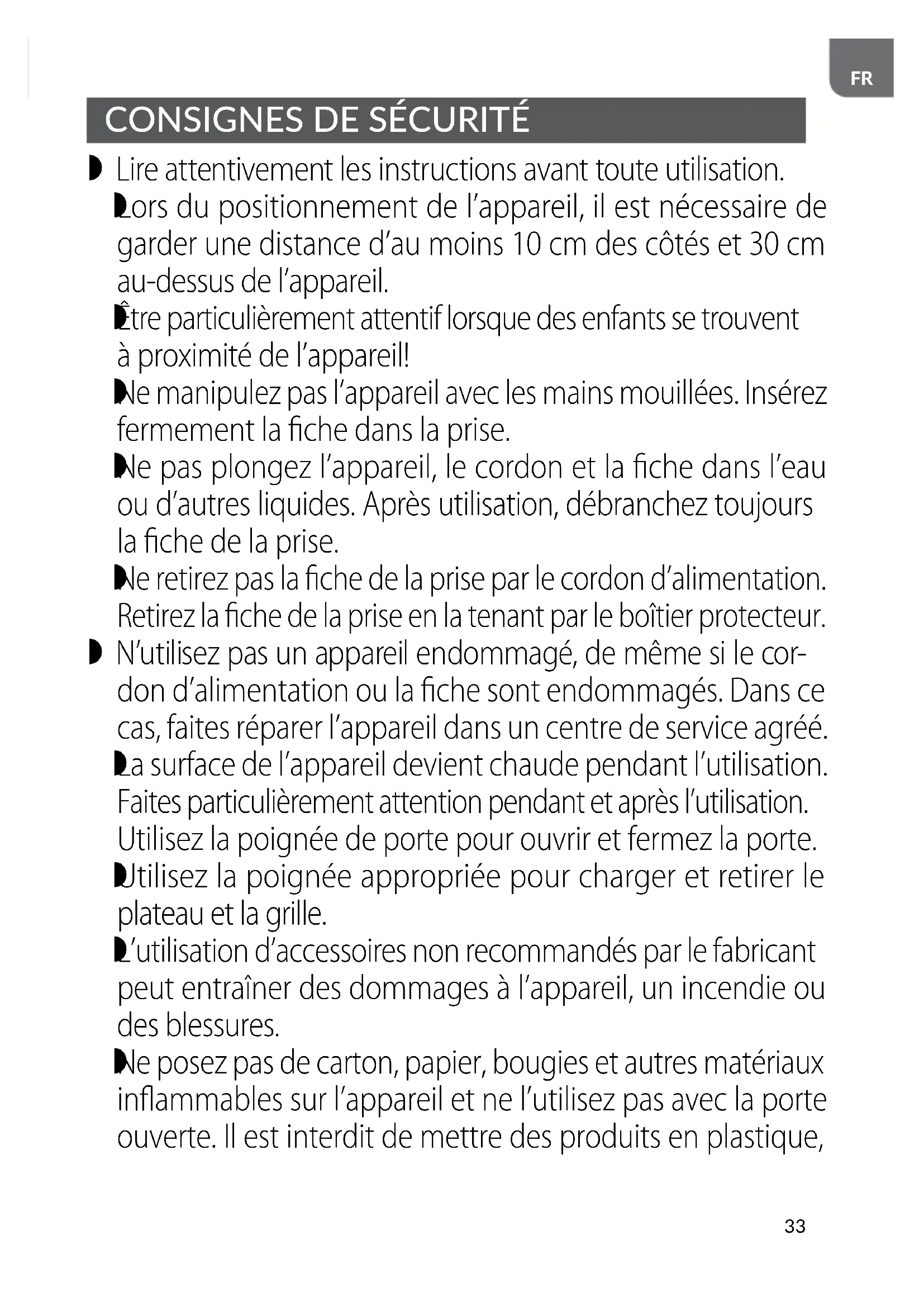 ATTENTION ! Surface chaude ! Utilisez l’appareil uniquement pour cuire et réchauffer des aliments. N’utilisez pas l’appareil à des fins non prévues (chauffage de locaux, utilisation commerciale, etc.). Avant de remplacer la lampe de l’appareil, assurez-vous que l’appareil est débranché pour éviter tout risque d’électrocution.