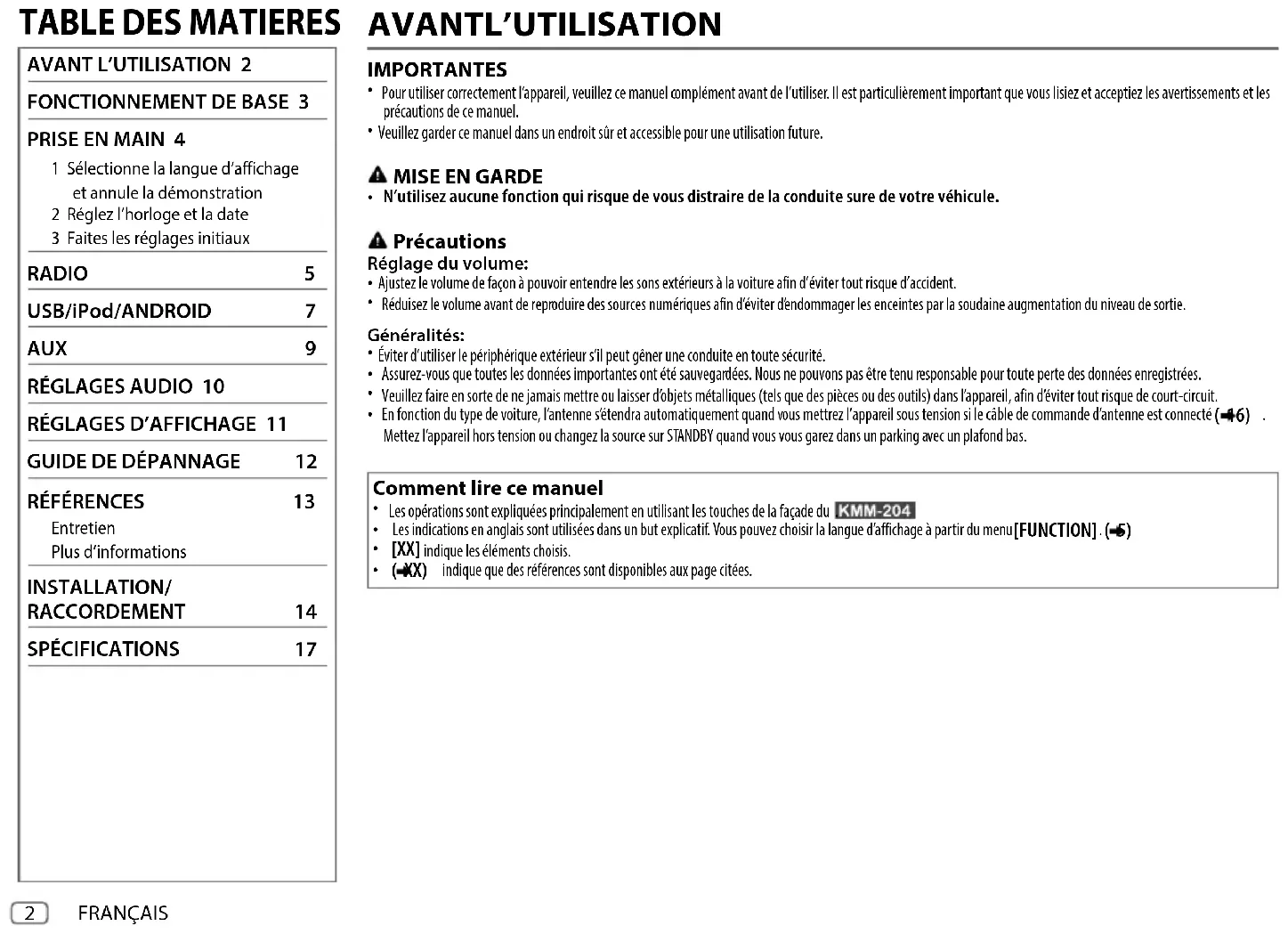 Retrouvez gratuitement la notice de l'appareil KMM204 KENWOOD au format PDF.