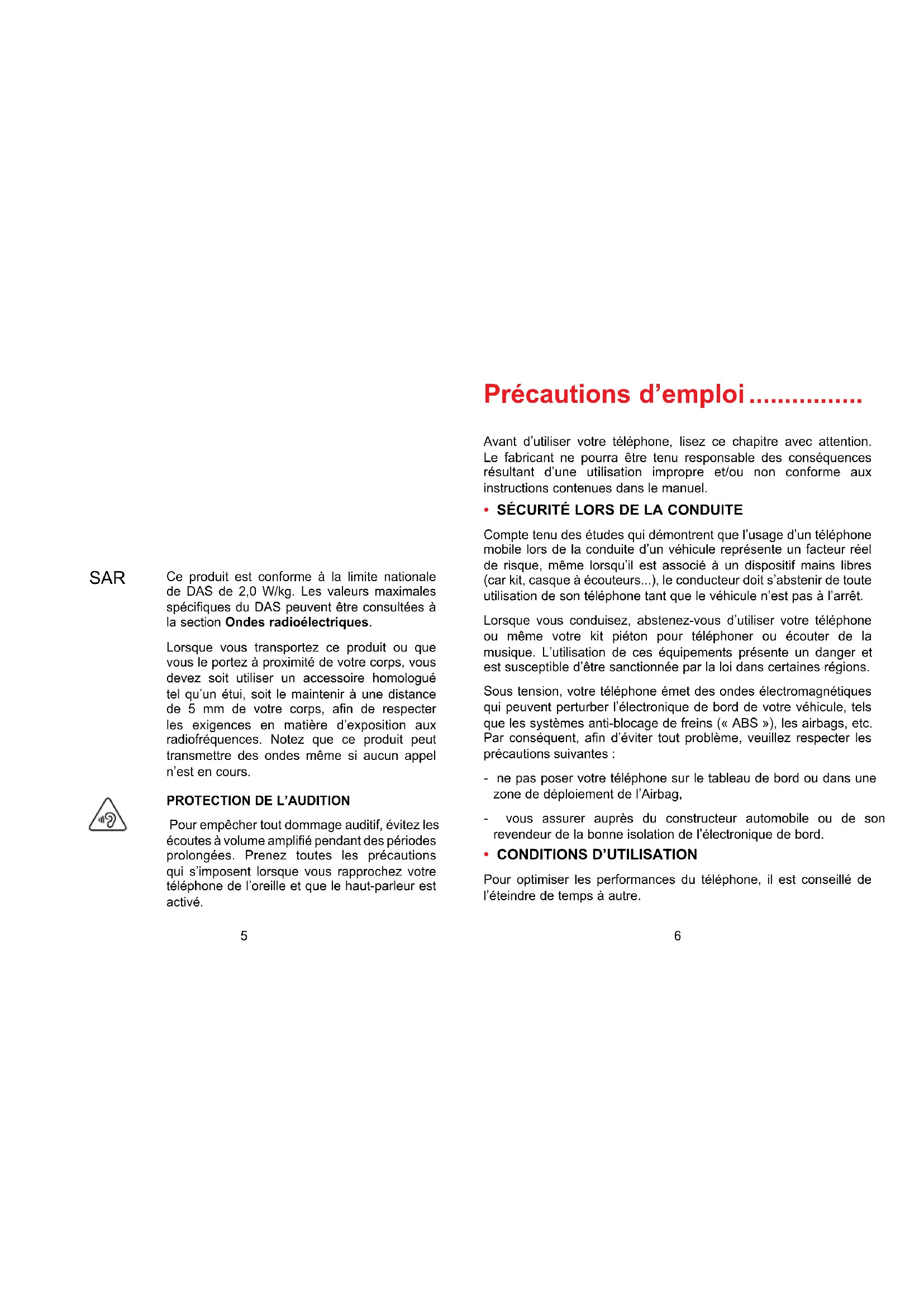 - SÉCURITÉ LORS DE LA CONDUITE Compte tenu des études qui démontrent que l’usage d’un téléphone mobile lors de la conduite d’un véhicule représente un facteur réel de risque, même lorsqu’il est associé à un dispositif mains libres (car kit, casque à écouteurs...), le conducteur doit s’abstenir de toute utilisation de son téléphone tant que le véhicule n’est pas à l’arrêt. Lorsque vous conduisez, abstenez-vous d’utiliser votre téléphone ou même votre kit piéton pour téléphoner ou écouter de la musique. L’utilisation de ces équipements présente un danger et est susceptible d’être sanctionnée par la loi dans certaines régions. Sous tension, votre téléphone émet des ondes électromagnétiques qui peuvent perturber l’électronique de bord de votre véhicule, tels que les systèmes anti-blocage de freins (« ABS »), les airbags, etc. Par conséquent, afin d’éviter tout problème, veuillez respecter les précautions suivantes : - ne pas poser votre téléphone sur le tableau de bord ou dans une zone de déploiement de l’Airbag, - vous assurer auprès du constructeur automobile ou de son revendeur de la bonne isolation de l’électronique de bord.