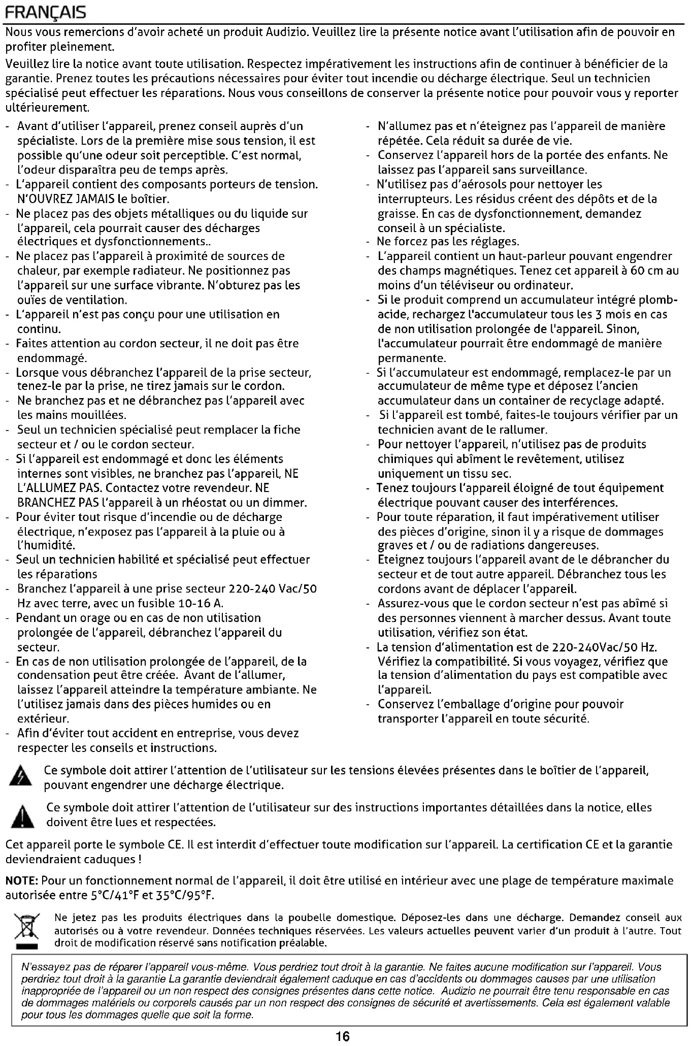 realizado correctamente, la barra de sonido emitirá un sonido para indicar que el emparejamiento se ha realizado correctamente. 3. Utilice los botones de funcionamiento (volumen, reproducción/pausa, etc.) del dispositivo o del mando a distancia para controlar la reproducción.16 Nous vous remercions d’avoir acheté un produit Audizio. Veuillez lire la présente notice avant l’utilisation afin de pouvoir en profiter pleinement. Veuillez lire la notice avant toute utilisation. Respectez impérativement les instructions afin de continuer à bénéficier de la garantie. Prenez toutes les précautions nécessaires pour éviter tout incendie ou décharge électrique. Seul un technicien spécialisé peut effectuer les réparations. Nous vous conseillons de conserver la présente notice pour pouvoir vous y reporter ultérieurement. - Avant d’utiliser l’appareil, prenez conseil auprès d’un spécialiste. Lors de la première mise sous tension, il est possible qu’une odeur soit perceptible. C’est normal, l’odeur disparaîtra peu de temps après. - L’appareil contient des composants porteurs de tension. N’OUVREZ JAMAIS le boîtier. - Ne placez pas des objets métalliques ou du liquide sur l’appareil, cela pourrait causer des décharges électriques et dysfonctionnements.. - Ne placez pas l’appareil à proximité de sources de chaleur, par exemple radiateur. Ne positionnez pas l’appareil sur une surface vibrante. N’obturez pas les ouïes de ventilation. - L’appareil n’est pas conçu pour une utilisation en continu. - Faites attention au cordon secteur, il ne doit pas être endommagé. - Lorsque vous débranchez l’appareil de la prise secteur, tenez-le par la prise, ne tirez jamais sur le cordon. - Ne branchez pas et ne débranchez pas l’appareil avec les mains mouillées. - Seul un technicien spécialisé peut remplacer la fiche secteur et / ou le cordon secteur. - Si l’appareil est endommagé et donc les éléments internes sont visibles, ne branchez pas l’appareil, NE L’ALLUMEZ PAS. Contactez votre revendeur. NE BRANCHEZ PAS l’appareil à un rhéostat ou un dimmer. - Pour éviter tout risque d’incendie ou de décharge électrique, n’exposez pas l’appareil à la pluie ou à l’humidité. - Seul un technicien habilité et spécialisé peut effectuer les réparations - Branchez l’appareil à une prise secteur 220-240 Vac/50 Hz avec terre, avec un fusible 10-16 A. - Pendant un orage ou en cas de non utilisation prolongée de l’appareil, débranchez l’appareil du secteur. - En cas de non utilisation prolongée de l’appareil, de la condensation peut être créée. Avant de l’allumer, laissez l’appareil atteindre la température ambiante. Ne l’utilisez jamais dans des pièces humides ou en extérieur. - Afin d’éviter tout accident en entreprise, vous devez respecter les conseils et instructions. - N’allumez pas et n’éteignez pas l’appareil de manière répétée. Cela réduit sa durée de vie. - Conservez l’appareil hors de la portée des enfants. Ne laissez pas l’appareil sans surveillance. - N’utilisez pas d’aérosols pour nettoyer les interrupteurs. Les résidus créent des dépôts et de la graisse. En cas de dysfonctionnement, demandez conseil à un spécialiste. - Ne forcez pas les réglages. - L’appareil contient un haut-parleur pouvant engendrer des champs magnétiques. Tenez cet appareil à 60 cm au moins d’un téléviseur ou ordinateur. - Si le produit comprend un accumulateur intégré plomb- acide, rechargez l'accumulateur tous les 3 mois en cas de non utilisation prolongée de l'appareil. Sinon, l'accumulateur pourrait être endommagé de manière permanente. - Si l’accumulateur est endommagé, remplacez-le par un accumulateur de même type et déposez l’ancien accumulateur dans un container de recyclage adapté. - Si l’appareil est tombé, faites-le toujours vérifier par un technicien avant de le rallumer. - Pour nettoyer l’appareil, n’utilisez pas de produits chimiques qui abîment le revêtement, utilisez uniquement un tissu sec. - Tenez toujours l’appareil éloigné de tout équipement électrique pouvant causer des interférences. - Pour toute réparation, il faut impérativement utiliser des pièces d’origine, sinon il y a risque de dommages graves et / ou de radiations dangereuses. - Eteignez toujours l’appareil avant de le débrancher du secteur et de tout autre appareil. Débranchez tous les cordons avant de déplacer l’appareil. - Assurez-vous que le cordon secteur n’est pas abîmé si des personnes viennent à marcher dessus. Avant toute utilisation, vérifiez son état. - La tension d’alimentation est de 220-240Vac/50 Hz. Vérifiez la compatibilité. Si vous voyagez, vérifiez que la tension d’alimentation du pays est compatible avec l’appareil. - Conservez l’emballage d’origine pour pouvoir transporter l’appareil en toute sécurité. Ce symbole doit attirer l’attention de l’utilisateur sur les tensions élevées présentes dans le boîtier de l’appareil, pouvant engendrer une décharge électrique. Ce symbole doit attirer l’attention de l’utilisateur sur des instructions importantes détaillées dans la notice, elles doivent être lues et respectées. Cet appareil porte le symbole CE. Il est interdit d’effectuer toute modification sur l’appareil. La certification CE et la garantie deviendraient caduques ! NOTE: Pour un fonctionnement normal de l’appareil, il doit être utilisé en intérieur avec une plage de température maximale autorisée entre 5°C/41°F et 35°C/95°F. Ne jetez pas les produits électriques dans la poubelle domestique. Déposez-les dans une décharge. Demandez conseil aux autorisés ou à votre revendeur. Données techniques réservées. Les valeurs actuelles peuvent varier d’un produit à l’autre. Tout droit de modification réservé sans notification préalable. N’essayez pas de réparer l’appareil vous-même. V