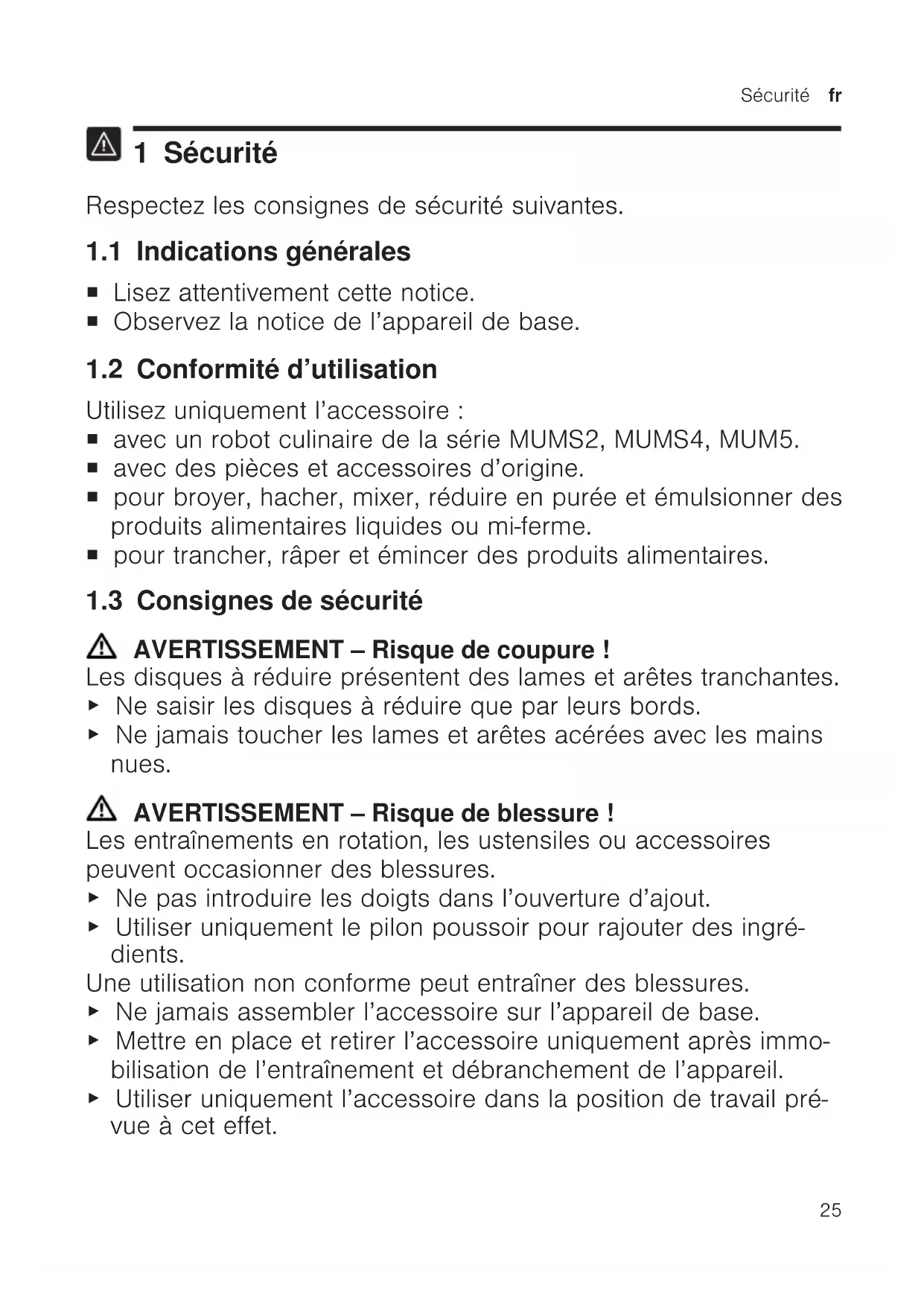1 Sécurité Respectez les consignes de sécurité suivantes. 1.1 Indications générales ¡ Lisez attentivement cette notice. ¡ Observez la notice de l’appareil de base. 1.2 Conformité d’utilisation Utilisez uniquement l’accessoire: ¡ avec un robot culinaire de la série MUMS2, MUMS4, MUM5. ¡ avec des pièces et accessoires d’origine. ¡ pour broyer, hacher, mixer, réduire en purée et émulsionner des produits alimentaires liquides ou mi-ferme. ¡ pour trancher, râper et émincer des produits alimentaires. 1.3 Consignes de sécurité AVERTISSEMENT‒Risque de coupure! Les disques à réduire présentent des lames et arêtes tranchantes. ▶ Ne saisir lesdisquesàréduire queparleurs bords. ▶ Ne jamais toucher les lames et arêtes acérées avec les mains nues. AVERTISSEMENT‒Risque de blessure! Les entraînements en rotation, les ustensiles ou accessoires peuvent occasionner des blessures. ▶ Ne pas introduire les doigts dans l’ouverture d’ajout. ▶ Utiliser uniquement le pilon poussoir pour rajouter des ingré- dients. Une utilisation non conforme peut entraîner des blessures. ▶ Ne jamais assembler l’accessoire sur l’appareil de base. ▶ Mettre en place et retirer l’accessoire uniquement après immo- bilisation de l’entraînement et débranchement de l’appareil. ▶ Utiliser uniquement l’accessoire dans la position de travail pré- vue à cet effet.fr Prévenir les dégâts matériels