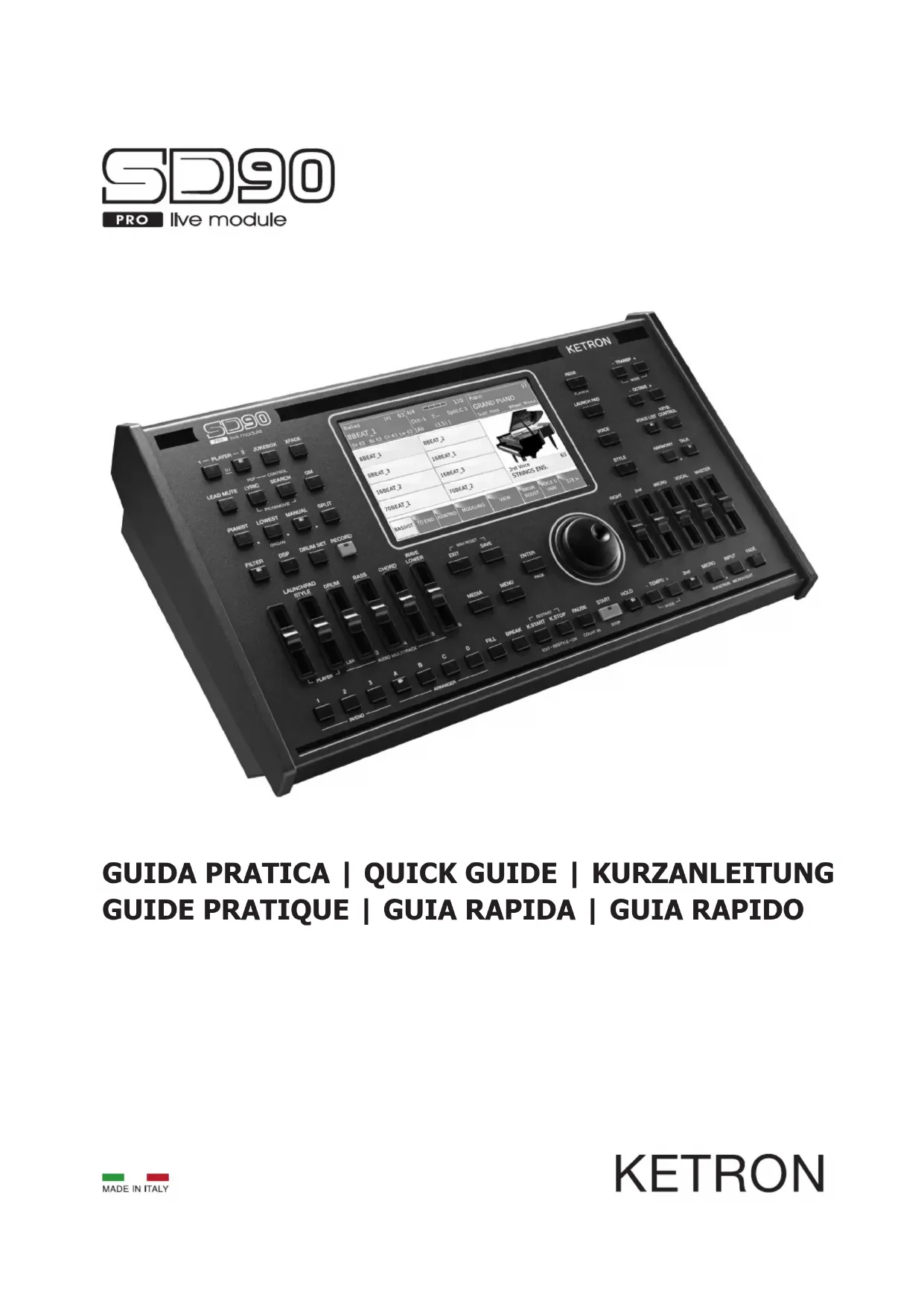“ExécutiondesDirectives2002/95/CE,2002/96/CEet2003/108/CE,concernantlaréductiondel’utilisationdesubstances dangereusesdanslesappareilsélectriquesetélectroniquesetl’éliminationdesdéchets”. Lesymboleduconteneurbarrémarquésurl’appareilindiquequeleproduitàlandesavieutiledoitêtrecollectéséparément desautresdéchets.Parconséquentl’utilisateurdevra collecter l’appareil inutilisable dans un centre de collecte sélective approprié de déchets électroniques et électrotechniques ou bien ildevra le remettreau revendeur en cas d’achat d’un nouvelappareildetypepareil,enraisond’uncontreun.Unecollectesélectiveadéquateetleconséquentenvoidel’appareil inutilisable au recyclage, au traitement et à son correcte élimination contribue à éviter de possibles effets négatifs sur l’environnementetsurlasantéetellefavoriselerecyclagedesmatièresdontl’appareilestcomposé.L’éliminationabusivedu produitparl’utilisateurcomportel’applicationdessanctionsadministrativesprévues. Ce symbole indique que dans les pays de l’Union européenne, ce produit doit être collecté séparément des ordures ménagères selon les directives en vigueur dans chacun de ces pays. Les produits portant ce symbole ne doivent pas être mis au rebut avec les ordures ménagères./18 CONNEXIONS DC 9V 4A Prise d’alimentation du courant électrique. Onconseilled’utiliserexclusivementl’alimentateur fourniavecl’instrument.Output:9V,4A. ON/OFF Bouton poussoir d’activation/désactivation. Lamiseenmarchedel’instrumentpeut demanderjusqu’à30secondes.Pourarrêtercorrectementl’instrument,enfoncerlatouche ON/OFFetattendresacomplètedésactivation.Cetteopérationpeutdemanderjusqu’à 10secondes. SUSTAIN PEDAL Prisejackpourlaconnexiond’unepédaledeSustain(optionnelle). VOLUME PEDAL Prisejackstéréostandardpourlaconnexiond’unepédaledeVolume(optionnelle). VIDEO DVI Prisevidéonumérique(DigitalVideoInterface)pourlaconnexiond’unécranexterne. USB DEVICE ConnexionUSBdevicepourordinateuroud’autresdispositifsenmesuredegérerSD90 commeuneunitéamovibleexterne. FOOTSWITCH Prisemultipolairestandardpourlaconnexiond’unepédaleoptionnellepourlecontrôledecertaines fonctionsinternes.CompatibleavecKetronFS6/FS13. MIDI PrisepourlaconnexionMIDIIN1(GM),MIDIIN2(Key),MIDIOUTetMIDITHRU. MAIN OUT Prisejackmonostandardpourlasortiegénéraleàconnecteravecuneinstallation PASTEREO:gauche(LeftMono),droite(RightMono).Nousvousconseillonsvivement d’employerlaconnexionsstéréopouruneparfaitereproductiondel’instrumentetdesesEfx. UneéventuelleconnexionMono(c’est-à-direl’emploid’uneseulesortieLeftouRight)produira unereproductionquinereètepaslespropriétésqualitativesdessonsetdesEfx. HEADPHONE AUX Prisepourcasque(oujackpourd’autresutilisations).Levolumeducasqueserajustementcontrôlé parlasectionMaster. MICRO 1 IN Prisecombo(Jack/Xlr)monostandardpourlaconnexiond’unmicrophonedynamique. GAIN MICRO PotentiomètrepourleréglagedugaindusignalenentréeàlapriseMicro1. MICRO OUT PrisejackmonostandardconsacréeexclusivementàlasortieMicro1. INPUT Prisejackmonostandardpourlaconnexiond’uninstrumentsupplémentaire,(Keyboard, Expandeur),GuitareouMicrophonedynamique. Surlapartiedroitedel’instrumentnoustrouvons3 USB Host.SdCard sSotpourlaconnexionavecdesdispositifsUSBexternes,SdCardtels queclémémoireHDalimente’,etc./19 ESPAÑOL Bienvenidos! Gracias por la compra del Ketron SD90! Estabreveguiadescribelasoperacionesbásicasparaparalapuestaenmarcha delmòdulo,lasconexionesylasadvertenciasdeseguridad.Serecomiendaleer elmanualdeinstruccionesenformatoHTMLdisponibleeneldispositivoUSB paraobtenerelmaximorendimientoyecienciaparasuusoeneldirectoyen elestudio. ElmismomanualenHTMLtambiénestádisponibleenelsitiowebwww.ketron. itdondesepuedeencontrarmásinformacióndelasutilidadesrelacionadascon elSD90. SD90revolucionacompletamentelaformadeusograciasalanuevapantalla táctil de grandes dimensiones y a color. La mayoría de las funciones, sonfacilmenteaccesiblesconel“toquedeundedo”directamenteenlapantalla, encorrespondenciadesusbotones./20