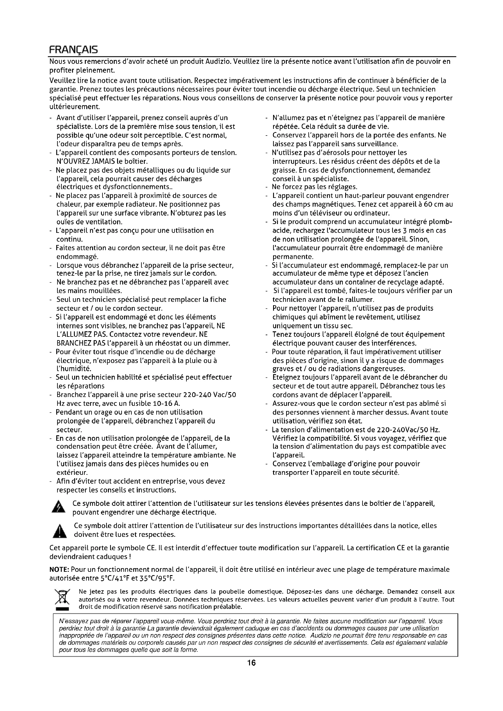 realizado correctamente, la barra de sonido emitirá un sonido para indicar que el emparejamiento se ha realizado correctamente. 3. Utilice los botones de funcionamiento (volumen, reproducción/pausa, etc.) del dispositivo o del mando a distancia para controlar la reproducción.16 Nous vous remercions d’avoir acheté un produit Audizio. Veuillez lire la présente notice avant l’utilisation afin de pouvoir en profiter pleinement. Veuillez lire la notice avant toute utilisation. Respectez impérativement les instructions afin de continuer à bénéficier de la garantie. Prenez toutes les précautions nécessaires pour éviter tout incendie ou décharge électrique. Seul un technicien spécialisé peut effectuer les réparations. Nous vous conseillons de conserver la présente notice pour pouvoir vous y reporter ultérieurement. - Avant d’utiliser l’appareil, prenez conseil auprès d’un spécialiste. Lors de la première mise sous tension, il est possible qu’une odeur soit perceptible. C’est normal, l’odeur disparaîtra peu de temps après. - L’appareil contient des composants porteurs de tension. N’OUVREZ JAMAIS le boîtier. - Ne placez pas des objets métalliques ou du liquide sur l’appareil, cela pourrait causer des décharges électriques et dysfonctionnements.. - Ne placez pas l’appareil à proximité de sources de chaleur, par exemple radiateur. Ne positionnez pas l’appareil sur une surface vibrante. N’obturez pas les ouïes de ventilation. - L’appareil n’est pas conçu pour une utilisation en continu. - Faites attention au cordon secteur, il ne doit pas être endommagé. - Lorsque vous débranchez l’appareil de la prise secteur, tenez-le par la prise, ne tirez jamais sur le cordon. - Ne branchez pas et ne débranchez pas l’appareil avec les mains mouillées. - Seul un technicien spécialisé peut remplacer la fiche secteur et / ou le cordon secteur. - Si l’appareil est endommagé et donc les éléments internes sont visibles, ne branchez pas l’appareil, NE L’ALLUMEZ PAS. Contactez votre revendeur. NE BRANCHEZ PAS l’appareil à un rhéostat ou un dimmer. - Pour éviter tout risque d’incendie ou de décharge électrique, n’exposez pas l’appareil à la pluie ou à l’humidité. - Seul un technicien habilité et spécialisé peut effectuer les réparations - Branchez l’appareil à une prise secteur 220-240 Vac/50 Hz avec terre, avec un fusible 10-16 A. - Pendant un orage ou en cas de non utilisation prolongée de l’appareil, débranchez l’appareil du secteur. - En cas de non utilisation prolongée de l’appareil, de la condensation peut être créée. Avant de l’allumer, laissez l’appareil atteindre la température ambiante. Ne l’utilisez jamais dans des pièces humides ou en extérieur. - Afin d’éviter tout accident en entreprise, vous devez respecter les conseils et instructions. - N’allumez pas et n’éteignez pas l’appareil de manière répétée. Cela réduit sa durée de vie. - Conservez l’appareil hors de la portée des enfants. Ne laissez pas l’appareil sans surveillance. - N’utilisez pas d’aérosols pour nettoyer les interrupteurs. Les résidus créent des dépôts et de la graisse. En cas de dysfonctionnement, demandez conseil à un spécialiste. - Ne forcez pas les réglages. - L’appareil contient un haut-parleur pouvant engendrer des champs magnétiques. Tenez cet appareil à 60 cm au moins d’un téléviseur ou ordinateur. - Si le produit comprend un accumulateur intégré plomb- acide, rechargez l'accumulateur tous les 3 mois en cas de non utilisation prolongée de l'appareil. Sinon, l'accumulateur pourrait être endommagé de manière permanente. - Si l’accumulateur est endommagé, remplacez-le par un accumulateur de même type et déposez l’ancien accumulateur dans un container de recyclage adapté. - Si l’appareil est tombé, faites-le toujours vérifier par un technicien avant de le rallumer. - Pour nettoyer l’appareil, n’utilisez pas de produits chimiques qui abîment le revêtement, utilisez uniquement un tissu sec. - Tenez toujours l’appareil éloigné de tout équipement électrique pouvant causer des interférences. - Pour toute réparation, il faut impérativement utiliser des pièces d’origine, sinon il y a risque de dommages graves et / ou de radiations dangereuses. - Eteignez toujours l’appareil avant de le débrancher du secteur et de tout autre appareil. Débranchez tous les cordons avant de déplacer l’appareil. - Assurez-vous que le cordon secteur n’est pas abîmé si des personnes viennent à marcher dessus. Avant toute utilisation, vérifiez son état. - La tension d’alimentation est de 220-240Vac/50 Hz. Vérifiez la compatibilité. Si vous voyagez, vérifiez que la tension d’alimentation du pays est compatible avec l’appareil. - Conservez l’emballage d’origine pour pouvoir transporter l’appareil en toute sécurité. Ce symbole doit attirer l’attention de l’utilisateur sur les tensions élevées présentes dans le boîtier de l’appareil, pouvant engendrer une décharge électrique. Ce symbole doit attirer l’attention de l’utilisateur sur des instructions importantes détaillées dans la notice, elles doivent être lues et respectées. Cet appareil porte le symbole CE. Il est interdit d’effectuer toute modification sur l’appareil. La certification CE et la garantie deviendraient caduques ! NOTE: Pour un fonctionnement normal de l’appareil, il doit être utilisé en intérieur avec une plage de température maximale autorisée entre 5°C/41°F et 35°C/95°F. Ne jetez pas les produits électriques dans la poubelle domestique. Déposez-les dans une décharge. Demandez conseil aux autorisés ou à votre revendeur. Données techniques réservées. Les valeurs actuelles peuvent varier d’un produit à l’autre. Tout droit de modification réservé sans notification préalable. N’essayez pas de réparer l’appareil vous-même. V