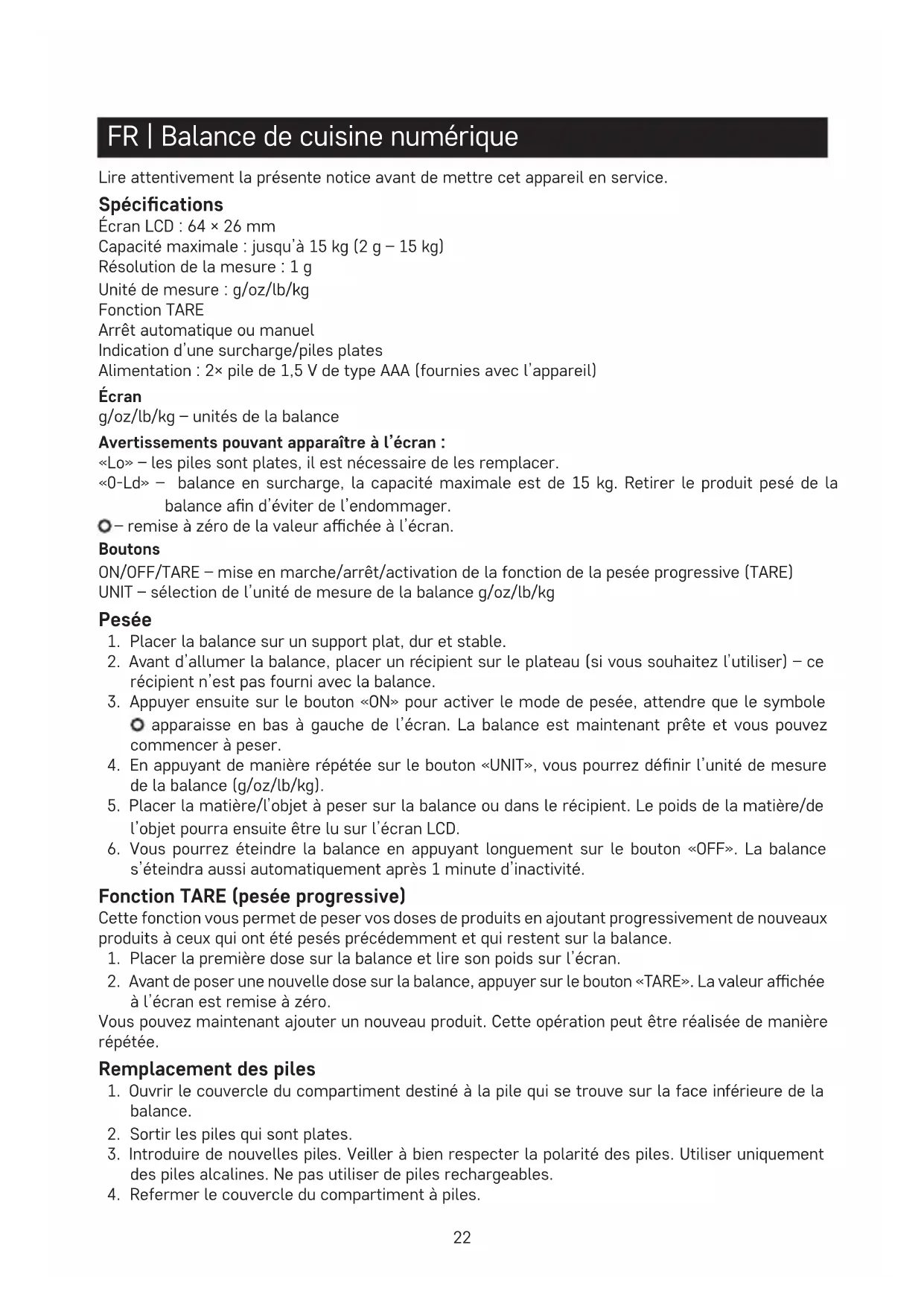 - Cet appareil n’a pas été conçu pour être utilisé par des personnes (enfants compris) qui ont des capacités physiques et/ou sensorielles limitées, qui ont des troubles mentaux ou qui ne sont pas susamment expérimentées, à moins qu’elles ne soient sous la surveillance d’une personne qui est responsable de leur sécurité ou qu’une telle personne leur ait fait suivre une formation relative à l’utilisation de l’appareil. Les enfants doivent rester sous surveillance an de les empêcher de jouer avec cet appareil. Ne pas jeter avec les ordures ménagères. Utilisez des points de collecte spéciaux pour les déchets tries. Contactez les autorités locales pour obtenir des informations sur les points de collecte. Si les appareils électroniques sont mis en décharge, des substances dangereuses peuvent atteindre les eaux souterraines et, par la suite, la chaîne alimentaire, où elles peuvent af- fecter la santé humaine. IT | Bilancia da cucina digitale Prima di mettere in funzione il prodotto, leggere attentamente le istruzioni. Speciche display LCD: 64 × 26 mm Peso massimo: no a 15 kg (2 g – 15 kg) Risoluzione di misurazione: 1 g Unità di misura: g/oz/lb/kg Funzione TARA Spegnimento automatico e manuale Indicazione di sovraccarico/batteria debole Alimentazione: 2 batterie AAA da 1,5 V (non incluse) Display g/oz/lb/kg – unità di peso Avvisi sul display: „Lo“ – le batterie sono scariche e vanno sostituite. „0-Ld “ – bilancia sovraccarica, la portata massima è di 15 kg. Rimuovere la dose pesata dalla bilancia per evitare danni. – ripristino del valore del display.24 Pulsanti ON/OFF/TARE – accensione/spegnimento/attivazione della funzione (TARA) UNIT – selezione dell’unità di pesatura g/oz/lb/kg Pesatura