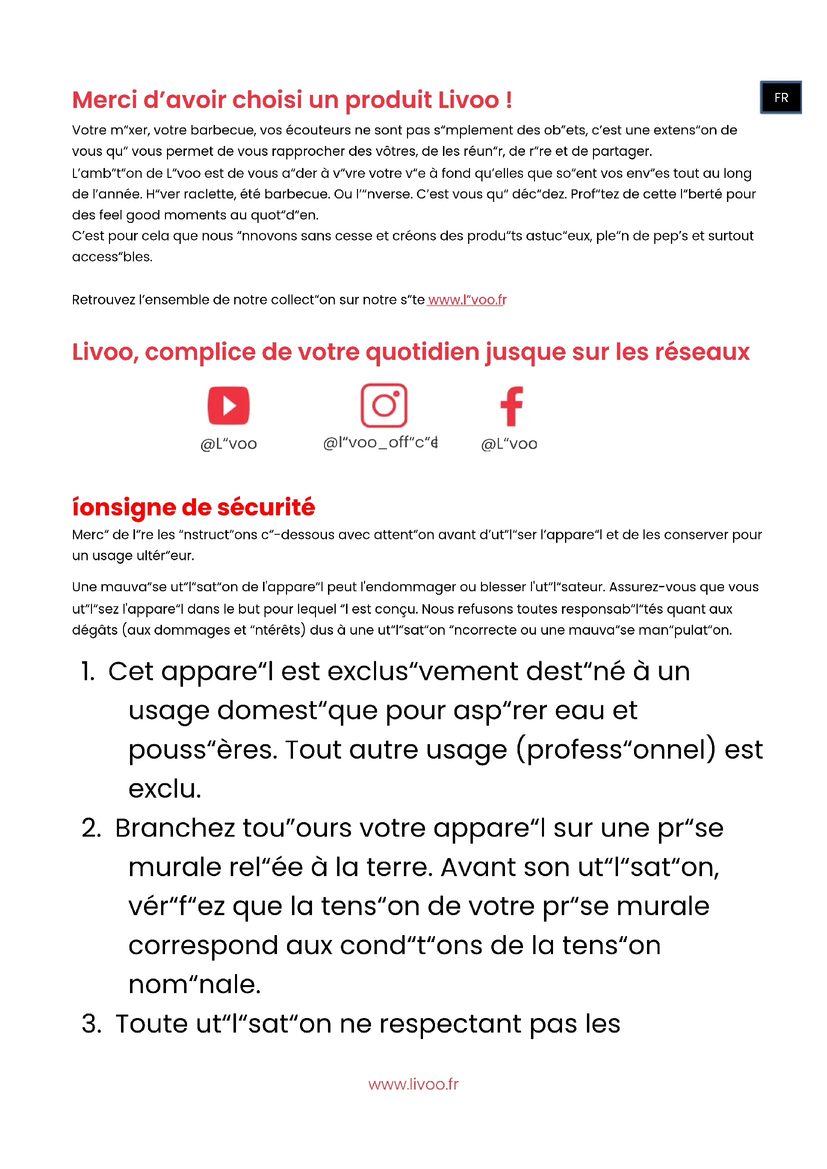 Version : v.1.0www.livoo.frwww.livoo.fr Merci d’avoir choisi un produit Livoo ! Votre mixer, votre barbecue, vos écouteurs ne sont pas simplement des objets, c’est une extension de vous qui vous permet de vous rapprocher des vôtres, de les réunir, de rire et de partager. L’ambition de Livoo est de vous aider à vivre votre vie à fond qu’elles que soient vos envies tout au long de l’année. Hiver raclette, été barbecue. Ou l’inverse. C’est vous qui décidez. Profitez de cette liberté pour des feel good moments au quotidien. C’est pour cela que nous innovons sans cesse et créons des produits astucieux, plein de pep’s et surtout accessibles. Retrouvez l’ensemble de notre collection sur notre site www.livoo.fr Livoo, complice de votre quotidien jusque sur les réseaux