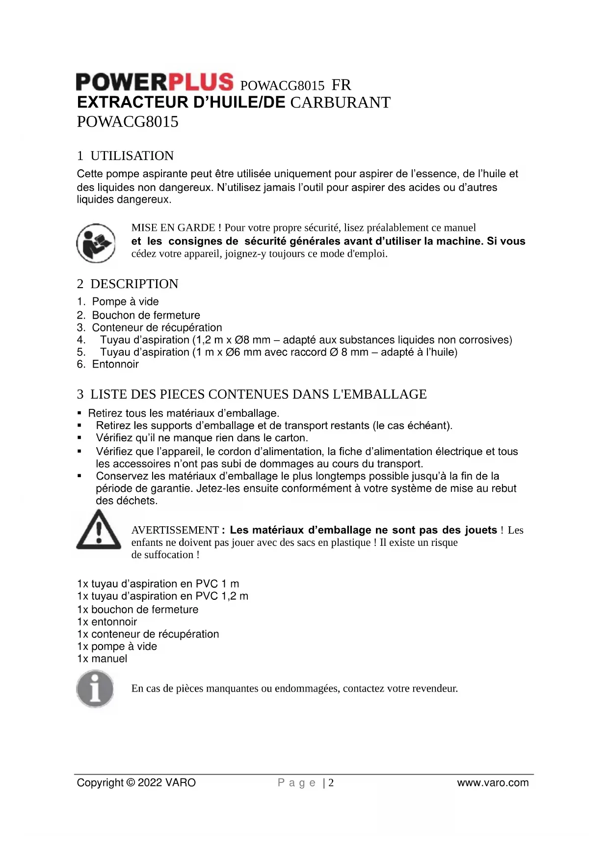 - L’essence et l’huile sont des substance dangereuses qui doivent être mises au rebut conformément aux règlements de sécurité publique. Important : si le conteneur à vider est plus haut que la pompe aspirante, le liquide continue à s’écouler même après l’arrêt des mouvements de pompage.POWACG8015 FR Copyright © 2022 VARO P a g e | 4 www.varo.com