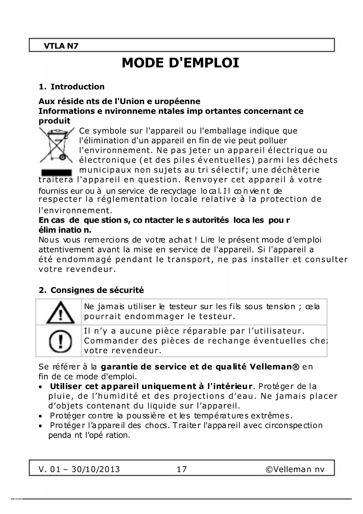 © D RO I TS D ’A U TEU R SA Velleman est l’ayant droit des droits d’auteur pour ce mode d'emploi. Tous droits mondiaux réservés. T o u te reproduction, traduction, copie ou diffusion, intégrale ou partielle, du contenu de ce mode d'emploi par quelque procédé ou sur tout support électronique que ce soit est interdite sans l’accord préalable écrit de l’ayant droit.VTLA N7