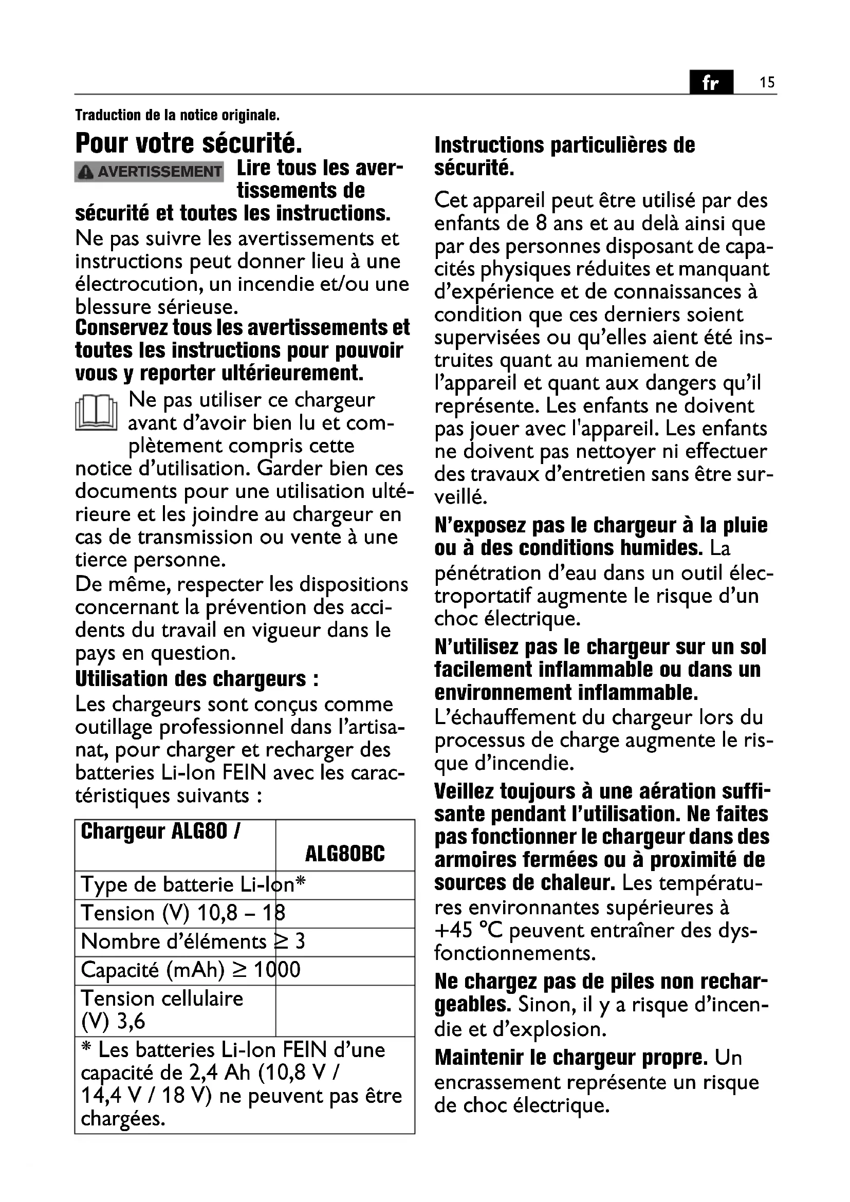 Traduction de la notice originale. Pour votre sécurité. Lire tous les aver- tissements de sécurité et toutes les instructions. Ne pas suivre les avertissements et instructions peut donner lieu à une électrocution, un incendie et/ou une blessure sérieuse. Conservez tous les avertissements et toutes les instructions pour pouvoir vous y reporter ultérieurement. Ne pas utiliser ce chargeur avant d’avoir bien lu et com- plètement compris cette notice d’utilisation. Garder bien ces documents pour une utilisation ulté- rieure et les joindre au chargeur en cas de transmission ou vente à une tierce personne. De même, respecter les dispositions concernant la prévention des acci- dents du travail en vigueur dans le pays en question. Utilisation des chargeurs : Les chargeurs sont conçus comme outillage professionnel dans l’artisa- nat, pour charger et recharger des batteries Li-Ion FEIN avec les carac- téristiques suivants : Instructions particulières de sécurité. Cet appareil peut être utilisé par des enfants de 8 ans et au delà ainsi que par des personnes disposant de capa- cités physiques réduites et manquant d’expérience et de connaissances à condition que ces derniers soient supervisées ou qu’elles aient été ins- truites quant au maniement de l’appareil et quant aux dangers qu’il représente. Les enfants ne doivent pas jouer avec l'appareil. Les enfants ne doivent pas nettoyer ni effectuer des travaux d’entretien sans être sur- veillé. N’exposez pas le chargeur à la pluie ou à des conditions humides. La pénétration d’eau dans un outil élec- troportatif augmente le risque d’un choc électrique. N’utilisez pas le chargeur sur un sol facilement inflammable ou dans un environnement inflammable. L’échauffement du chargeur lors du processus de charge augmente le ris- que d’incendie. Veillez toujours à une aération suffi- sante pendant l’utilisation. Ne faites pas fonctionner le chargeur dans des armoires fermées ou à proximité de sources de chaleur. Les températu- res environnantes supérieures à +45 °C peuvent entraîner des dys- fonctionnements. Ne chargez pas de piles non rechar- geables. Sinon, il y a risque d’incen- die et d’explosion. Maintenir le chargeur propre. Un encrassement représente un risque de choc électrique. Chargeur ALG80 / ALG80BC Type de batterie Li-Ion* Tension (V) 10,8 – 18 Nombre d’éléments ≥ 3 Capacité (mAh) ≥ 1000 Tension cellulaire (V) 3,6
