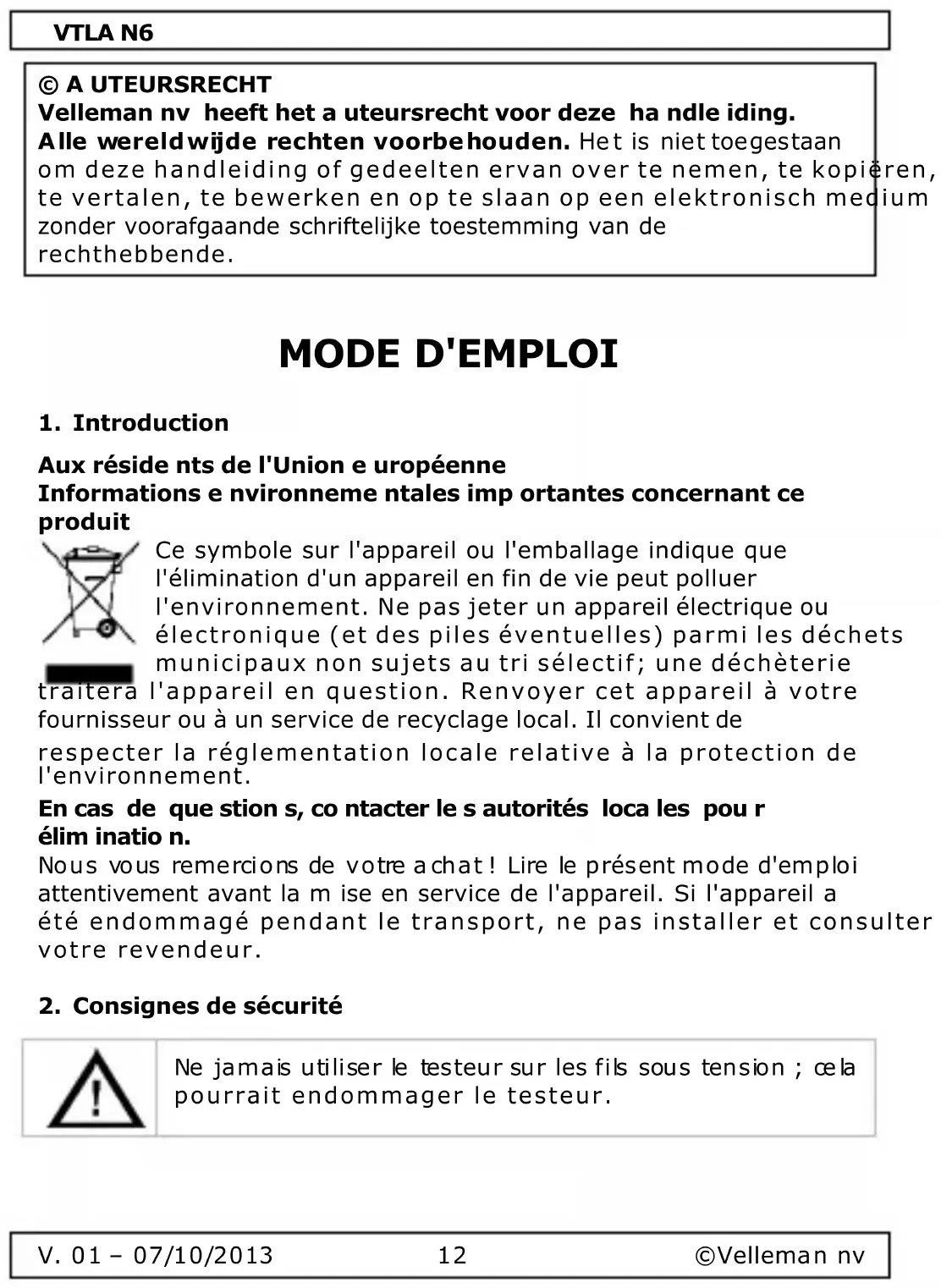 © D RO I TS D ’A U TEU R SA Velleman est l’ayant droit des droits d’auteur pour ce mode d'emploi. Tous droits mondiaux réservés. T o u te reproduction, traduction, copie ou diffusion, intégrale ou partielle, du contenu de ce mode d'emploi par quelque procédé ou sur tout suppo rt é lectro nique que ce soit est interdite sans l’accord préalable écrit de l’ayant droit.