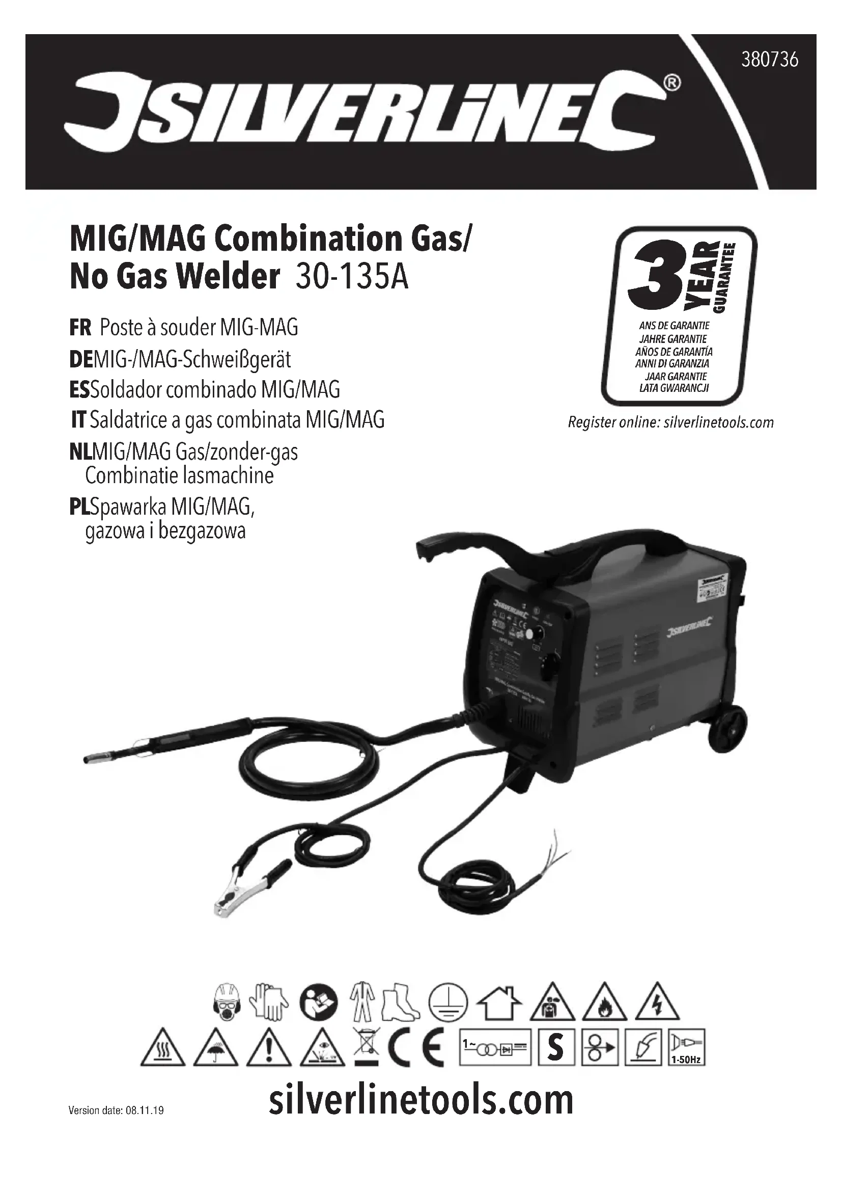 Conditions générales Garantie des outils Silverline Ce produit Silverline bénécie d’une garantie de 3 ans Enregistrez ce produit sur le site silverlinetools.com dans les 30 jours suivant l’achat an de bénécier de la garantie de 3 ans. La période de garantie commence à partir de la date d’achat gurant sur votre facture. Enregistrement de votre achat Rendez-vous sur silverlinetools.com, sélectionnez le bouton d’enregistrement et saisissez :• Vos informations personnelles• Les informations concernant le produit et l’achatVous recevrez le certicat de garantie en format PDF. Veuillez l’imprimer et le conserver avec votre article.La période de garantie prend effet à compter de la date de l’achat en magasin indiquée sur votre facture. VEUILLEZ CONSERVER VOTRE PREUVE D’ACHAT. Si ce produit est défectueux pendant les 30 jours qui suivent l’achat, retournez-le au magasin où vous l’avez acheté, avec votre facture, en expliquant en détail le problème. Le produit sera remplacé ou vous serez remboursé(e).Si ce produit est défectueux après cette période de 30 jours, retournez-le à :Silverline Tools Service Centre PO Box 2988YeovilBA21 1WU, Royaume UniToute demande de service sous garantie doit être soumise pendant la période de garantie.Avant toute intervention sous garantie, vous devez présenter la facture originale sur laquelle doivent gurer la date d’achat, votre nom, votre adresse et le lieu d’achat.Vous devez expliquer en détail la défaillance nécessitant réparation.Les demandes de service sous garantie faites pendant la période de garantie seront vériées par Silverline Tools pour établir si la défaillance du produit est liée à un vice de matériau ou de fabrication.Les frais de port ne seront pas remboursés. Les articles retournés doivent être convenablement propres et sûrs pour être réparés et devraient être emballés soigneusement pour éviter tout dommage ou toute blessure pendant le transport. Nous pouvons refuser les livraisons qui ne sont pas convenables ou sûres.Toute intervention sera effectuée par Silverline Tools ou ses agents de réparation agréés.La réparation ou le remplacement du produit ne dépassera pas la période de garantie.Les anomalies que nous reconnaissons être couvertes par la garantie seront rectiées par la réparation de l’outil, sans frais (hormis les frais de port) ou par son remplacement par un outil en parfait état de fonctionnement.Les pièces ou les outils remplacés deviendront la propriété de Silverline Tools. La réparation ou le remplacement de votre produit sous garantie vous apporte des avantages ; ces avantages s’ajoutent à vos droits statutaires en tant que consommateur sans les affecter aucunement. La présente garantie couvre : La réparation du produit, s’il peut être vérié, à la satisfaction de Silverline Tools, que les défaillances du produit ont été provoquées par un vice de matériau ou de fabrication au cours de la période de garantie.Si une pièce n’est plus disponible ou n’est plus fabriquée, Silverline Tools la remplacera par une pièce de rechange opérationnelle.Utilisation de ce produit dans l’UE. La présente garantie ne couvre pas : Silverline Tools ne garantit pas les réparations nécessaires du produit engendrées par :L’usure normale provoquée par l’utilisation conforme aux instructions d’utilisation, par exemple des lames, des balais de charbon, des courroies, des ampoules, des batteries, etc.Le remplacement de tout accessoire fourni tel que les forêts, les lames, les feuilles abrasives, les outils de coupes et les autres articles associés.Les dommages et les défaillances accidentels causés par une utilisation ou un entretien négligent, une mauvaise utilisation, un manque d’entretien ou une utilisation ou une manipulation imprudente du produit.L’utilisation du produit à des ns autres que son utilisation domestique normale.Le moindre changement ou la moindre modication du produit.L’utilisation de pièces et d’accessoires qui ne sont pas des composants véritables de Silverline Tools.Une installation défectueuse (sauf si l’installation a été réalisée par Silverline Tools).Les réparations ou les modications réalisées par des tiers autres que Silverline Tools ou ses agents de réparation agréés.Les demandes de service autres que le droit de rectier les défaillances de l’outil indiquées dans ces conditions de garantie ne sont pas couvertes par cette garantie. 380736_Manual.indd 20 08/11/2019 11:32Poste à souder MIG-MAG380736