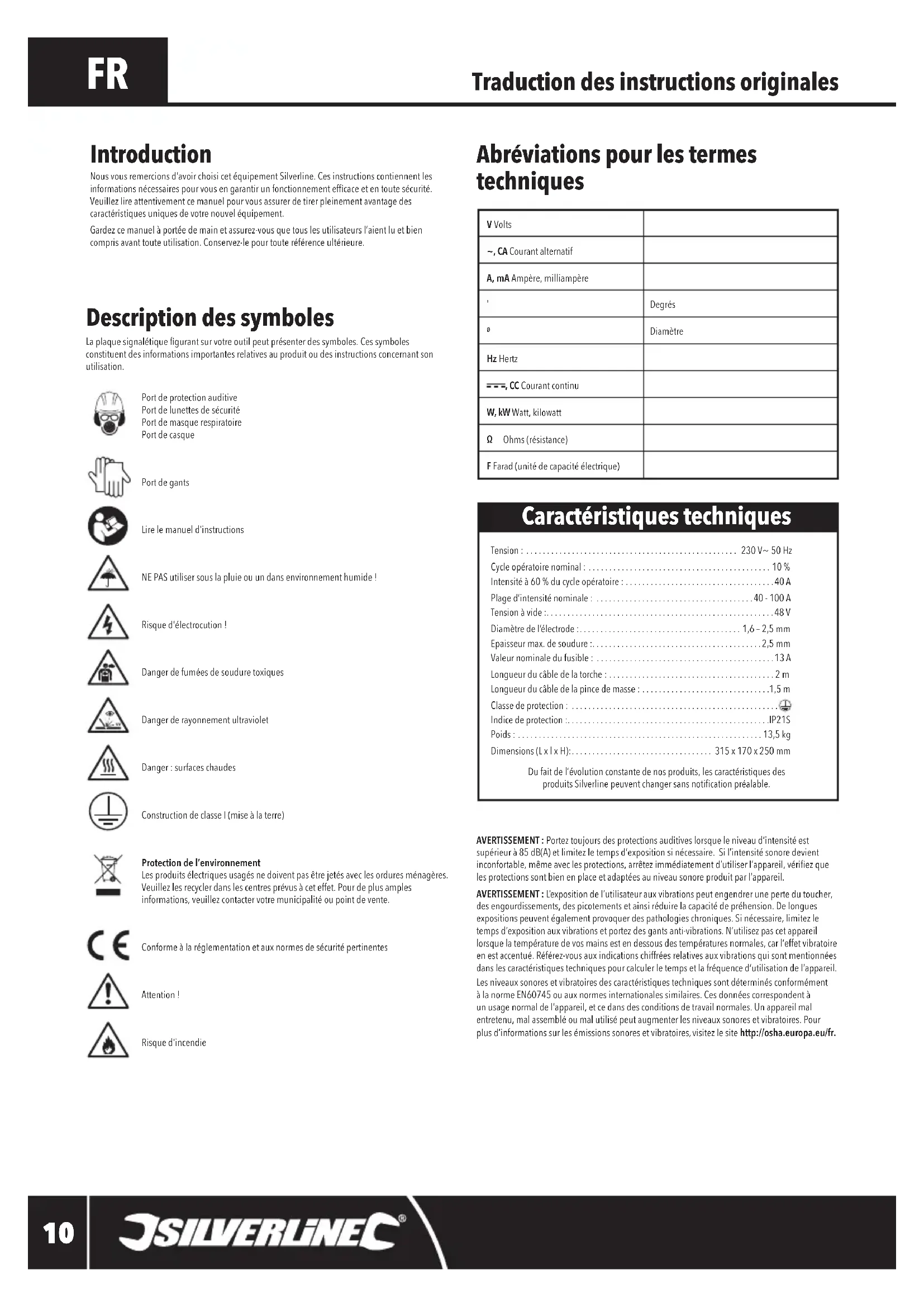 des engourdissements, des picotements et ainsi réduire la capacité de préhension. De longues expositions peuvent également provoquer des pathologies chroniques. Si nécessaire, limitez le temps d’exposition aux vibrations et portez des gants anti-vibrations. N’utilisez pas cet appareil lorsque la température de vos mains est en dessous des températures normales, car l’effet vibratoire en est accentué. Référez-vous aux indications chiffrées relatives aux vibrations qui sont mentionnées dans les caractéristiques techniques pour calculer le temps et la fréquence d’utilisation de l’appareil.Les niveaux sonores et vibratoires des caractéristiques techniques sont déterminés conformément à la norme EN60745 ou aux normes internationales similaires. Ces données correspondent à un usage normal de l’appareil, et ce dans des conditions de travail normales. Un appareil mal entretenu, mal assemblé ou mal utilisé peut augmenter les niveaux sonores et vibratoires. Pour plus d’informations sur les émissions sonores et vibratoires, visitez le site http://osha.europa.eu/fr. Abréviations pour les termes techniques Description des symboles La plaque signalétique gurant sur votre outil peut présenter des symboles. Ces symboles constituent des informations importantes relatives au produit ou des instructions concernant son utilisation.Port de protection auditive Port de lunettes de sécurité Port de masque respiratoire Port de casque Port de gantsLire le manuel d’instructions NE PAS utiliser sous la pluie ou un dans environnement humide !Risque d’électrocution !Danger de fumées de soudure toxiquesDanger de rayonnement ultravioletDanger : surfaces chaudesConstruction de classe I (mise à la terre)Protection de l’environnement Les produits électriques usagés ne doivent pas être jetés avec les ordures ménagères. Veuillez les recycler dans les centres prévus à cet effet. Pour de plus amples informations, veuillez contacter votre municipalité ou point de vente.Conforme à la réglementation et aux normes de sécurité pertinentesAttention !Risque d’incendieV Volts~, CA Courant alternatifA, mA Ampère, milliampère Degrés DiamètreHz Hertz , CC Courant continuW, kW Watt, kilowattΩ Ohms (résistance)F Farad (unité de capacité électrique) Introduction Nous vous remercions d’avoir choisi cet équipement Silverline. Ces instructions contiennent les informations nécessaires pour vous en garantir un fonctionnement efcace et en toute sécurité. Veuillez lire attentivement ce manuel pour vous assurer de tirer pleinement avantage des caractéristiques uniques de votre nouvel équipement. Gardez ce manuel à portée de main et assurez-vous que tous les utilisateurs l’aient lu et bien compris avant toute utilisation. Conservez-le pour toute référence ultérieure. Traduction des instructions originales