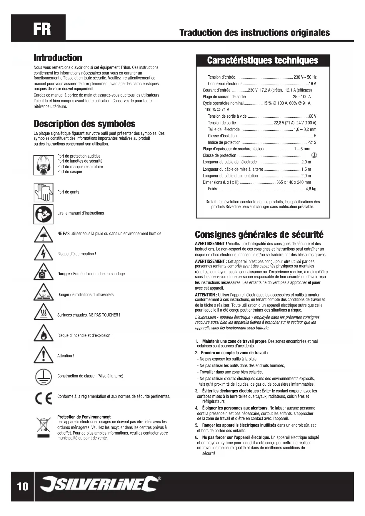 Danger de radiations d’ultraviolets Surfaces chaudes. NE PAS TOUCHER ! Risque d’incendie et d’explosion ! Attention ! Construction de classe I (Mise à la terre) Conforme à la réglementation et aux normes de sécurité pertinentes. Protection de l’environnement Les appareils électriques usagés ne doivent pas être jetés avec les ordures ménagères. Veuillez les recycler dans les centres prévus à cet effet. Pour de plus amples informations, veuillez contacter votre municipalité ou point de vente. Traduction des instructions originales Introduction Nous vous remercions d’avoir choisi cet équipement Triton. Ces instructions contiennent les informations nécessaires pour vous en garantir un fonctionnement efficace et en toute sécurité. Veuillez lire attentivement ce manuel pour vous assurer de tirer pleinement avantage des caractéristiques uniques de votre nouvel équipement. Gardez ce manuel à portée de main et assurez-vous que tous les utilisateurs l’aient lu et bien compris avant toute utilisation. Conservez-le pour toute référence ultérieure. 846386_Z1MANPRO1.indd 10 20/07/2016 16:31www.silverlinetools.com
