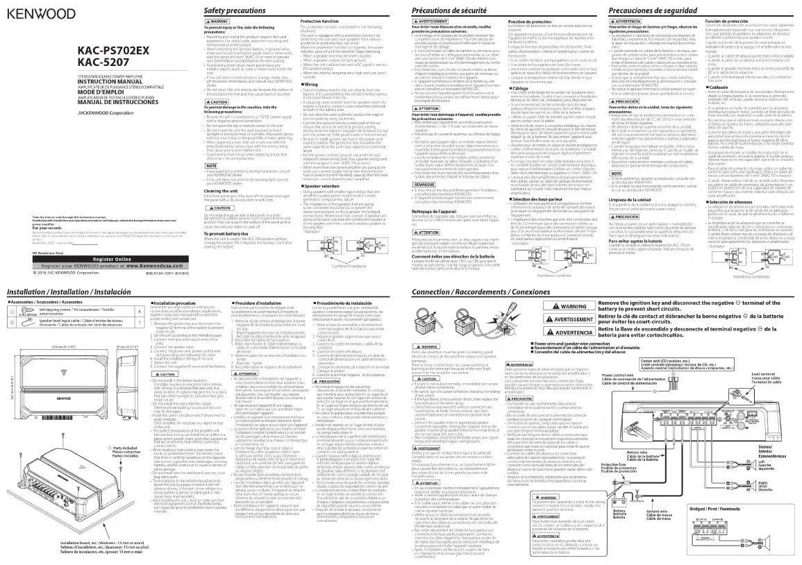 Combined impedanceB5E-0134-10/01 (KH/EH)Take the time to read through this instruction manual.Familiarity with installation and operation procedures will help you obtain the best performance from your new power amplifier.For your records Record the serial number, found on the back of the unit, in the spaces designated on the warranty card, and in the space provided below. Refer to the model and serial numbers whenever you call upon your KENWOOD dealer for information or service on the product.Model KAC-5207 Serial number US Residence Only Register Online Register your KENWOOD product at www.Kenwoodusa.com Précautions de sécurité AVERTISSEMENTPour éviter toute blessure et/ou incendie, veuillez prendre les précautions suivantes:• Le montage et le câblage de ce produit nécessite des compétences et de l'expérience. Pour des raisons de sécurité, laissez un professionnel effectuer le travail de montage et de câblage.• Si vous prolongez un câble de batterie ou de masse, assu-rez vous d’utiliser un câble pour automobile ou un câble avec une section de 5 mm (AWG 10) afin d’éviter tout risque de détérioration ou d’endommagement du revête-ment des câbles.• Pour éviter les court-circuits, ne jamais mettre ou laisser d'objets métalliques (comme une pièce de monnaie ou un outil en métal) à l'intérieur de l'appareil.• Si l'appareil commence à émettre de la fumée ou une odeur bizarre, mettez immédiatement l'appareil hors ten-sion et consultez un revendeur KENWOOD.• Ne pas toucher l’appareil quand il est en service car la température de sa surface est suffisamment élevée pour provoquer des brûlures. ATTENTIONPour éviter tout dommage à l'appareil, veuillez prendre les précautions suivantes:• Bien vérifier que l’appareil est raccordé à une source d’alimentation CC de 12 V avec raccordement de masse négative.• N'ouvrez pas le couvercle supérieur ou inférieur de l'appa-reil.• N'installez pas l'appareil dans un endroit exposé directe-ment à la lumière du soleil, à une chaleur excessive ou à l'humidité. Evitez aussi les endroits trop poussiéreux et où l'appareil risque d'être éclaboussé.• Lors du remplacement d'un fusible, utilisez seulement un fusible neuf avec la valeur indiquée. L'utilisation d'un fusible d'une valeur différente peut être la cause d'un mauvais fonctionnement de votre appareil.• Pour éviter les courts-circuits lors du remplacement d'un fusible, déconnectez d'abord le faisceau de câbles.REMARQUE• Si vous rencontrez des problèmes pendant l'installation, consultez votre revendeur KENWOOD.• Si l'appareil semble ne pas fonctionner correctement, consultez votre revendeur KENWOOD. Nettoyage de l’appareil Si la surface de l’appareil sale, l’essuyer avec un chiffon au silicone ou un chiffon doux et sec après avoir éteint l’appa-reil. ATTENTIONN'essuyez pas le panneau avec un tissu rugueux ou impré-gné de dissolvant volatile comme un diluant à peinture ou de l'alcool. Il pourrait rayer la surface du panneau et/ou écailler les lettres d'informations. Comment éviter une élévation de la batterie Lorsque l’unité est utilisée avec l’ACC sur ON, sans que le moteur ne soit allumé, cela décharge la batterie. Il est préfé-rable de l’utiliser après avoir allumé le moteur. Fonction de protection La fonction de protection se met en service dans les cas suivants:Cet appareil est pourvu d’une fonction de protection de l’appareil lui-même et des haut-parleurs de manière à évi-ter divers incidents.Lorsque la fonction de protection est déclenchée, l’indi-cateur d’alimentation s’éteint et l’amplificateur s’arrête de fonctionner. Si un cordon de liaison aux haut-parleurs est en court-circuit.• Une sortie de haut-parleur est mise à la masse. Une tension continue est appliquée sur les sorties vers les haut-parleurs en raison d’un défaut de fonctionnement de l’appareil.• Lorsque la température interne est trop élevée et que l’appareil ne fonctionne pas. Câblage