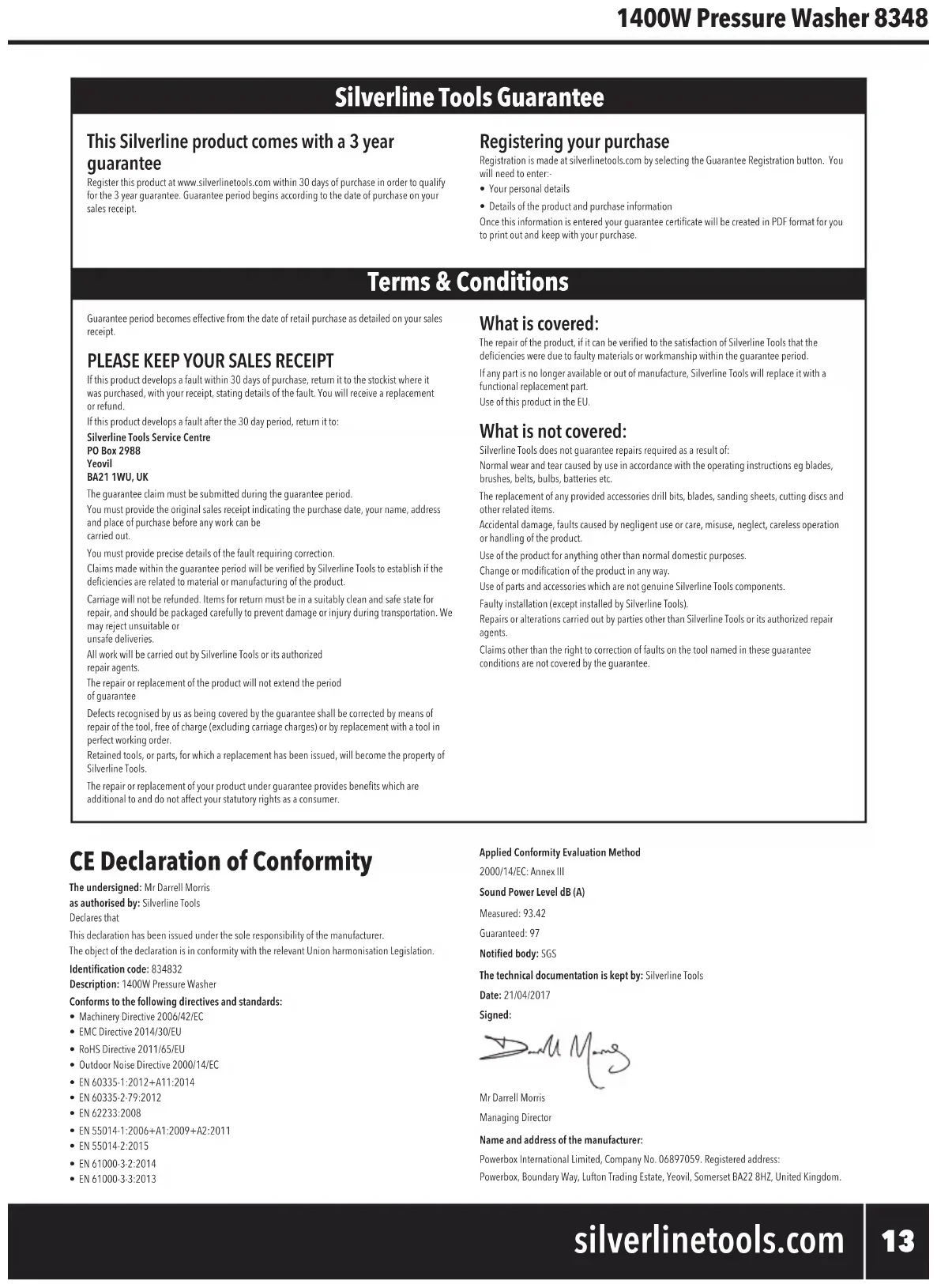 silverlinetools.com Conditions générales Garantie des outils Silverline Ce produit Silverline bénécie d’une garantie de 3 ans Enregistrezceproduitsurlesitesilverlinetools.comdansles30jourssuivantl’achatandebénécierdelagarantiede3ans.Lapériodedegarantiecommenceàpartirdeladated’achatgurantsurvotrefacture. Enregistrement de votre achat Rendez-voussursilverlinetools.com,sélectionnezleboutond’enregistrementetsaisissez:• Vos informations personnelles•Lesinformationsconcernantleproduitetl’achatVousrecevrezlecerticatdegarantieenformatPDF.Veuillezl’imprimeretleconserveravecvotre article.Lapériodedegarantieprendeffetàcompterdeladatedel’achatenmagasinindiquéesurvotre facture. VEUILLEZ CONSERVER VOTRE PREUVE D’ACHAT. Siceproduitestdéfectueuxpendantles30joursquisuiventl’achat,retournez-leaumagasinoùvousl’avezacheté,avecvotrefacture,enexpliquantendétailleproblème.Leproduitseraremplacéouvousserezremboursé(e).Siceproduitestdéfectueuxaprèscettepériodede30jours,retournez-leà:Silverline Tools Service Centre PO Box 2988YeovilBA21 1WU, Royaume UniToutedemandedeservicesousgarantiedoitêtresoumisependantlapériodedegarantie.Avanttouteinterventionsousgarantie,vousdevezprésenterlafactureoriginalesurlaquelledoiventgurerladated’achat,votrenom,votreadresseetlelieud’achat.Vousdevezexpliquerendétailladéfaillancenécessitantréparation.LesdemandesdeservicesousgarantiefaitespendantlapériodedegarantieserontvériéesparSilverlineToolspourétablirsiladéfaillanceduproduitestliéeàunvicedematériauoude fabrication.Lesfraisdeportneserontpasremboursés.Lesarticlesretournésdoiventêtreconvenablementpropresetsûrspourêtreréparésetdevraientêtreemballéssoigneusementpourévitertoutdommageoutouteblessurependantletransport.Nouspouvonsrefuserleslivraisonsquinesont pas convenables ou sûres.TouteinterventionseraeffectuéeparSilverlineToolsousesagentsderéparationagréés.Laréparationouleremplacementduproduitnedépasserapaslapériodedegarantie.Lesanomaliesquenousreconnaissonsêtrecouvertesparlagarantieserontrectiéesparlaréparationdel’outil,sansfrais(hormislesfraisdeport)ouparsonremplacementparunoutilenparfaitétatdefonctionnement.LespiècesoulesoutilsremplacésdeviendrontlapropriétédeSilverlineTools.Laréparationouleremplacementdevotreproduitsousgarantievousapportedes avantages;cesavantagess’ajoutentàvosdroitsstatutairesentantqueconsommateursanslesaffecter aucunement. La présente garantie couvre : Laréparationduproduit,s’ilpeutêtrevérié,àlasatisfactiondeSilverlineTools,quelesdéfaillancesduproduitontétéprovoquéesparunvicedematériauoudefabricationaucoursdelapériodedegarantie.Siunepiècen’estplusdisponibleoun’estplusfabriquée,SilverlineToolslaremplaceraparunepiècederechangeopérationnelle.Utilisationdeceproduitdansl’UE. La présente garantie ne couvre pas : SilverlineToolsnegarantitpaslesréparationsnécessairesduproduitengendréespar:L’usurenormaleprovoquéeparl’utilisationconformeauxinstructionsd’utilisation,parexempledes lames, des balais de charbon, des courroies, des ampoules, des batteries, etc.Leremplacementdetoutaccessoirefournitelquelesforêts,leslames,lesfeuillesabrasives,lesoutilsdecoupesetlesautresarticlesassociés.Lesdommagesetlesdéfaillancesaccidentelscausésparuneutilisationouunentretiennégligent,unemauvaiseutilisation,unmanqued’entretienouuneutilisationouunemanipulation imprudente du produit.L’utilisationduproduitàdesnsautresquesonutilisationdomestiquenormale.Lemoindrechangementoulamoindremodicationduproduit.L’utilisationdepiècesetd’accessoiresquinesontpasdescomposantsvéritablesdeSilverlineTools.Uneinstallationdéfectueuse(saufsil’installationaétéréaliséeparSilverlineTools).LesréparationsoulesmodicationsréaliséespardestiersautresqueSilverlineToolsousesagentsderéparationagréés.Lesdemandesdeserviceautresqueledroitderectierlesdéfaillancesdel’outilindiquéesdansces conditions de garantie ne sont pas couvertes par cette garantie. Déclaration de conformité CE Le soussigné : M. Darrell MorrisAutorisé par : SilverlineToolsDéclareque:Laprésentedéclarationestétabliesouslaresponsabilitéexclusivedufabricant.Laprésentedéclarationdeconformitéestrédigéeconformémentàlalégislationd'harmonisationdel’UnionEuropéennepertinenteDéclarequeleproduit:Code d’identication : 834832Description : Nettoyeur haute pression 1 400 W, 105 BarEst conforme aux directives suivantes : • Directive sur les machines 2006/42/CE • Directivesurlacompatibilitéélectromagnétique2014/30/UE• DirectiveRoHS2011/65/UE• Directiverelativeauxémissionssonoresdesmatérielsutilisésenextérieur2000/14/CE• EN 60335-1:2012+A11:2014• EN 60335-2-79:2012• EN 62233:2008• EN 55014-1:2006+A1:2009+A2:2011• EN 55014-2:2015• EN 61000-3-2:2014• EN 61000-3-3:2013Procédures d'évaluation de la conformité appliquées2000/14/CE : Appendice IIINiveau de la puissance acoustique dB(A)Mesuré:93,42Garanti : 97Organisme notié : SGSLa documentation technique est conservée par : SilverlineToolsDate : 21/04/2017Signature : M. Darrell MorrisDirecteurgénéralNom et adresse du fabricant ou de son représentant agréé :PowerboxInternationalLimited,entrepriseenregistréesouslenuméro06897059.Siègesocial:Powerbox,BoundaryWay,LuftonTradingEstate,Yeovil,SomersetBA228HZ,RoyaumeUni. 834832_Manual.indd 19 31/05/2017 10:35DE
