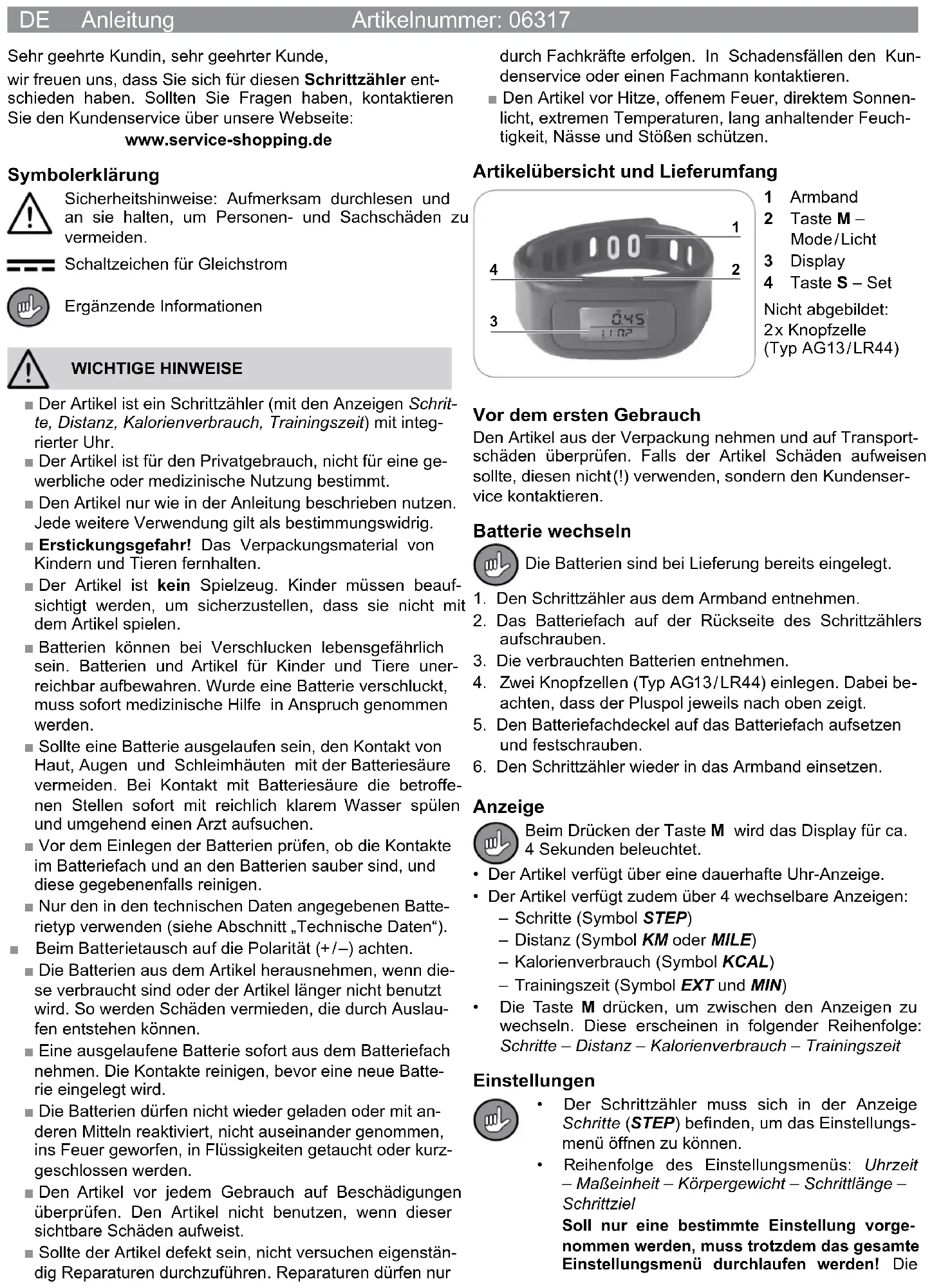 - Store the product in a clean, dry area, which is not ex- posed to direct sunlight and is not accessible to children and animals. Technical data Product number: 06317 Model number: HX-1146-3D Voltage supply: 3 V DC (2 x button cells, type AG13 / LR44) Disposal The packaging material is recyclable. Dispose of the packaging in an environmentally-friendly manner and make it available to the collection service for recyclable materials. Dispose of the product in an environmentally-friendly manner. The product does not belong in the household garbage. Dispose of the product at a recycling centre for old electrical and electronic appliances. You can obtain more information from the administration in your community. Batteries must be removed and disposed of separately before disposing of the product. To protect the environment, batteries and rechargeable batteries must not be disposed of together with normal household waste. Instead they must be turned in at appropriate collection points. Be sure to observe the applicable legal regulations on battery disposal. Z 06317 M DS V1 0117 Product number: 06317FR Mode d’emploi Numéro de référence : 06317 Chère cliente, cher client, merci d’avoir choisi ce podomètre. Si vous avez des ques- tions, veuillez vous adresser au service après-vente sur notre site Internet : www.service-shopping.de Explication des symboles Consignes de sécurité : Lisez-les attentivement et respectez-les pour éviter tout dommage corporel et matériel. Symbole du courant continu Informations complémentaires REMARQUES IMPORTANTES ■ L’article est un podomètre (avec les affi chages Pas, Distance, Consommation de calories, durée d’entraîne- ment) avec horloge intégrée. ■ L’article est destiné à un usage privé, pas à un usage commercial ni médical. ■ N’utilisez l’article que comme décrit dans le mode d’emploi. Toute autre utilisation est considérée comme contraire aux dispositions. ■ Risque d’asphyxie ! Tenez le matériel d’emballage hors de portée des enfants et des animaux. ■ L’article n’est pas un jouet. Surveillez les enfants pour vous assurer qu’ils ne jouent pas avec l’article. ■ Les piles peuvent être mortelles si elles sont avalées. Rangez les piles et l’article hors de portée des enfants et des animaux. Si une pile a été avalée, il faut immédiate- ment demander conseil à un médecin. ■ Si une pile devait couler, évitez tout contact de la peau, des yeux et des muqueuses avec l’acide de la pile. En cas de contact de l’acide des piles, rincez immédiate- ment les endroits concernés avec beaucoup d’eau claire et consultez immédiatement un médecin. ■ Avant de mettre les piles, vérifi ez si les contacts dans le logement à piles et sur les piles sont propres, nettoyez- les si nécessaire. ■ N’utilisez que le type de piles indiqué dans les données techniques (voir paragraphe « Données techniques »). ■ Veillez à la polarité (+ / –) lorsque vous remplacez les piles. ■ Retirez les piles de l’article si elles sont usées ou si vous n’utilisez pas l’article pendant une longue période. Ainsi, vous évitez les dommages que peuvent causer des piles qui coulent. ■ Retirez immédiatement du logement à piles une pile qui coule. Nettoyer les contacts avant de mettre une pile neuve. ■ Les piles ne doivent pas être rechargées ni réactivées par d’autres moyens, elles ne doivent pas être désas- semblées ni jetées dans le feu, dans des liquides, ni encore court-circuitées. ■ Avant chaque utilisation, vérifi ez si l’article n’est pas en- dommagé. N’utilisez pas l’article s’il présente des dom- mages visibles. ■ Si l’article devait être défectueux, n’essayez pas de le réparer vous-même. Les réparations ne pourront être effectuées que par des professionnels. En cas de dom- mages, contactez le service après-vente ou un profes- sionnel. ■ Protéger l’article contre la chaleur, les fl ammes, la lu- mière directe du soleil, les températures extrêmes, l’hu- midité à long terme et les chocs. Vue générale de l’article et contenu de la livraison