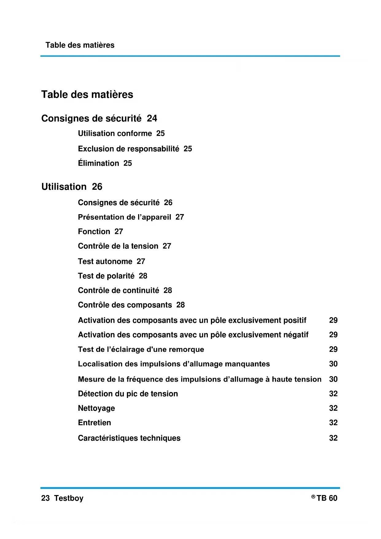 Table des matières Consignes de sécurité 24 Utilisation conforme 25 Exclusion de responsabilité 25 Élimination 25 Utilisation 26 Consignes de sécurité 26 Présentation de l’appareil 27 Fonction 27 Contrôle de la tension 27 Test autonome 27 Test de polarité 28 Contrôle de continuité 28 Contrôle des composants 28 Activation des composants avec un pôle exclusivement positif 29 Activation des composants avec un pôle exclusivement négatif 29 Test de l’éclairage d'une remorque 29 Localisation des impulsions d’allumage manquantes 30 Mesure de la fréquence des impulsions d’allumage à haute tension 30 Détection du pic de tension 32 Nettoyage 32 Entretien 32 Caractéristiques techniques 32Consignes de sécurité Testboy