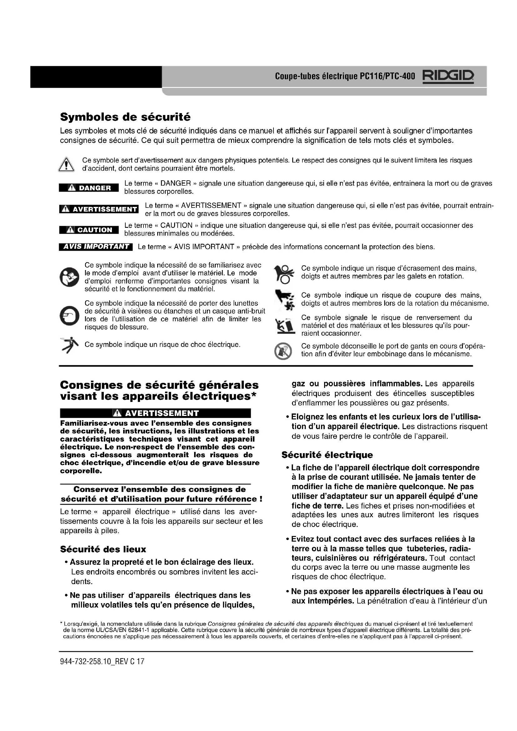 - Lorsqu’exigé, la nomenclature utilisée dans la rubrique Consignes générales de sécurité des appareils électriques du manuel ci-présent et tiré textuellement de la norme UL/CSA/EN 62841-1 applicable. Cette rubrique couvre la sécurité générale de nombreux types d’appareil électrique différents. La totalité des pré- cautions énoncées ne s’applique pas nécessairement à tous les appareils couverts, et certaines d’entre-elles ne s’appliquent pas à l’appareil ci-présent. Ce symbole déconseille le port de gants en cours d’opéra- tion afin d’éviter leur embobinage dans le mécanisme. Ce symbole indique un risque de coupure des mains, doigts et autres membres lors de la rotation du mécanisme. Ce symbole signale le risque de renversement du matériel et des matériaux et les blessures qu’ils pour- raient occasionner.944-732-258.10_REV C18 appareil électrique augmentera les risques de choc électrique.