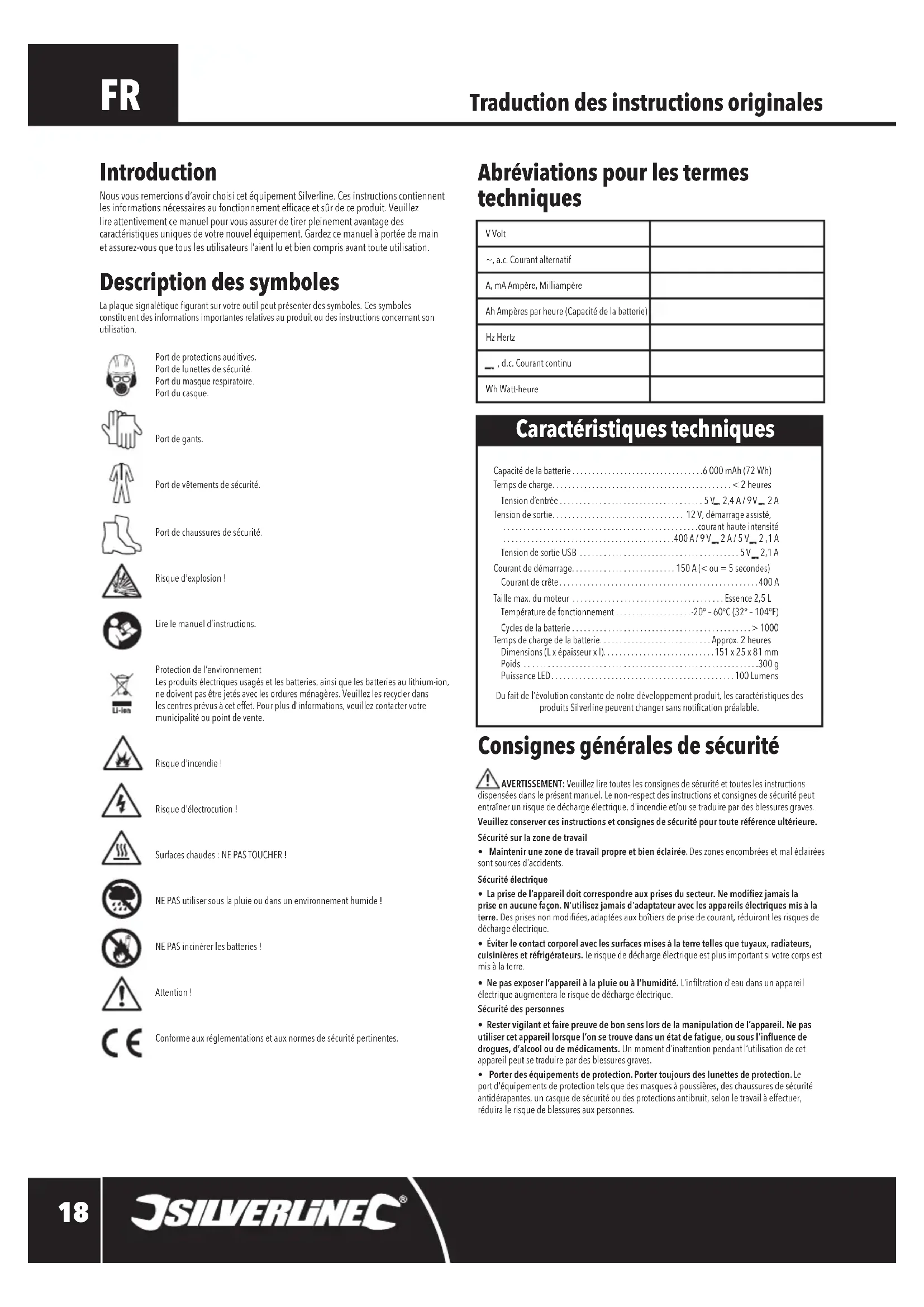 Capacité de la batterie . . . . . . . . . . . . . . . . . . . . . . . . . . . . . . . . .6 000 mAh (72 Wh) Temps de charge.............................................< 2 heures Tension d’entrée . . . . . . . . . . . . . . . . . . . . . . . . . . . . . . . . . . . . 5 V 2,4 A / 9 V 2 A Tension de sortie................................. 12 V, démarrage assisté, .................................................courant haute intensité ...........................................400 A / 9 V 2 A / 5 V 2 ,1 A Tension de sortie USB ........................................5 V 2,1 A Courant de démarrage..........................150 A (< ou = 5 secondes) Courant de crête..................................................400 A Taille max. du moteur ......................................Essence 2,5 L Température de fonctionnement ...................-20° – 60°C (32° – 104°F) Cycles de la batterie . . . . . . . . . . . . . . . . . . . . . . . . . . . . . . . . . . . . . . . . . . . . .> 1000 Temps de charge de la batterie............................Approx. 2 heures Dimensions (L x épaisseur x l)............................151 x 25 x 81 mm Poids ...........................................................300 g Puissance LED..............................................100 Lumens Dufaitdel’évolutionconstantedenotredéveloppementproduit,lescaractéristiquesdesproduitsSilverlinepeuventchangersansnoticationpréalable. Abréviations pour les termes techniques Caractéristiques techniques Consignes générales de sécurité AVERTISSEMENT: Veuillez lire toutes les consignes de sécurité et toutes les instructions dispensées dans le présent manuel. Le non-respect des instructions et consignes de sécurité peut entraînerunrisquededéchargeélectrique,d’incendieet/ousetraduirepardesblessuresgraves.Veuillez conserver ces instructions et consignes de sécurité pour toute référence ultérieure.Sécurité sur la zone de travail
