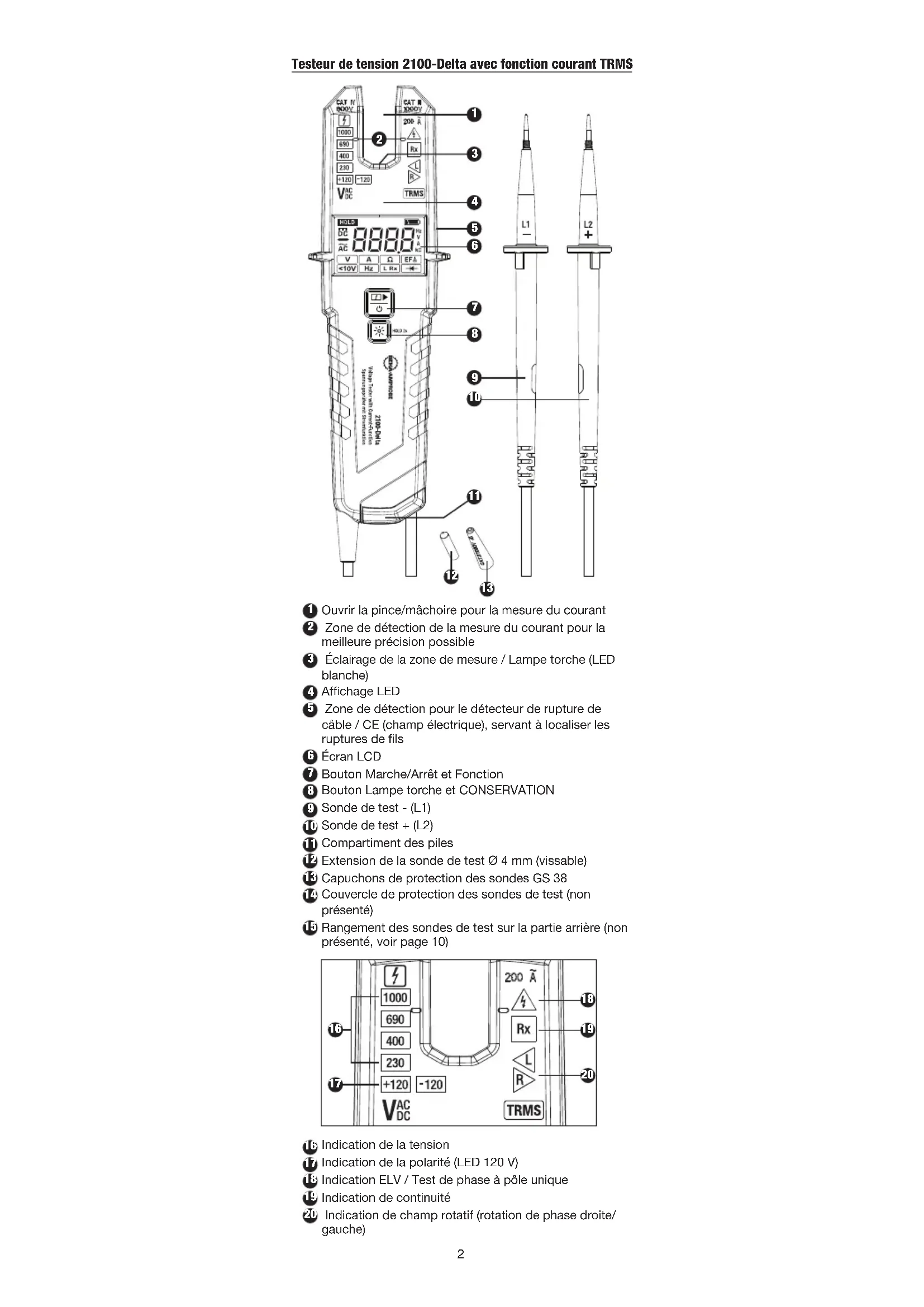 Votre emballage doit contenir: 1 Testeur de tension 2100-Delta avec fonction courant 1 Étui 2 Capuchons de protection des sondes GS 38 2 Extension de la sonde de test Ø 4mm (vissable) 2 Piles alcalines 1,5V, IEC LR03 (installées) 1 Manuel de l'utilisateur Si l'un de ces éléments est manquant ou endommagé, retourner l'emballage complet à votre point d'achat pour un échange. CARACTÉRISTIQUES Le Beha-Amprobe 2100-Delta est un testeur de tension à deux pôles robuste et facile à utiliser pour des vérifications de tension, de continuité et de courant. Le 2100-Delta est destiné aux électriciens dans des applications résidentielles, industrielles et commerciales pour une utilisation dans une large plage de tensions et de classes de sécurité, avec une fabrication conforme à la dernière norme EN 61243-3:2014 pour les testeurs de tension et certifiée GS.