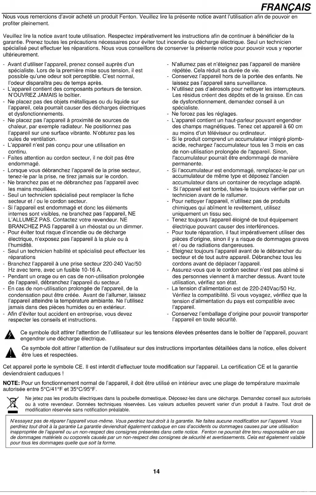 Cambia entre repetición simple y repetición de todo.14 FRANÇAIS Nous vous remercions d’avoir acheté un produit Fenton. Veuillez lire la présente notice avant l’utilisation afin de pouvoir en profiter pleinement. Veuillez lire la notice avant toute utilisation. Respectez impérativement les instructions afin de continuer à bénéficier de la garantie. Prenez toutes les précautions nécessaires pour éviter tout incendie ou décharge électrique. Seul un technicien spécialisé peut effectuer les réparations. Nous vous conseillons de conserver la présente notice pour pouvoir vous y reporter ultérieurement. - Avant d’utiliser l’appareil, prenez conseil auprès d’un spécialiste. Lors de la première mise sous tension, il est possible qu’une odeur soit perceptible. C’est normal, l’odeur disparaîtra peu de temps après. - L’appareil contient des composants porteurs de tension. N’OUVREZ JAMAIS le boîtier. - Ne placez pas des objets métalliques ou du liquide sur l’appareil, cela pourrait causer des décharges électriques et dysfonctionnements. - Ne placez pas l’appareil à proximité de sources de chaleur, par exemple radiateur. Ne positionnez pas l’appareil sur une surface vibrante. N’obturez pas les ouïes de ventilation. - L’appareil n’est pas conçu pour une utilisation en continu. - Faites attention au cordon secteur, il ne doit pas être endommagé. - Lorsque vous débranchez l’appareil de la prise secteur, tenez-le par la prise, ne tirez jamais sur le cordon. - Ne branchez pas et ne débranchez pas l’appareil avec les mains mouillées. - Seul un technicien spécialisé peut remplacer la fiche secteur et / ou le cordon secteur. - Si l’appareil est endommagé et donc les éléments internes sont visibles, ne branchez pas l’appareil, NE L’ALLUMEZ PAS. Contactez votre revendeur. NE BRANCHEZ PAS l’appareil à un rhéostat ou un dimmer. - Pour éviter tout risque d’incendie ou de décharge électrique, n’exposez pas l’appareil à la pluie ou à l’humidité. - Seul un technicien habilité et spécialisé peut effectuer les réparations - Branchez l’appareil à une prise secteur 220-240 Vac/50 Hz avec terre, avec un fusible 10-16 A. - Pendant un orage ou en cas de non-utilisation prolongée de l’appareil, débranchez l’appareil du secteur. - En cas de non-utilisation prolongée de l’appareil, de la condensation peut être créée. Avant de l’allumer, laissez l’appareil atteindre la température ambiante. Ne l’utilisez jamais dans des pièces humides ou en extérieur. - Afin d’éviter tout accident en entreprise, vous devez respecter les conseils et instructions. - N’allumez pas et n’éteignez pas l’appareil de manière répétée. Cela réduit sa durée de vie. - Conservez l’appareil hors de la portée des enfants. Ne laissez pas l’appareil sans surveillance. - N’utilisez pas d’aérosols pour nettoyer les interrupteurs. Les résidus créent des dépôts et de la graisse. En cas de dysfonctionnement, demandez conseil à un spécialiste. - Ne forcez pas les réglages. - L’appareil contient un haut-parleur pouvant engendrer des champs magnétiques. Tenez cet appareil à 60 cm au moins d’un téléviseur ou ordinateur. - Si le produit comprend un accumulateur intégré plomb- acide, rechargez l'accumulateur tous les 3 mois en cas de non-utilisation prolongée de l'appareil. Sinon, l'accumulateur pourrait être endommagé de manière permanente. - Si l’accumulateur est endommagé, remplacez-le par un accumulateur de même type et déposez l’ancien accumulateur dans un container de recyclage adapté. - Si l’appareil est tombé, faites-le toujours vérifier par un technicien avant de le rallumer. - Pour nettoyer l’appareil, n’utilisez pas de produits chimiques qui abîment le revêtement, utilisez uniquement un tissu sec. - Tenez toujours l’appareil éloigné de tout équipement électrique pouvant causer des interférences. - Pour toute réparation, il faut impérativement utiliser des pièces d’origine, sinon il y a risque de dommages graves et / ou de radiations dangereuses. - Eteignez toujours l’appareil avant de le débrancher du secteur et de tout autre appareil. Débranchez tous les cordons avant de déplacer l’appareil. - Assurez-vous que le cordon secteur n’est pas abîmé si des personnes viennent à marcher dessus. Avant toute utilisation, vérifiez son état. - La tension d’alimentation est de 220-240Vac/50 Hz. Vérifiez la compatibilité. Si vous voyagez, vérifiez que la tension d’alimentation du pays est compatible avec l’appareil. - Conservez l’emballage d’origine pour pouvoir transporter l’appareil en toute sécurité. Ce symbole doit attirer l’attention de l’utilisateur sur les tensions élevées présentes dans le boîtier de l’appareil, pouvant engendrer une décharge électrique. Ce symbole doit attirer l’attention de l’utilisateur sur des instructions importantes détaillées dans la notice, elles doivent être lues et respectées. Cet appareil porte le symbole CE. Il est interdit d’effectuer toute modification sur l’appareil. La certification CE et la garantie deviendraient caduques ! NOTE: Pour un fonctionnement normal de l’appareil, il doit être utilisé en intérieur avec une plage de température maximale autorisée entre 5°C/41°F et 35°C/95°F. Ne jetez pas les produits électriques dans la poubelle domestique. Déposez-les dans une décharge. Demandez conseil aux autorisés ou à votre revendeur. Données techniques réservées. Les valeurs actuelles peuvent varier d’un produit à l’autre. Tout droit de modification réservée sans notification préalable.