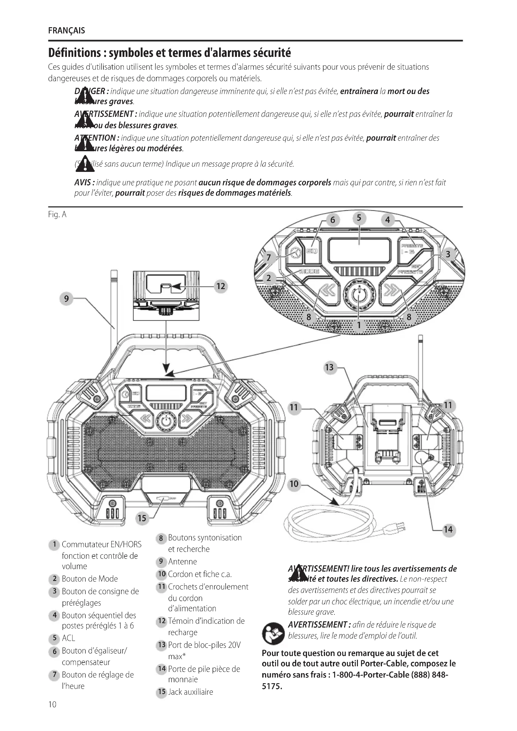 Cette radio/chargeur est conçue pour la réception d'émissions hertziennes, la reproduction de lecture de pièces musicales par connexion matérielle à un téléphone cellulaire ou autre dispositif audio, et pour recharger les blocs-piles PORTERCABLE. nE PAs utiliser en conditions mouillées ou en présence de liquides ou de gaz inflammables. nE PAs laisser les enfants entrer en contact avec l’outil. Une supervision est requise lorsque des utilisateurs inexpérimentés se servent cet outil. FONCTIONNEMENT Installation de pile type pièce de monnaie (Fig. B) Votre radio possède une puce mémoire pour emmagasiner les postes pré-réglés et l’heure. Lorsque la radio est éteinte, cette mémoire est alimentée par une pile bouton comprise dans la radio. REMARQUE: Pour activer la mémoire, avant la première utilisation de la radio, retirer la languette protectrice sous le couvercle de la pile bouton.
