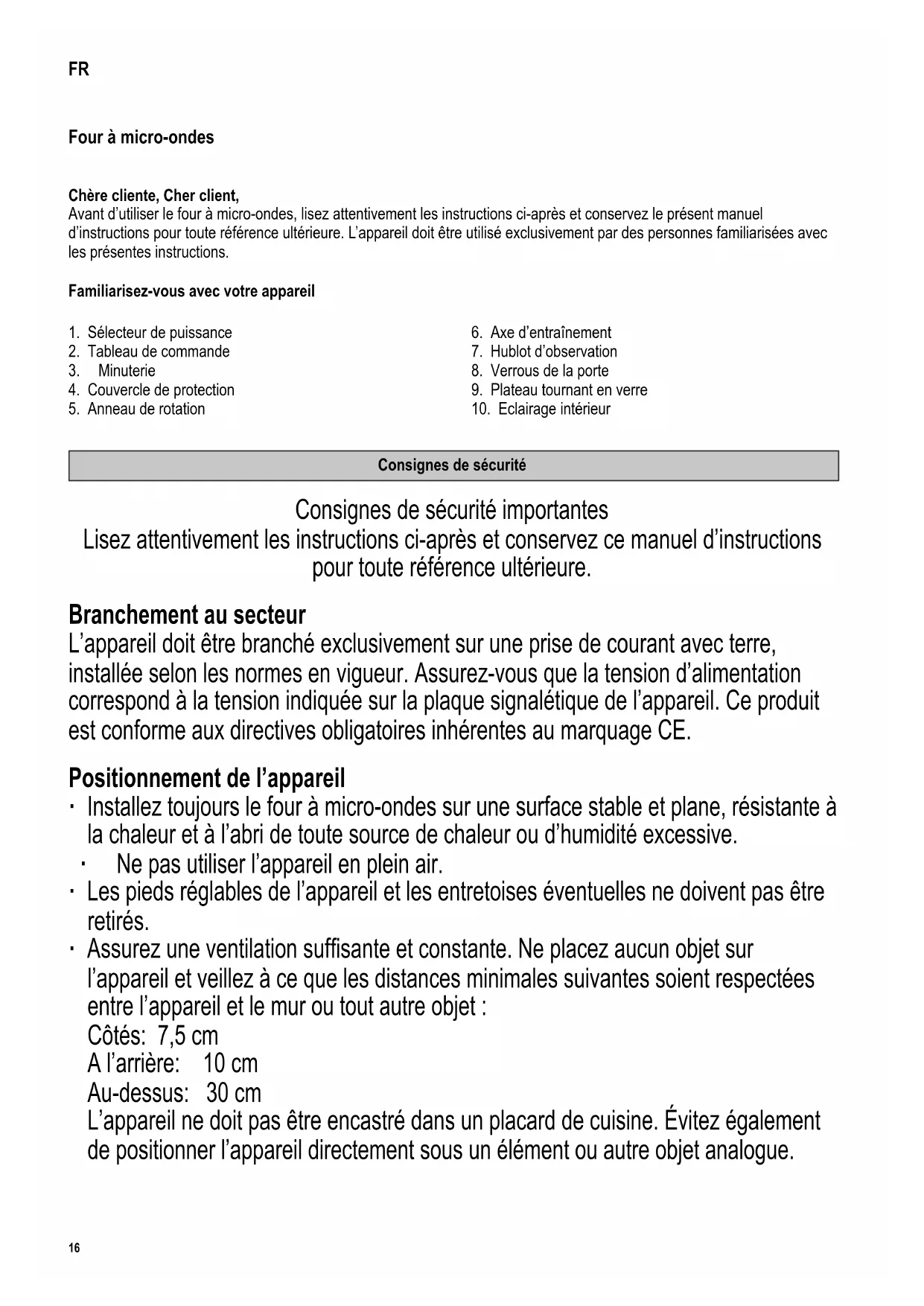 Consignes de sécurité Consignes de sécurité importantes Lisez attentivement les instructions ci-après et conservez ce manuel d’instructions pour toute référence ultérieure. Branchement au secteur L’appareil doit être branché exclusivement sur une prise de courant avec terre, installée selon les normes en vigueur. Assurez-vous que la tension d’alimentation correspond à la tension indiquée sur la plaque signalétique de l’appareil. Ce produit est conforme aux directives obligatoires inhérentes au marquage CE. Positionnement de l’appareil ∙ Installez toujours le four à micro-ondes sur une surface stable et plane, résistante à la chaleur et à l’abri de toute source de chaleur ou d’humidité excessive. ∙ Ne pas utiliser l’appareil en plein air. ∙ Les pieds réglables de l’appareil et les entretoises éventuelles ne doivent pas être retirés. ∙ Assurez une ventilation sufsante et constante. Ne placez aucun objet sur l’appareil et veillez à ce que les distances minimales suivantes soient respectées entre l’appareil et le mur ou tout autre objet : Côtés: 7,5 cm A l’arrière: 10 cm Au-dessus: 30 cm L’appareil ne doit pas être encastré dans un placard de cuisine. Évitez également de positionner l’appareil directement sous un élément ou autre objet analogue.17 142 x 208 mm Remarques importantes ∙ Attention : Certains types d’aliments peuvent s’enammer. Ne faites jamais fonctionner l’appareil sans surveillance. ∙ Ce four à micro-ondes a été conçu exclusivement pour la décongélation, le réchauffage et la cuisson d’aliments. Attention : Le séchage d’aliments ou de vêtements et, le réchauffage de coussins de noyaux de cerises, de chaussons, d’éponges, de serpillières mouillées, etc. peut entraîner des risques de blessures, combustion ou feu. ∙ Nous déclinons toute responsabilité en cas de dommages résultant d’une utilisation erronée ou de la non-conformité aux présentes instructions. ∙ Utilisez uniquement des ustensiles de cuisine adaptés au four à micro-ondes. N’utilisez pas de récipients métalliques pour réchauffer de la nourriture et des boissons en mode four à micro-ondes. Pour des informations plus détaillées, veuillez vous référer au paragraphe ‘Utilisez toujours des ustensiles de cuisine appropriés’. ∙ L’appareil n’est pas destiné à être utilisé avec un programmateur externe ou une télécommande indépendante. ∙ Cet appareil peut être utilisé par des enfants (à partir de 8 ans) et par des personnes souffrant de déciences physiques, sensorielles ou mentales, ou manquant d’expérience ou de connaissances, s’ils ont été formés à l’utilisation de l’appareil et ont été supervisés, et s’ils en comprennent les dangers et les précautions de sécurité à prendre. ∙ Les enfants ne sont pas autorisés à jouer avec l’appareil. ∙ Les enfants ne doivent pas être autorisés à nettoyer ou à entreprendre des travaux de maintenance sur l’appareil à moins d’être supervisés. ∙ L’appareil et son cordon d’alimentation doivent être, à tout moment, tenus hors de portée des enfants de moins de 8 ans. ∙ Pour éviter le risque de chocs électriques, ne pas nettoyer l’appareil avec du liquide et ne pas le plonger dans du liquide. ∙ Il est déconseillé de nettoyer l’appareil en utilisant un jet d’eau. ∙ Éteignez toujours l’appareil et débranchez la che de la prise de courant: - avant tout nettoyage, - en cas de fonctionnement défectueux. - Après chaque utilisation. ∙ Ne débranchez pas l’appareil en tirant sur le cordon ; tirez toujours sur la che. Ne touchez pas la che avec les mains mouillées.