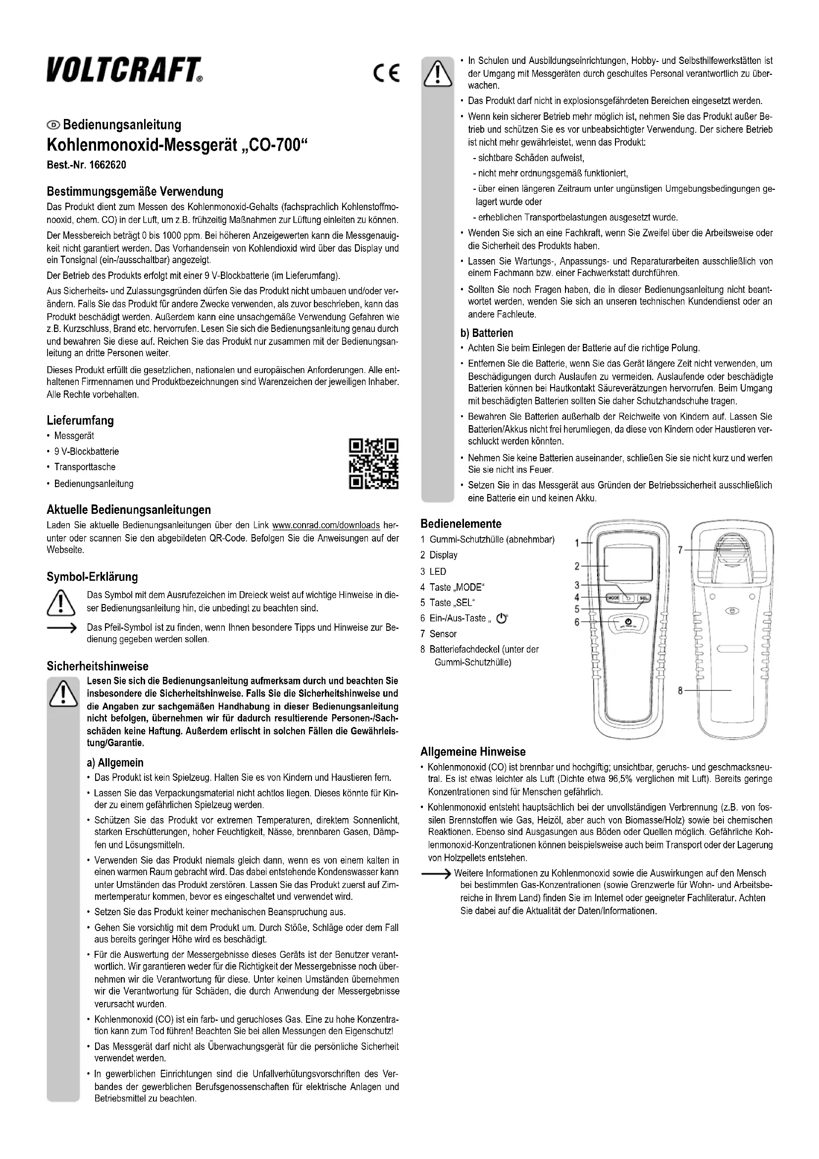 - N‘utilisez en aucun cas des produits de nettoyage agressifs, de l‘alcool de nettoyage ou d‘autres solutions chimiques, car ces produits risquent d‘attaquer le boîtier ou même son bon fonctionnement. Élimination a) Produit Les appareils électroniques sont des objets recyclables et ils ne doivent pas être éliminés avec les ordures ménagères. Procédez à l‘élimination du produit au terme de sa durée de vie conformément aux dispositions légales en vigueur. Retirez une pile éventuellement insérée et éliminez-la séparément du produit. b) Piles/batteries Le consommateur nal est légalement tenu (ordonnance relative à l‘élimination des piles usa- gées) de rapporter toutes les piles/batteries rechargeables usées ; il est interdit de les jeter dans les ordures ménagères. Les piles et batteries contenant des substances polluantes sont marquées par le symbole indiqué ci-contre qui signale l‘interdiction de les éliminer avec les ordures ordinaires. Les désignations pour les principaux métaux lourds sont : Cd = cad- mium, Hg = mercure, Pb = plomb (L‘indication se trouve sur les piles/batteries, par ex. sous le symbole de la poubelle dessiné à gauche). Vous pouvez rapporter gratuitement vos piles/piles rechargeables usagées aux centres de récupération de votre commune, à nos succursales ou à tous les points de vente de piles/piles rechargeables. Vous respecterez ainsi les obligations légales et contribuerez à la protection de l‘environne- ment. Caractéristiques techniques Tension de service ................................ 1x pile bloc de 9 V Consommation de courant ...................max. 10 mA pendant le fonctionnement, ~5 µA éteint. Plage de mesure ..................................de 0 à 1000 ppm CO La précision de mesure ne peut pas être garantie lors d’afchage de valeurs plus élevées. Résolution .............................................1 ppm Précision ...............................................±5 % ou ± 10 ppm (pour la plage de 0 à 1000 ppm) Type de capteur ....................................Cellule de mesure électrochimique du CO Durée de vie du capteur ....................... 3 ans (moyenne) Temps de préchauffage ........................ <2 s Conditions de fonctionnement .............. 0 °C à +50 °C; humidité relative max. 90% sans condensation Conditions de stockage ........................ de -10 °C à +60 °C, humidité relative max. 80%, non condensant Dimensions ...........................................166 x 63 x 42 mm (L x P x H) Poids .....................................................environ 230 g (avec la pile)• In scholen en opleidingscentra, hobbyruimten en werkplaatsen dient geschoold personeel voldoende toezicht te houden op het gebruik van meetinstrumenten.