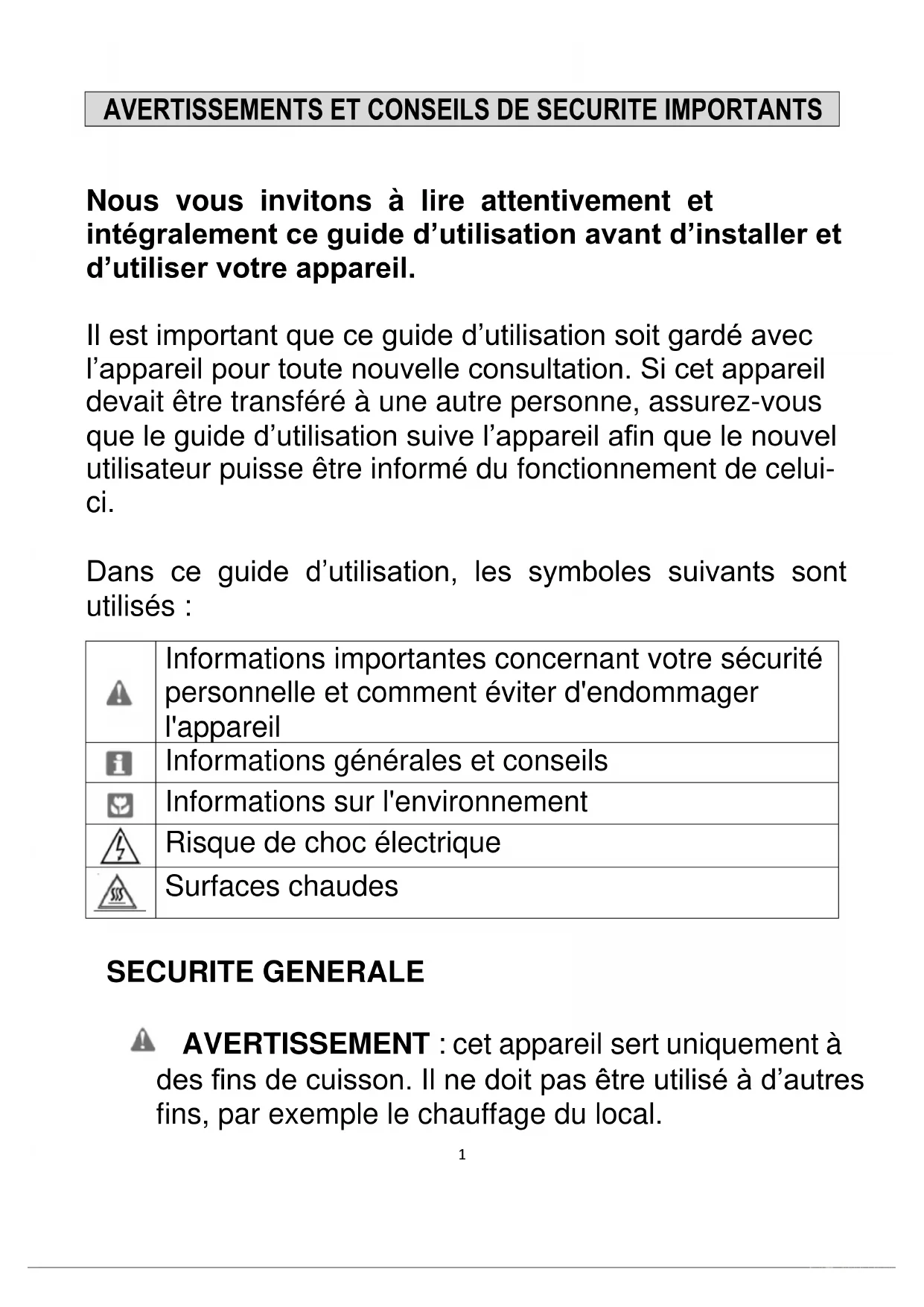 Nous vous invitons à lire attentivement et intégralement ce guide d’utilisation avant d’installer et d’utiliser votre appareil. Il est important que ce guide d’utilisation soit gardé avec l’appareil pour toute nouvelle consultation. Si cet appareil devait être transféré à une autre personne, assurez-vous que le guide d’utilisation suive l’appareil afin que le nouvel utilisateur puisse être informé du fonctionnement de celui- ci. Dans ce guide d’utilisation, les symboles suivants sont utilisés : SECURITE GENERALE