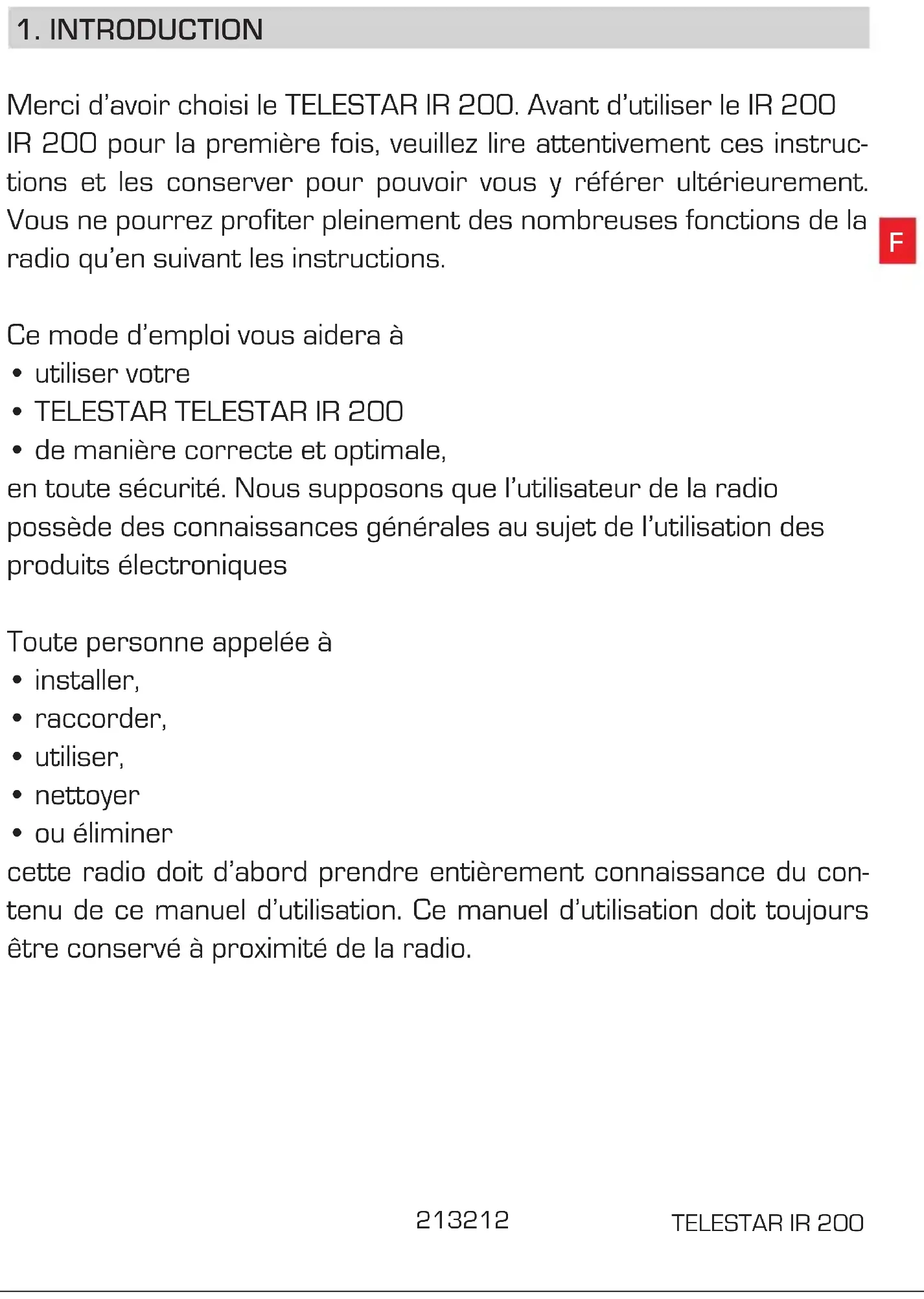 Merci d’avoir choisi le TELESTAR IR 200. Avant d’utiliser le IR 200 IR 200 pour la première fois, veuillez lire attentivement ces instruc- tions et les conserver pour pouvoir vous y référer ultérieurement. Vous ne pourrez profiter pleinement des nombreuses fonctions de la radio qu’en suivant les instructions. Ce mode d’emploi vous aidera à