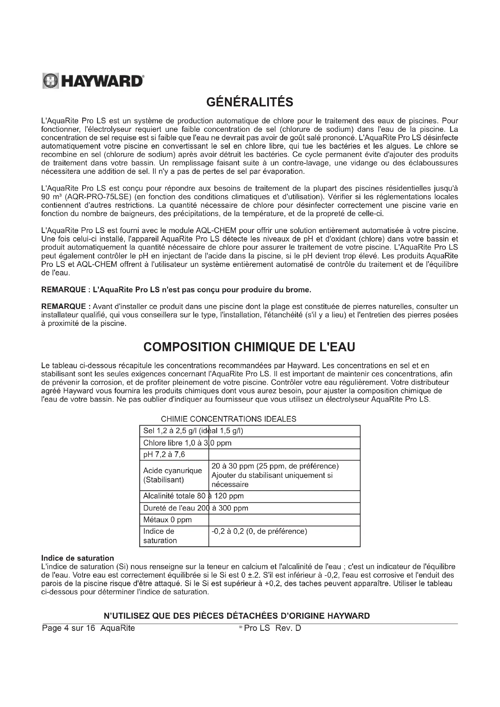 Sel 1,2 à 2,5 g/l (idéal 1,5 g/l) Chlore libre 1,0 à 3,0 ppm pH 7,2 à 7,6 Acide cyanurique (Stabilisant) 20 à 30 ppm (25 ppm, de préférence) Ajouter du stabilisant uniquement si nécessaire Alcalinité totale 80 à 120 ppm Dureté de l'eau 200 à 300 ppm Métaux 0 ppm Indice de saturation -0,2 à 0,2 (0, de préférence) Indice de saturation L'indice de saturation (Si) nous renseigne sur la teneur en calcium et l'alcalinité de l'eau ; c'est un indicateur de l'équilibre de l'eau. Votre eau est correctement équilibrée si le Si est 0 ±.2. S'il est inférieur à -0,2, l'eau est corrosive et l'enduit des parois de la piscine risque d'être attaqué. Si le Si est supérieur à +0,2, des taches peuvent apparaître. Utiliser le tableau ci-dessous pour déterminer l'indice de saturation.N’UTILISEZ QUE DES PIÈCES DÉTACHÉES D’ORIGINE HAYWARD Page 5 sur 16 AquaRite
