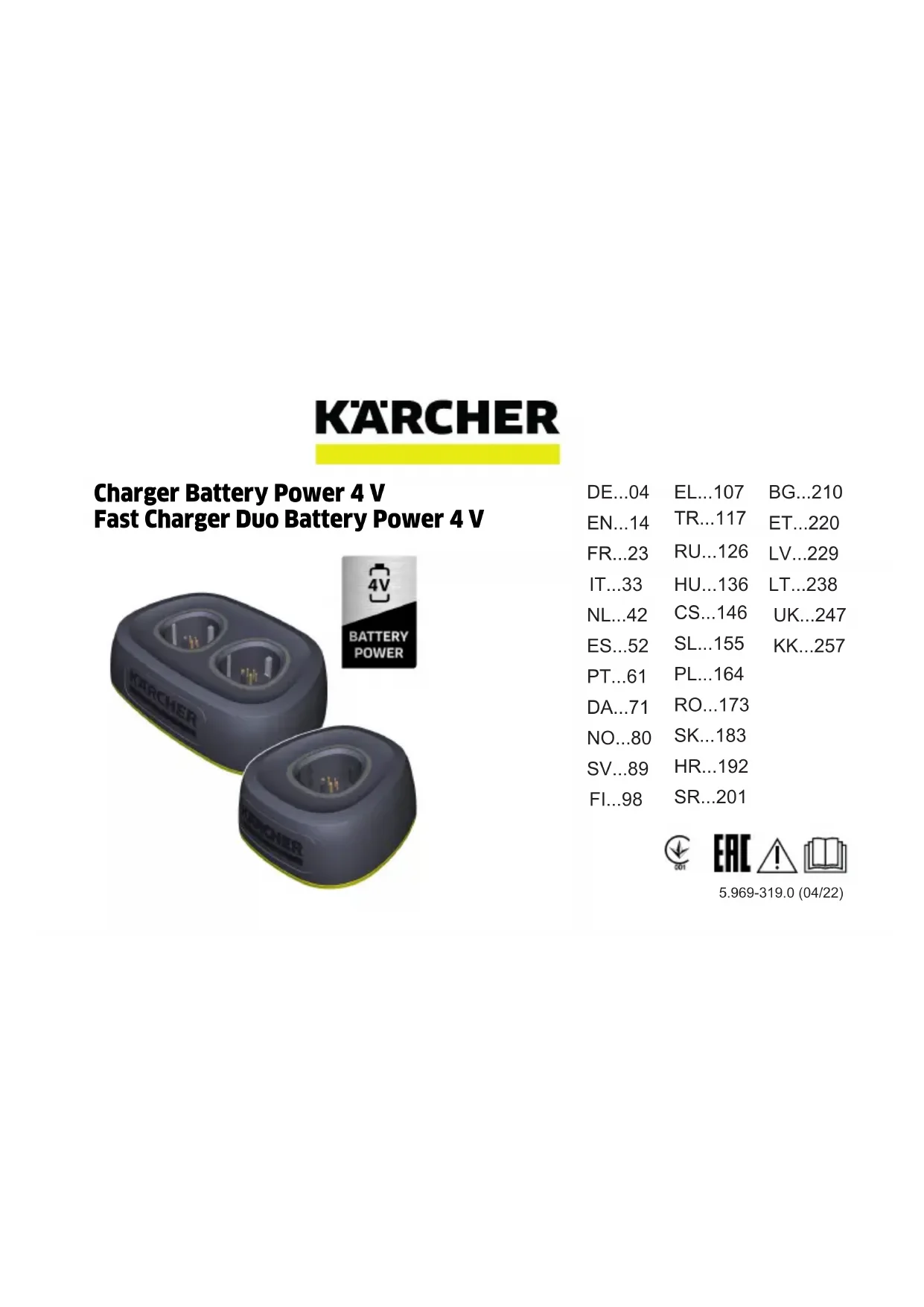 - Caractéristiques techniques BC 4 V Duo BC 4 V24 Français Remarques générales Avant la première utilisation, veuillez lire cette notice originale ainsi que les notices originales et les consignes de sécurité accompagnant le bloc-batterie et l'appareil. Ces instructions décrivent plusieurs chargeurs du système Battery Power 4 V (voir chapitre « Caractéristiques techniques »). Nous signalons les différences éventuelles de fonctionnement séparément dans le texte. Niveaux de danger DANGER ● Indique un danger immédiat qui peut entraîner de graves blessures corporelles ou la mort. 몇 AVERTISSEMENT ● Indique une situation potentiellement dangereuse qui peut entraîner de graves blessures corporelles ou la mort. 몇 PRÉCAUTION ● Indique une situation potentiellement dangereuse qui peut entraîner des blessures légères. ATTENTION ● Indique une situation potentiellement dangereuse qui peut entraîner des dommages matériels. Consignes de sécurité DANGER ● Risque d'explosion. Ne pas charger de batteries non-rechargeables. ● N'utiliser le chargeur que pour charger les blocs-batteries autorisés. ● Vérifier l'absence de dommages sur le chargeur, le compartiment de charge et le bloc secteur avant toute utilisation. Ne jamais utiliser d’appareils endommagés. Remplacer l’appa- reil en cas de dommage. ● Vérifier l'absence de dommages sur le câble secteur avant chaque utilisation. Ne pas utiliser d'appareils avec un câble secteur endommagé. En cas de dommages, contacter KÄRCHER ou l'un de nos partenaires de service. ● Ne pas charger les blocs-batteries endommagés ou incomplètement fonctionnels. Élimi-Français 25 ner immédiatement les blocs-batteries endommagés ou non fonctionnels conformément aux réglementations ap- plicables en matière de transport et d'élimination. ● Ne pas utiliser le chargeur dans un environnement explosif ou à proximité d'objets inflammables. ● Ne pas plonger l'appareil dans l'eau et ne pas le tenir pas sous un jet d'eau. ● Ne pas charger le bloc-batterie sans surveillance. Vérifier régulièrement l'état du bloc-batterie et du chargeur pendant le processus de charge. ● Si un défaut, une odeur inhabituelle ou un développement de chaleur sont re- marqués pendant la charge, débrancher le chargeur du secteur et le bloc-batterie du chargeur. Éliminer immédia- tement le bloc-batterie et le chargeur et respecter les réglementations en vigueur en matière de transport et d'élimination. 몇 AVERTISSEMENT ● Vérifier la conformité de la tension du secteur avec la tension indiquée sur la plaque signalétique du chargeur. ● Protéger le câble et le bloc secteur contre la chaleur, les bords tranchants, l'huile et les pièces mobiles de l’appareil. ● Ne jamais ouvrir le chargeur. Faire exécuter les réparations uniquement par du personnel qualifié. ● Retirer le bloc secteur de la prise secteur avant de nettoyer le chargeur ou d’effectuer une maintenance. ● Les personnes dont les capacités physiques, sensorielles ou mentales sont réduites ou qui manquent d'expérience et de connaissance ne peuvent utiliser l'appareil que si elles sont sous surveillance ou ont été instruites sur l'utilisation sûre de l'appareil par une personne responsable de leur sécurité et comprennent les dangers qui en résultent. ● Les enfants ne sont pas autorisés à jouer avec l’appareil. ● Surveiller les enfants pour assurer qu'ils ne jouent pas avec l'appareil. ● Les enfants peuvent utiliser l'appareil à partir de l'âge minimum de 8 ans, s'ils ont été instruits par une personne compétente de son utilisation et des consignes de sécurité ou s'ils sont parfaitement surveillés et s'ils ont compris les dangers pouvant en résulter. ● Les enfants ne peuvent effectuer le nettoyage et l'entretien de l'appareil que sous surveillance. 몇 PRÉCAUTION ● Ne pas utiliser l'appareil conjointement avec d'autres appareils sur des câbles de ral- longe équipés de prises multiples. ● Ne pas débrancher le bloc secteur de la prise en tirant sur le câble secteur. ● Ne jamais utiliser le chargeur dans un état mouillé ou sale. ● Ne jamais insérer le bloc-batterie mouillé ou sale dans le compartiment de charge du chargeur. ● Ne pas utiliser le chargeur dans un environnement poussiéreux.26 Français ATTENTION ● Risque de court-circuit. Protéger des pièces en métal les contacts de charge. ● Ne jamais re- couvrir le chargeur pendant le fonctionnement. ● Ne jamais porter le chargeur par le câble secteur. ● N'utiliser le chargeur que dans les pièces sèches présentant une faible humidité. Utilisation conforme 몇 PRÉCAUTION Risque d'explosion ! Risque de blessures et de dommages matériels en cas d'explosion du bloc-batterie. Ne pas charger de blocs-batteries défectueux ou pas entièrement fonctionnels. Les changements et les modifications non autorisées par le fabricant sont interdits. Toute autre utilisation est interdite. L'utilisateur est seul responsable des risques découlant d'une utilisation non autorisée. Charger uniquement les blocs-batteries du système KÄRCHER Battery Power 4 V. Remarque Les blocs-batteries adaptés disposent du symbole BP 4 V. Les informations de tension se trouvent sur l'appareil, sur le bloc-batterie et sur sa plaque signalétique. Protection de l'environnement Les matériaux d'emballage sont recyclables. Veuillez éliminer les emballages dans le respect de l’environ- nement.Français 27 Les appareils électriques et électroniques contiennent des matériaux précieux recyclables et souvent des composants tels que des piles, batteries ou de l’huile représentant un danger potentiel pour la santé humaine et l'environnement, s'ils ne sont pas manipulés ou éliminés correctement. Ces composants sont cependant nécessaires pour le fonctionnement correct de l'appareil. Les appareils marqués par ce symbole ne doivent pas être jetés dans les ordures m