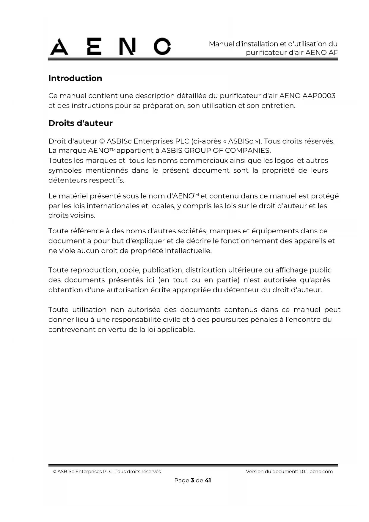 Introduction Ce manuel contient une description détaillée du purificateur d'air AENO AAP0003 et des instructions pour sa préparation, son utilisation et son entretien. Droits d'auteur Droit d'auteur © ASBISc Enterprises PLC (ci-après « ASBISc »). Tous droits réservés. La marque AENO
