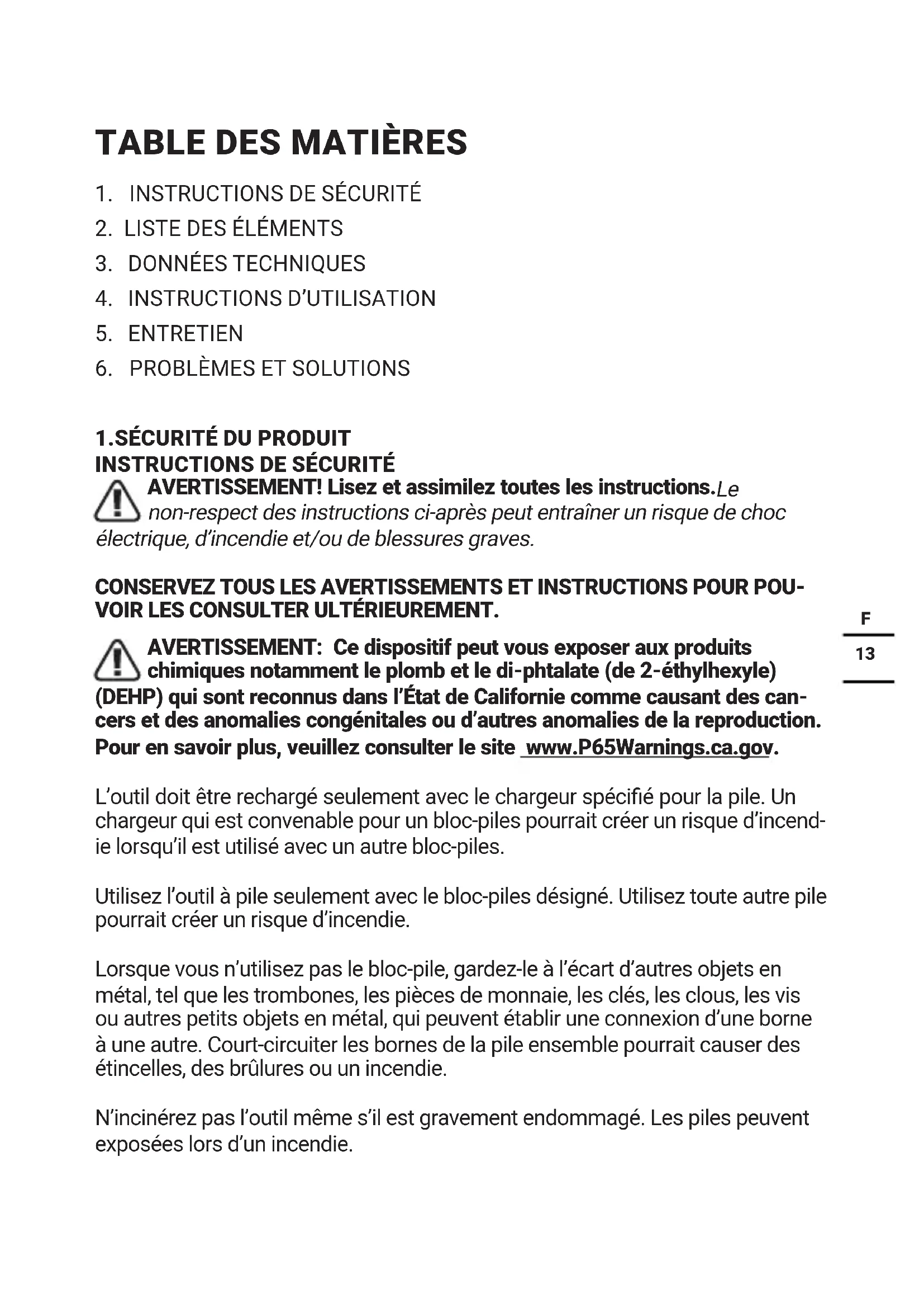 chimiques notamment le plomb et le di-phtalate (de 2-éthylhexyle) (DEHP) qui sont reconnus dans l’État de Californie comme causant des can- cers et des anomalies congénitales ou d’autres anomalies de la reproduction. Pour en savoir plus, veuillez consulter le site www.P65Warnings.ca.gov. L’outil doit être rechargé seulement avec le chargeur spécié pour la pile. Un chargeur qui est convenable pour un bloc-piles pourrait créer un risque d’incend- ie lorsqu’il est utilisé avec un autre bloc-piles. Utilisez l’outil à pile seulement avec le bloc-piles désigné. Utilisez toute autre pile pourrait créer un risque d’incendie. Lorsque vous n’utilisez pas le bloc-pile, gardez-le à l’écart d’autres objets en métal, tel que les trombones, les pièces de monnaie, les clés, les clous, les vis ou autres petits objets en métal, qui peuvent établir une connexion d’une borne à une autre. Court-circuiter les bornes de la pile ensemble pourrait causer des étincelles, des brûlures ou un incendie. N’incinérez pas l’outil même s’il est gravement endommagé. Les piles peuvent exposées lors d’un incendie.14
