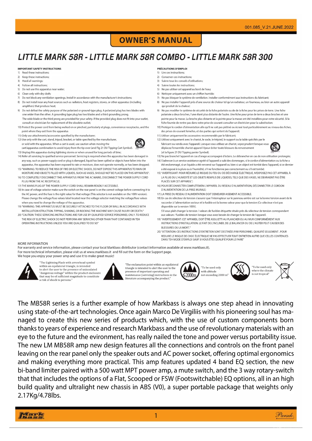 été endommagé, si un liquide a été renversé sur l’appareil ou bien si un object est tombé dans l’appareil, si ce dernier a été exposé à la pluie ou à l’humidité, s’il ne fonctionne pas correctement ou s’il est tombé;15) “AVERTISSANT: POUR RÉDUIRE LE RISQUE DU FEU OU DE DÉCHARGE ÉLECTRIQUE, N’EXPOSEZ PAS CET APPAREIL À LA PLUIE OU L’HUMIDITÉ ET LES OBJETS REMPLIS DE LIQUIDES; TELS QUE DES VASES, NE DEVRAIENT PAS ÊTRE PLACÉS SUR CET APPAREIL”;16) POUR DÉCONNECTER COMPLETEMEN L’APPAREIL DU RESEAU D’ALIMENTATION, DÉCONNECTER LE CORDON D’ALIMENTATION DE LA PRISE MURALE;17) LA PRISE DU RESEAU D’ALIMENTATION DOIT DEMEURER AISEMENT ACCESSIBLE. 18) En cas de sélecteur de tension s'assurer que l'interrupteur sur le panneau arrière est sur la bonne tension avant de le raccorder à l'alimentation secteur et le fusible est la bonne valeur pour que la tension (Ce sélecteur n'est pas disponible sur la version 100V). S'il vous plaît changer la tension / valeurs de fusibles étiquette située près du sélecteur de tension correspondant aux valeurs / fusibles de tension lorsque vous avez besoin de changer la tension de l'appareil.19) “AVERTISSEMENT: CET APPAREIL DOIT ÊTRE ASSUJETTI AU PLANCHER OU AU MUR CONFORMÉMENT AUX INSTRUCTIONS D’INSTALLATION. LE FAIT DE L’INCLINER, DE LE BALANCER OU DE L’AGITER PEUT CAUSER DES BLESSURES OU LA MORT.”20) “ATTENTION: CES INSTRUCTIONS D'ENTRETIEN SONT DESTINÉES PAR PERSONNEL QUALIFIÉ SEULEMENT . POUR REDUIRE LE RISQUE DE CHOC ÉLECTRIQUE NE PAS EFFECTUER TOUT ENTRETIEN AUTRE QUE CELLES CONTENUES DANS TEH MODE D'EMPLOI SAUF SI VOUS ÊTES QUALIFIÉ POUR LE FAIRE” LITTLE MARK 58R - LITTLE MARK 58R COMBO - LITTLE MARK 58R 300 001.085_V.21.JUNE.2022