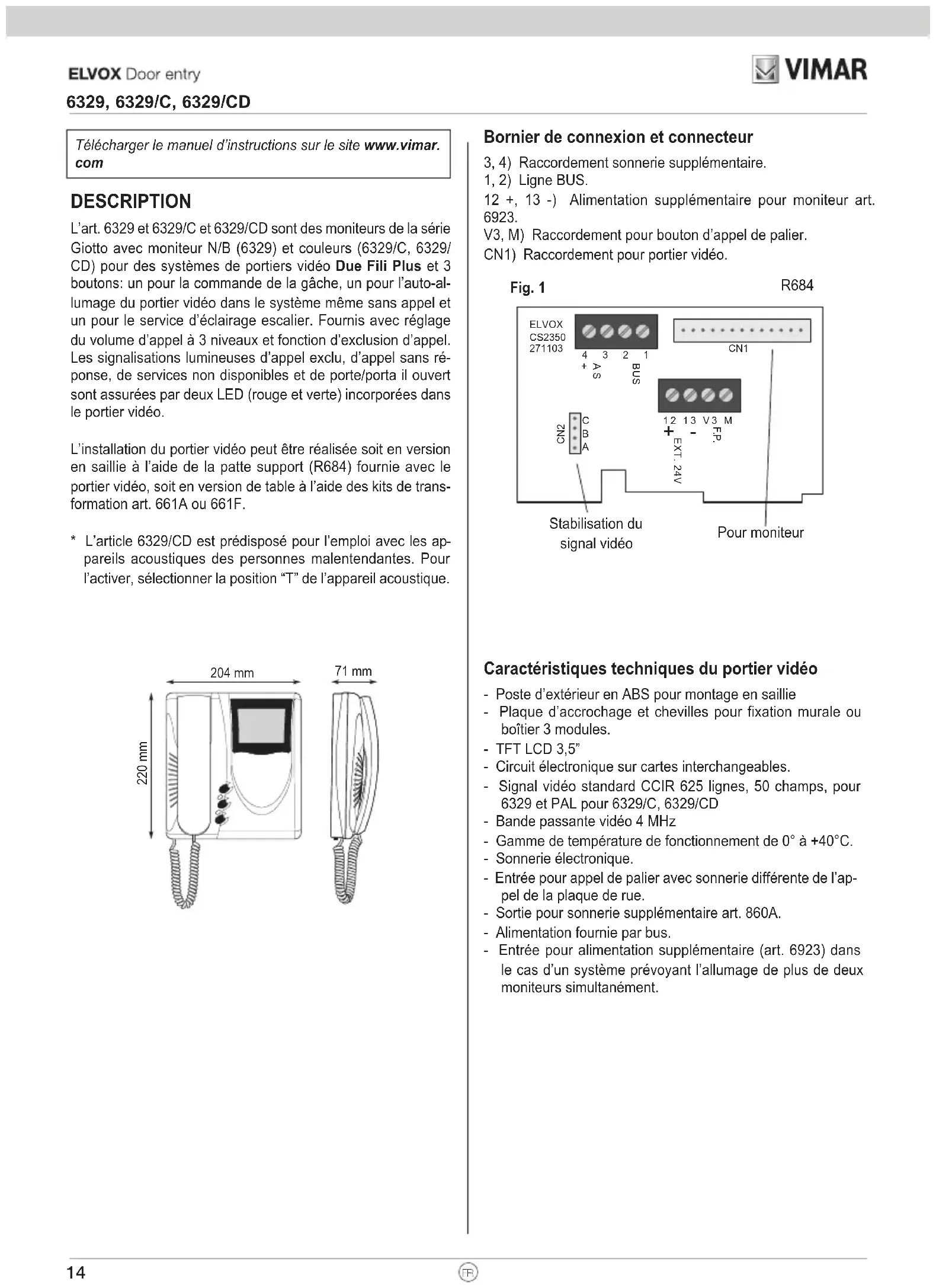 6329, 6329/C, 6329/CDDESCRIPTION L’art. 6329 et 6329/C et 6329/CD sont des moniteurs de la série Giotto avec moniteur N/B (6329) et couleurs (6329/C, 6329/ CD) pour des systèmes de portiers vidéo Due Fili Plus et 3 boutons: un pour la commande de la gâche, un pour l’auto-al- lumage du portier vidéo dans le système même sans appel et un pour le service d’éclairage escalier. Fournis avec réglage du volume d’appel à 3 niveaux et fonction d’exclusion d’appel. Les signalisations lumineuses d’appel exclu, d’appel sans ré- ponse, de services non disponibles et de porte/porta il ouvert sont assurées par deux LED (rouge et verte) incorporées dans le portier vidéo. L’installation du portier vidéo peut être réalisée soit en version en saillie à l’aide de la patte support (R684) fournie avec le portier vidéo, soit en version de table à l’aide des kits de trans- formation art. 661A ou 661F.