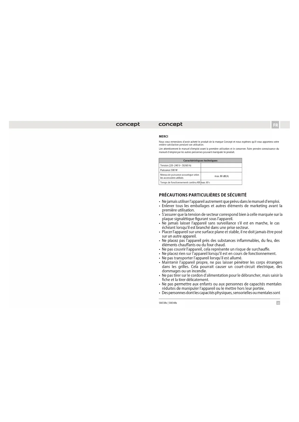 SM338x | SM348x MERCI Nous vous remercions d’avoir acheté le produit de la marque Concept et nous espérons qu’il vous apportera votre entière satisfaction pendant son utilisation. Lire attentivement le manuel d’emploi avant la première utilisation et le conserver. Faire prendre connaissance du manuel d’emploi par les autres personnes pouvant manipuler le produit. Caractéristiques techniques Tension 220–240 V~ 50/60 Hz Puissance 500 W Niveau de puissance acoustique selon les accessoires utilisés max. 80 dB(A) Temps de fonctionnement continu KB max. 60 s PRÉCAUTIONS PARTICULIÈRES DE SÉCURITÉ