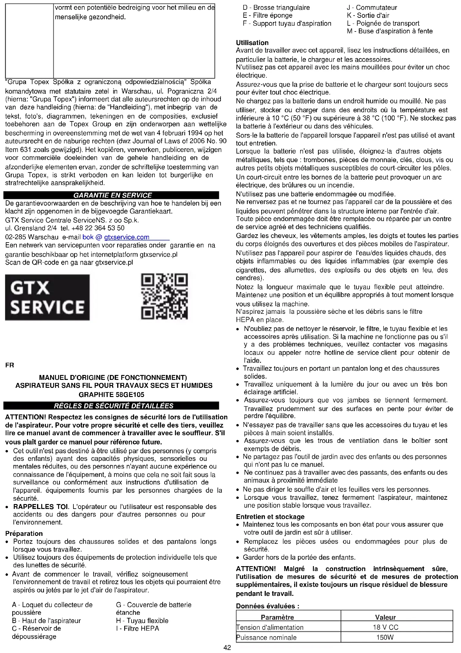 MANUEL D'ORIGINE (DE FONCTIONNEMENT) ASPIRATEUR SANS FIL POUR TRAVAUX SECS ET HUMIDES GRAPHITE 58GE105 RÈGLES DE SÉCURITÉ DÉTAILLÉES ATTENTION! Respectez les consignes de sécurité lors de l'utilisation de l'aspirateur. Pour votre propre sécurité et celle des tiers, veuillez lire ce manuel avant de commencer à travailler avec le souffleur. S'il vous plaît garder ce manuel pour référence future.