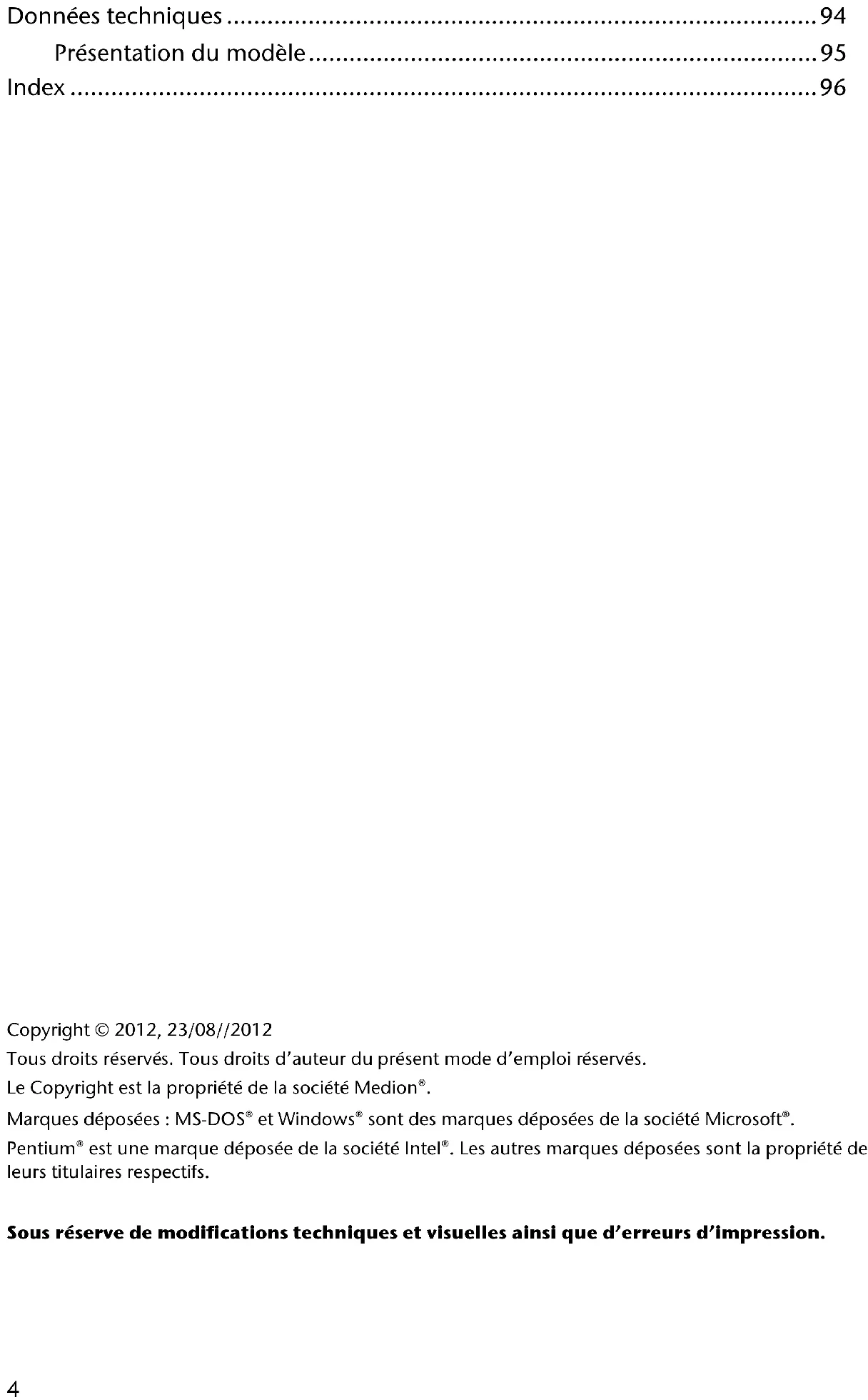 Copyright © 2012, 23/08//2012 Tous droits réservés. Tous droits d’auteur du présent mode d’emploi réservés. Le Copyright est la propriété de la société Medion®. Marques déposées : MS-DOS® et Windows® sont des marques déposées de la société Microsoft®. Pentium® est une marque déposée de la société Intel®. Les autres marques déposées sont la propriété de leurs titulaires respectifs. Sous réserve de modifications techniques et visuelles ainsi que d’erreurs d’impression.5 Identification Pour conserver la preuve de l’origine de votre appareil, notez ici les informations suivantes: Numéro de série .................................................................................... Mot de passe .................................................................................... Aide-mémoire .................................................................................... SuperPIN .................................................................................... UUID .................................................................................... Date d‘achat .................................................................................... Lieu d‘achat .................................................................................... Vous trouverez le numéro de série au dos de votre appareil. Notez également ce numéro sur votre carte de garantie. Introduisez le mot de passe et l‘aide-mémoire via la fonction Security. Le Super PIN et l‘UUID vous sont donnés après l‘activation de la fonction Security. Voir page 26. La qualité Lors du choix des composants, nous avons fait particulièrement attention à la fonctionnalité, la simplicité d’utilisation, la sécurité et la fiabilité. Grâce à un concept matériel et logiciel équilibré, nous pouvons maintenant vous présenter un appareil innovant qui vous procurera beaucoup de plaisir aussi bien dans votre travail que dans vos loisirs. Nous vous remercions de la confiance que vous accordez à notre produit. Le service Dans le cadre de notre service après-vente personnalisé, nous vous soutenons dans votre travail quotidien. Contactez-nous et nous nous ferons un plaisir de vous aider de notre mieux. À la page 61 du présent manuel, vous trouverez le chapitre consacré au service après-vente. Reproduction du présent mode d’emploi Le présent mode d’emploi contient des informations légalement protégées. Tous droits réservés. La reproduction mécanique, électronique ou par n’importe quel autre moyen est interdite sans autorisation écrite du fabricant.6 À propos de ce mode d'emploi Lisez attentivement les consignes de sécurité avant de mettre l'appareil en service. Tenez compte des avertissements figurant sur l'appareil et dans le mode d'emploi. Ayez toujours le mode d'emploi à portée de main. Si vous vendez ou donnez l'appareil, remettez impérativement aussi ce mode d'emplois. Symboles et avertissements utilisés dans ce mode d'emploi DANGER! Avertissement d’un risque vital immédiat ! AVERTISSEMENT! Avertissement d’un risque vital et/ou de blessures graves irréversibles possibles ! PRUDENCE ! Respecter les consignes pour éviter toute blessure et tout dommage matériel ! ATTENTION ! Respecter les consignes pour éviter tout dommage matériel ! REMARQUE ! Information supplémentaire pour l’utilisation de l’appareil ! REMARQUE ! Respecter les consignes du mode d’emploi ! AVERTISSEMENT ! Avertissement d’un risque d’électrocution !7