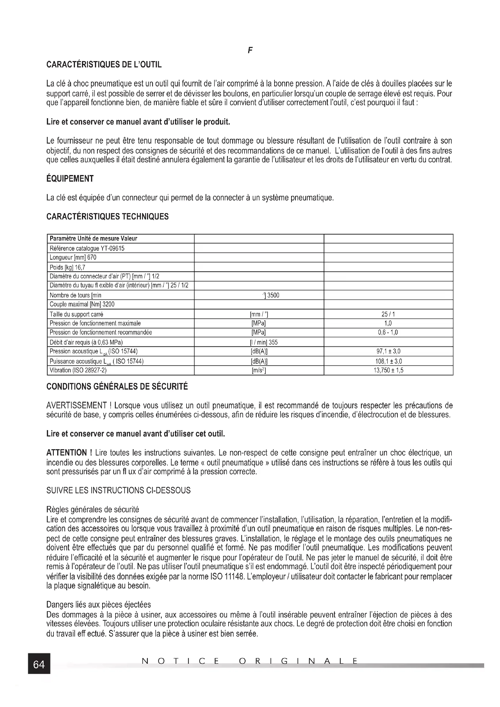Paramètre Unité de mesure Valeur Référence catalogue YT-09615 Longueur [mm] 670 Poids [kg] 16,7 Diamètre du connecteur d’air (PT) [mm / ”] 1/2 Diamètre du tuyau fl exible d’air (intérieur) [mm / ”] 25 / 1/2 Nombre de tours [min