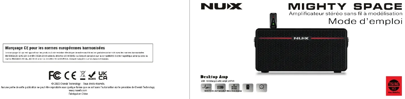 Amplificateur stéréo sans fil à modélisation Mode d’emploi © 2022 Cherub Technology – Tous droits réservés. Aucune partie de cette publication ne peut être reproduite sous quelque forme que ce soit sans l'autorisation écrite préalable de Cherub Technology. www.nuxefx.com Fabriqué en Chine USB : téléchargez votre ampli préféré 54 IR 7 h de jeu 7 presets 9 blocs Drum & Loop Marquage CE pour les normes européennes harmonisées Le marquage CE qui est apposé sur les produits à alimentation électrique de notre société est en parfaite conformité avec les normes harmonisées EN 55032:2012/AC:2013 et EN 55024:2010 selon la directive 2014/30/EU du Conseil européen sur la compatibilité électromagnétique ainsi qu’avec la norme EN 60065:2014+ AC:2016 selon la directive 2014/35/EU du Conseil européen sur les basses tensions.AVERTISSEMENT Pour réduire le risque d'incendie ou de choc électrique, n'exposez pas cet appareil à la pluie ou à l'humidité. ATTENTION Cet appareil est conforme à la section 15 des règles de la FCC. Son fonctionnement est soumis aux deux conditions suivantes : (1) cet appareil ne doit pas causer d'interférences nuisibles, et (2) cet appareil doit accepter toute interférence reçue, y compris les interférences susceptibles d’occasionner un fonctionnement indésirable. Tout changement ou modification apporté sans l’approba- tion expresse de la partie responsable de la conformité peut annuler le droit de l'utilisateur à faire fonctionner cet équipement. NOTE : cet équipement a été testé et jugé conforme aux limites applicables aux appareils numériques de classe B, conformément à la section 15 des règles de la FCC. Ces limites sont conçues pour fournir une protection raisonnable contre les interférences nuisibles dans une installation résidentielle. Cet équipement génère, utilise et peut émettre de l'énergie de fréquence radio et, s'il n'est pas installé et utilisé conformément aux instructions, peut causer des interférences nuisibles aux communications radio. Toute- fois, l'absence d'interférences dans une installation particulière n'est pas garantie. Si cet équipement provoque des interférences nuisibles à la réception de la radio ou de la télévision, ce qui peut être déterminé en l'allumant et en l'éteignant, l'utilisateur est encouragé à essayer de corriger les interférences en prenant une ou plusieurs des mesures suivantes : - Réorienter ou déplacer l'antenne de réception. - Écarter l'équipement du récepteur. - Brancher l'équipement à une prise d'un autre circuit que celui auquel le récepteur est connecté. - Consulter le revendeur ou un technicien radio/TV expérimenté pour obtenir de l'aide. L'appareil a été évalué comme répondant aux exigences générales d'exposition aux radiofréquences. L'appareil peut être utilisé sans restriction dans les conditions d'exposition d’une utilisation portable. Le symbole d’éclair dans un triangle signifie « Risque de choc électrique ! ». Il indique la présence d'informations sur la tension de fonctionnement et les risques poten- tiels d’électrocution. Le point d'exclamation dans un triangle signifie « Atten- tion ! ». Veuillez lire les informations figurant à côté de tous ces signes d'avertissement.Présentation Présentation Merci d'avoir acheté le NUX MIGHTY SPACE. Depuis que nous avons présenté le MIGHTY LITE BT et le MIGHTY AIR, ces petits amplifica- teurs à modélisation sont devenus emblématiques de NUX. Aujourd'hui, le MIGHTY SPACE en est le fleuron qui vous apporte encore plus de plaisir et de bonnes vibrations. Le MIGHTY SPACE offre une variété d'effets pour la guitare et la basse électriques, dont une modélisation d'ampli et des réponses impulsionnelles (« IR ») de baffle. Il est également doté d'une modéli- sation d'ampli acoustique et de réponses impulsionnelles acous- tiques pour vous permettre de simuler le son d'une guitare acous- tique. Désormais, vous pouvez même enrichir votre palette de sons en chargeant des IR d'autres fournisseurs avec le logiciel d'édition Mighty Editor™. (Vous pouvez charger n'importe quelle IR au format WAV, Mighty Editor™ la convertira automatiquement en 32 bit/ 48 kHz pour l'appareil.) Note : il y a 34 IR par défaut, et 20 mémoires pour vos IR person- nelles (de 35 à 54). Vous pouvez personnaliser les presets avec l'appli Mighty Amp™ (mobile) ou le logiciel d'édition Mighty Editor™ (PC). Changer l'ordre des blocs d'effet ? Pourquoi pas ? Vous pouvez faire beaucoup de choses avec l'interface intuitive, essayez-la et découvrez toute sa polyvalence et sa puissance ! L'appli Mighty Amp™ et le logiciel d'édition Mighty Editor™ vous permettent de régler tous les blocs de signaux et leurs paramètres. Le MIGHTY SPACE propose des blocs de réduction de bruit (GATE), de compres- sion (COMP), d'effet (EFX), d'ampli (AMP), de réponse impulsionnelle (IR), d'égaliseur (EQ), de modulation (MOD), de délai (DLY) et de réverbération (RVB), dont vous pouvez librement changer l'ordre. Outre les 34 IR intégrées, il existe 20 mémoires vides pour charger des IR de tierces parties. Pas besoin de se soucier de la fréquence d'échantillonnage, le logiciel d'édition Mighty Editor™ peut automatiquement convertir le format WAV (IR). Le MIGHTY SPACE prend en charge le flux audio USB et peut servir d'interface d'enregistrement USB. Il assure le routage Normal / Dry Out (sortie du son non traité) / Re-amp (réamplification) / Loopback (renvoi), que vous pouvez régler de manière intuitive avec l'appli Mighty Amp™ ou le logiciel d'édition Mighty Editor™, sans avoir besoin de configurer la sortie USB dans le logiciel DAW. Et même le streaming live d'une session avec le renvoi (Loopback) ! *Tous les noms de marque et de modèle mentionnés dans cette page sont des marques de commerce de leurs propriétaires respectifs, qui ne sont en aucun cas associés ou