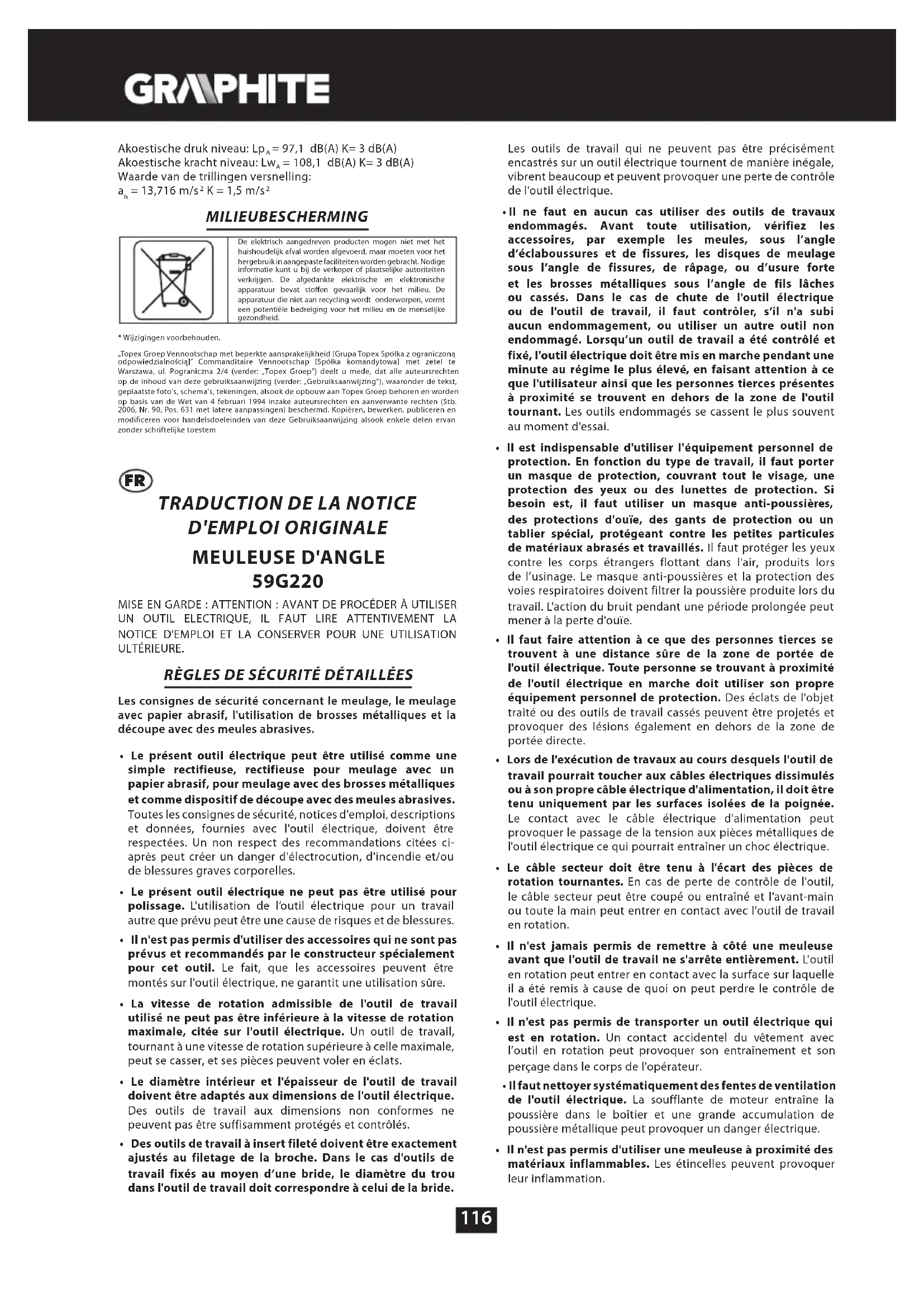 D'EMPLOI ORIGINALE MEULEUSE D'ANGLE 59G220 MISE EN GARDE : ATTENTION : AVANT DE PROCÉDER À UTILISER UN OUTIL ELECTRIQUE, IL FAUT LIRE ATTENTIVEMENT LA NOTICE D'EMPLOI ET LA CONSERVER POUR UNE UTILISATION ULTÉRIEURE. RÈGLES DE SÉCURITÉ DÉTAILLÉES Les consignes de sécurité concernant le meulage, le meulage avec papier abrasif, l'utilisation de brosses métalliques et la découpe avec des meules abrasives.