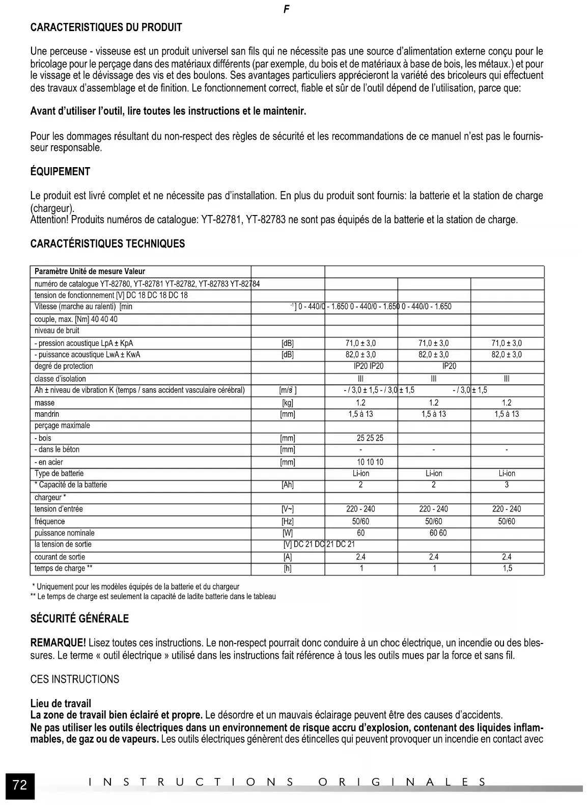 Une perceuse - visseuse est un produit universel san fils qui ne nécessite pas une source d’alimentation externe conçu pour le bricolage pour le perçage dans des matériaux différents (par exemple, du bois et de matériaux à base de bois, les métaux.) et pour le vissage et le dévissage des vis et des boulons. Ses avantages particuliers apprécieront la variété des bricoleurs qui effectuent des travaux d’assemblage et de finition. Le fonctionnement correct, fiable et sûr de l’outil dépend de l’utilisation, parce que: Avant d’utiliser l’outil, lire toutes les instructions et le maintenir. Pour les dommages résultant du non-respect des règles de sécurité et les recommandations de ce manuel n’est pas le fournis- seur responsable. ÉQUIPEMENT Le produit est livré complet et ne nécessite pas d’installation. En plus du produit sont fournis: la batterie et la station de charge (chargeur). Attention! Produits numéros de catalogue: YT-82781, YT-82783 ne sont pas équipés de la batterie et la station de charge.
