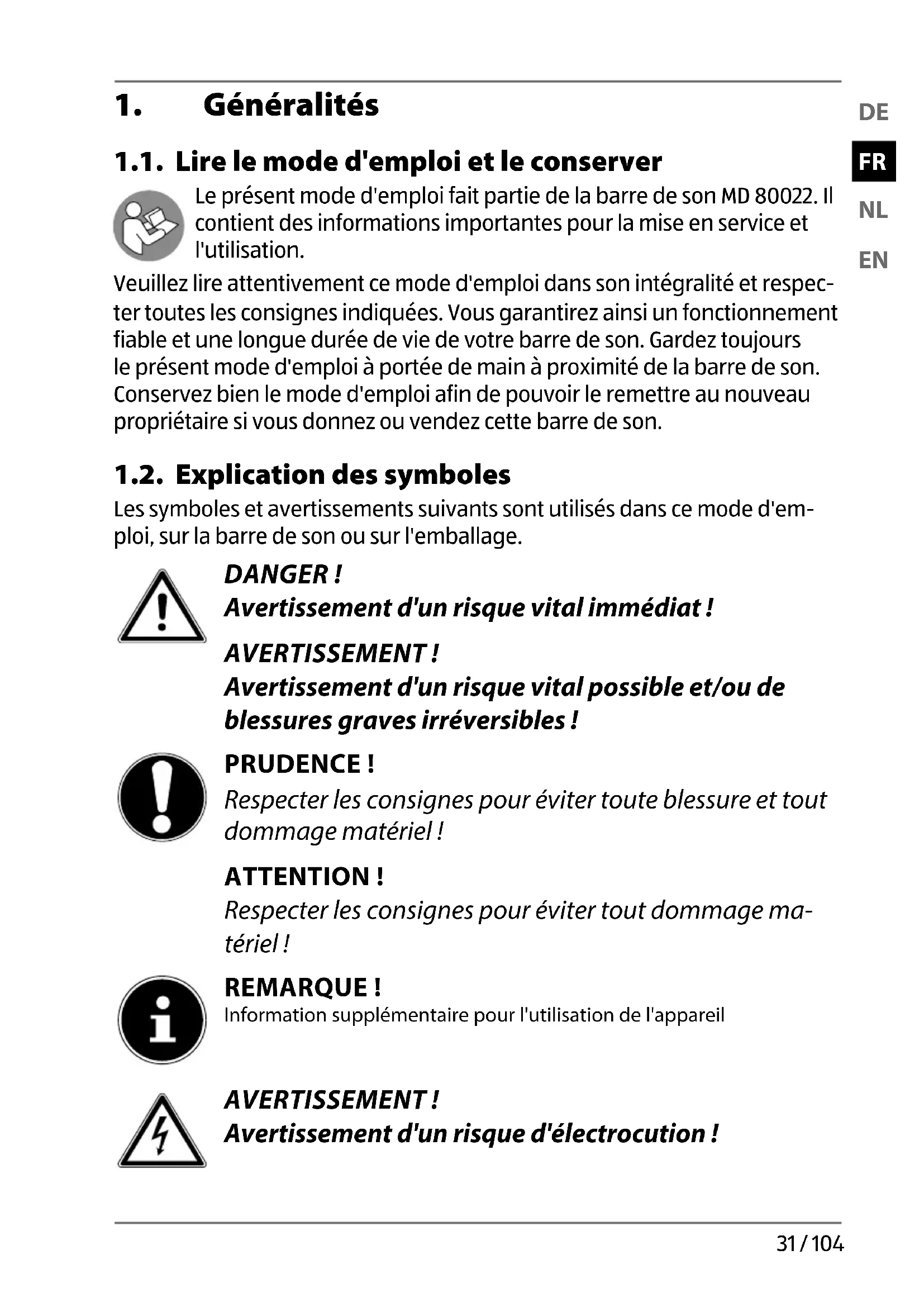 30 / 104 80022 DE-FR-NL-EN eCommerce Content RC1.indb 3080022 DE-FR-NL-EN eCommerce Content RC1.indb 30 31.07.2015 08:49:1131.07.2015 08:49:111. Généralités 1.1. Lire le mode d'emploi et le conserver Le présent mode d'emploi fait partie de la barre de son MD 80022. Il contient des informations importantes pour la mise en service et l'utilisation. Veuillez lire attentivement ce mode d'emploi dans son intégralité et respec- ter toutes les consignes indiquées. Vous garantirez ainsi un fonctionnement fiable et une longue durée de vie de votre barre de son. Gardez toujours le présent mode d'emploi à portée de main à proximité de la barre de son. Conservez bien le mode d'emploi afin de pouvoir le remettre au nouveau propriétaire si vous donnez ou vendez cette barre de son. 1.2. Explication des symboles Les symboles et avertissements suivants sont utilisés dans ce mode d'em- ploi, sur la barre de son ou sur l'emballage. DANGER! Avertissement d'un risque vital immédiat ! AVERTISSEMENT ! Avertissement d'un risque vital possible et/ou de blessures graves irréversibles ! PRUDENCE! Respecter les consignes pour éviter toute blessure et tout dommage matériel ! ATTENTION! Respecter les consignes pour éviter tout dommage ma- tériel ! REMARQUE! Information supplémentaire pour l'utilisation de l'appareil AVERTISSEMENT ! Avertissement d'un risque d'électrocution !