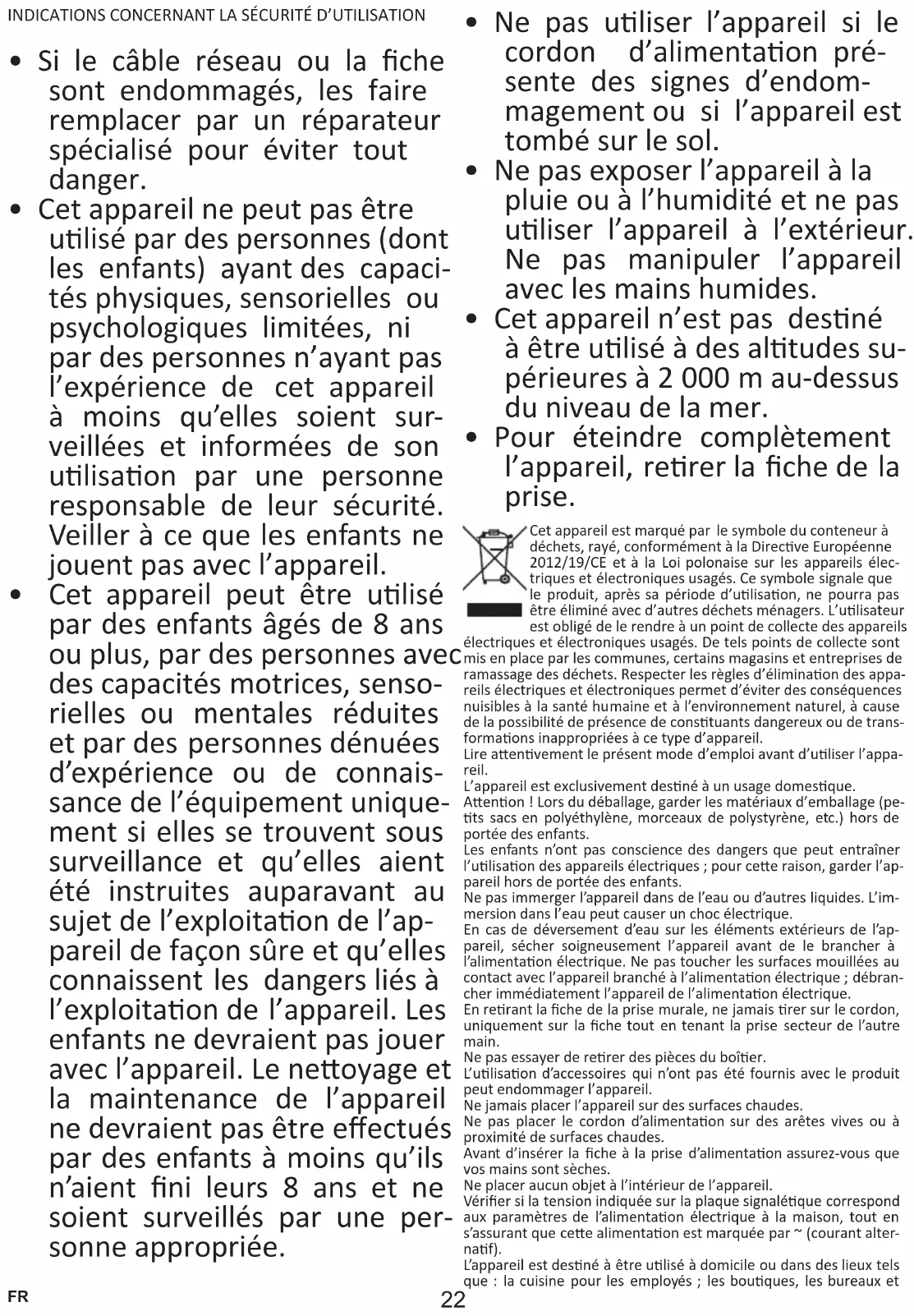 - Pour éteindre complètement l’appareil, rerer la che de la prise. Cet appareil est marqué par le symbole du conteneur à déchets, rayé, conformément à la Direcve Européenne 2012/19/CE et à la Loi polonaise sur les appareils élec- triques et électroniques usagés. Ce symbole signale que le produit, après sa période d’ulisaon, ne pourra pas être éliminé avec d’autres déchets ménagers. L’ulisateur est obligé de le rendre à un point de collecte des appareils électriques et électroniques usagés. De tels points de collecte sont mis en place par les communes, certains magasins et entreprises de ramassage des déchets. Respecter les règles d’éliminaon des appa- reils électriques et électroniques permet d’éviter des conséquences nuisibles à la santé humaine et à l’environnement naturel, à cause de la possibilité de présence de constuants dangereux ou de trans- formaons inappropriées à ce type d’appareil. Lire aenvement le présent mode d’emploi avant d’uliser l’appa- reil. L’appareil est exclusivement desné à un usage domesque. Aenon ! Lors du déballage, garder les matériaux d’emballage (pe- ts sacs en polyéthylène, morceaux de polystyrène, etc.) hors de portée des enfants. Les enfants n’ont pas conscience des dangers que peut entraîner l’ulisaon des appareils électriques ; pour cee raison, garder l’ap- pareil hors de portée des enfants. Ne pas immerger l’appareil dans de l’eau ou d’autres liquides. L’im- mersion dans l’eau peut causer un choc électrique. En cas de déversement d’eau sur les éléments extérieurs de l’ap- pareil, sécher soigneusement l’appareil avant de le brancher à l’alimentaon électrique. Ne pas toucher les surfaces mouillées au contact avec l’appareil branché à l’alimentaon électrique ; débran- cher immédiatement l’appareil de l’alimentaon électrique. En rerant la che de la prise murale, ne jamais rer sur le cordon, uniquement sur la che tout en tenant la prise secteur de l’autre main. Ne pas essayer de rerer des pièces du boîer. L’ulisaon d’accessoires qui n’ont pas été fournis avec le produit peut endommager l’appareil. Ne jamais placer l’appareil sur des surfaces chaudes. Ne pas placer le cordon d’alimentaon sur des arêtes vives ou à proximité de surfaces chaudes. Avant d’insérer la che à la prise d’alimentaon assurezvous que vos mains sont sèches. Ne placer aucun objet à l’intérieur de l’appareil. Vérier si la tension indiquée sur la plaque signaléque correspond aux paramètres de l’alimentaon électrique à la maison, tout en s’assurant que cee alimentaon est marquée par ~ (courant alter- naf). L’appareil est desné à être ulisé à domicile ou dans des lieux tels que : la cuisine pour les employés ; les bouques, les bureaux et23