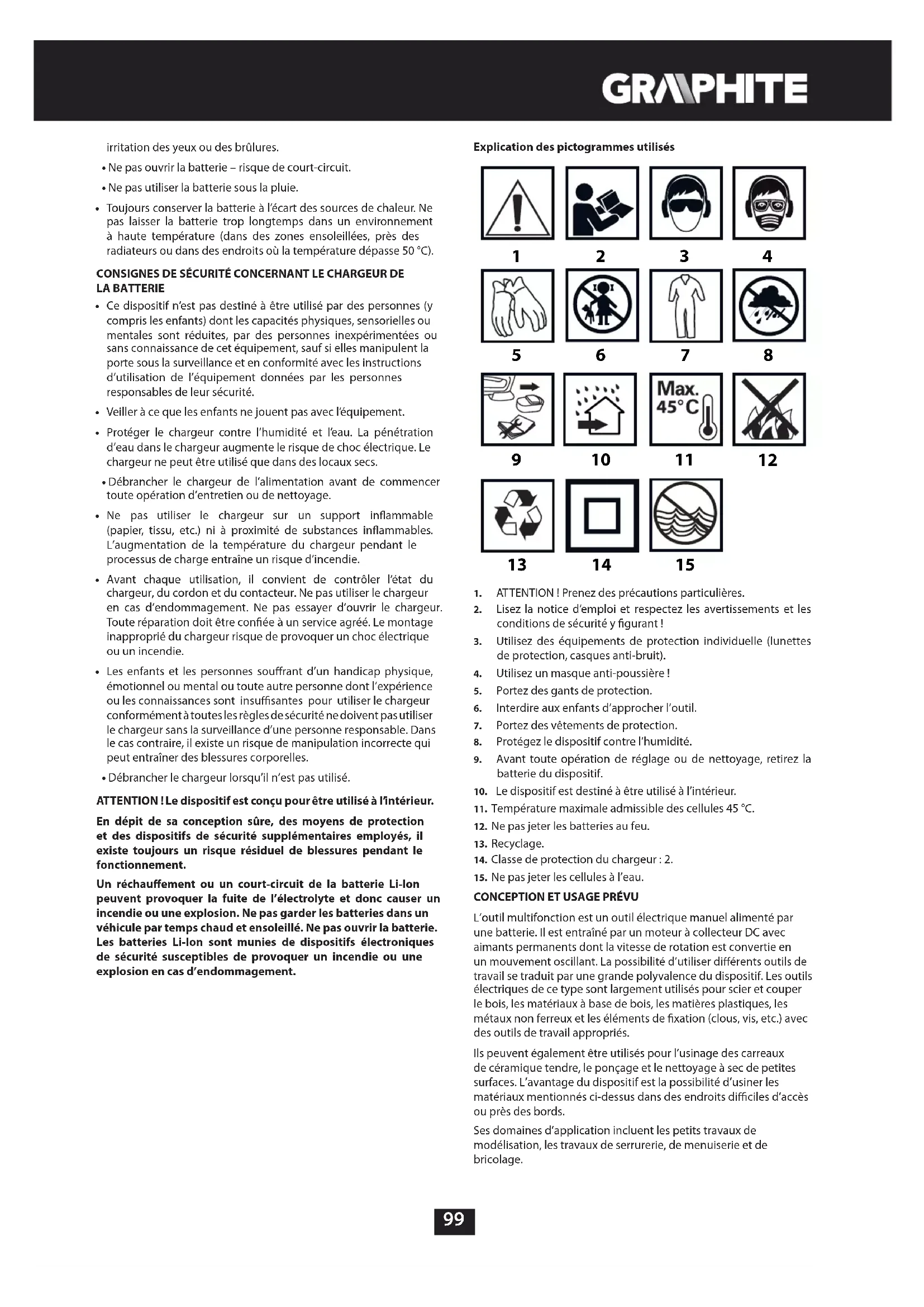 - Débrancher le chargeur lorsqu’il n’est pas utilisé. ATTENTION ! Le dispositif est conçu pour être utilisé à l’intérieur. En dépit de sa conception sûre, des moyens de protection et des dispositifs de sécurité supplémentaires employés, il existe toujours un risque résiduel de blessures pendant le fonctionnement. Un réchauement ou un court-circuit de la batterie Li-Ion peuvent provoquer la fuite de l’électrolyte et donc causer un incendie ou une explosion. Ne pas garder les batteries dans un véhicule par temps chaud et ensoleillé. Ne pas ouvrir la batterie. Les batteries Li-Ion sont munies de dispositifs électroniques de sécurité susceptibles de provoquer un incendie ou une explosion en cas d’endommagement. Explication des pictogrammes utilisés