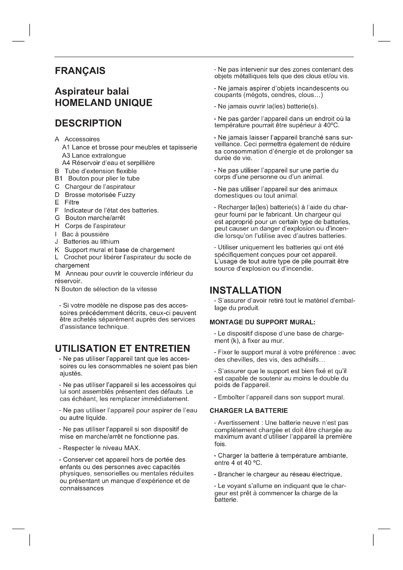 FOLLOWS: - Remove the upper casing of the appliance, the part located above the handle. To remove the casing, it is necessary to lever the lower part to release the tabs that x it. (Fig.7). - Identify the battery and cut the 4 cables connected to the battery. In order to avoid short-circuit risks, protect its conductive part with insulating tape. (Fig.8). - Safely remove the battery from its housing.FRANÇAIS Aspirateur balai HOMELAND UNIQUE DESCRIPTION A Accessoires A1 Lance et brosse pour meubles et tapisserie A3 Lance extralongue A4 Réservoir d’eau et serpillière B Tube d’extension exible B1 Bouton pour plier le tube C Chargeur de l’aspirateur D Brosse motorisée Fuzzy E Filtre F Indicateur de l’état des batteries. G Bouton marche/arrêt H Corps de l’aspirateur I Bac à poussière J Batteries au lithium K Support mural et base de chargement L Crochet pour libérer l’aspirateur du socle de chargement M Anneau pour ouvrir le couvercle inférieur du réservoir. N Bouton de sélection de la vitesse - Si votre modèle ne dispose pas des acces- soires précédemment décrits, ceux-ci peuvent être achetés séparément auprès des services d’assistance technique.